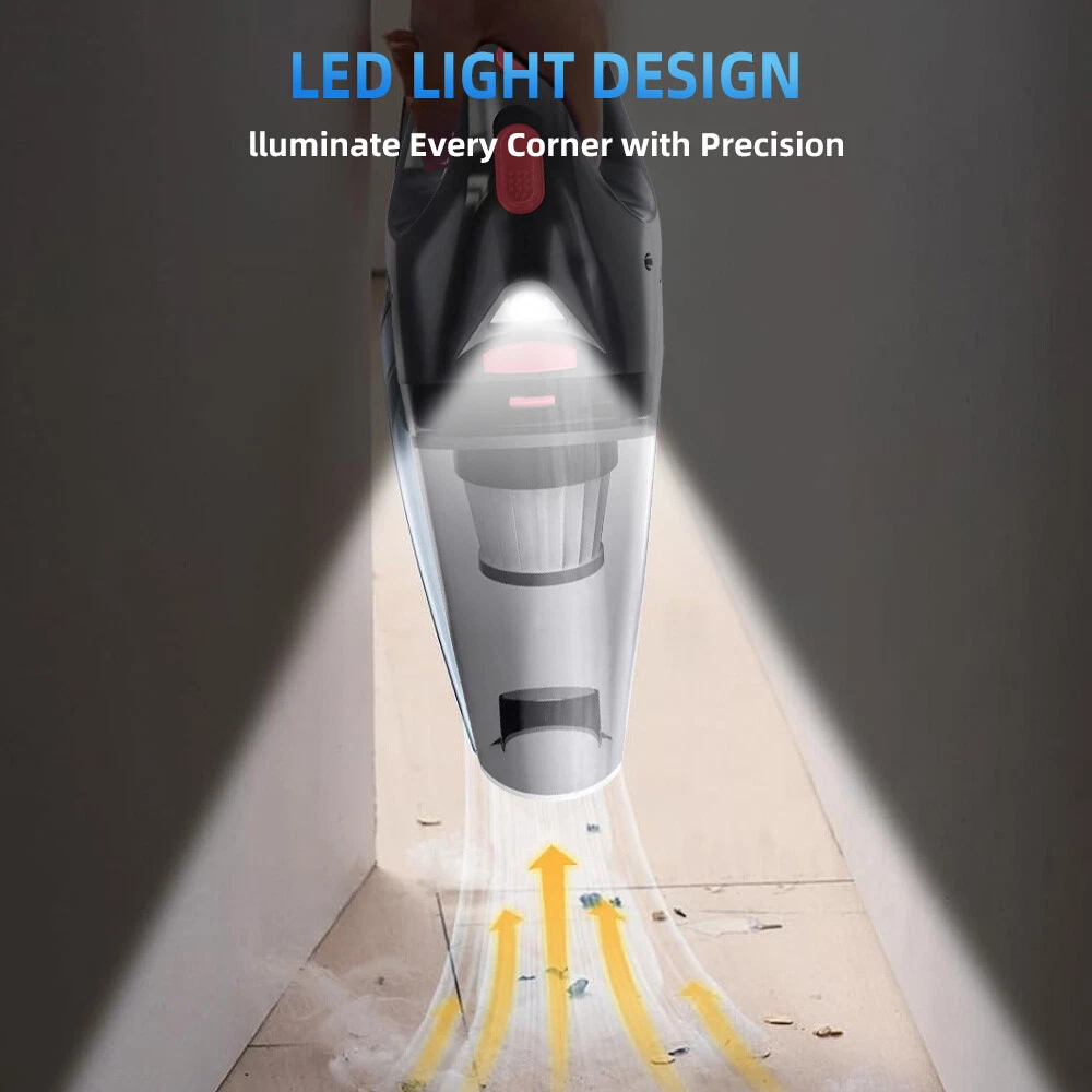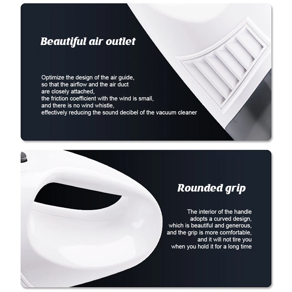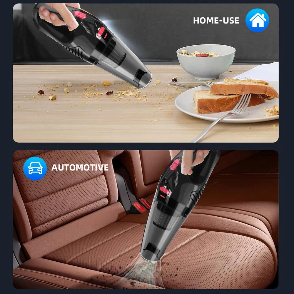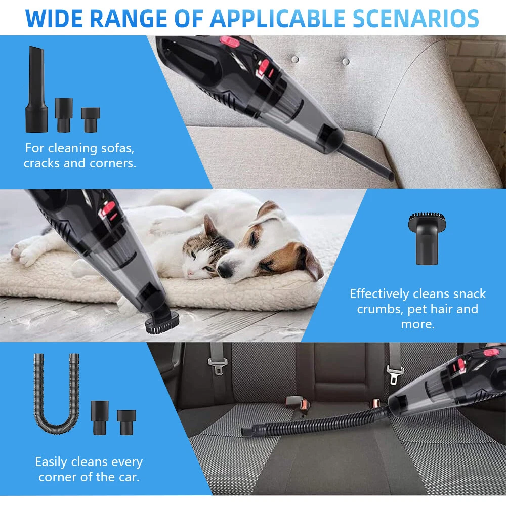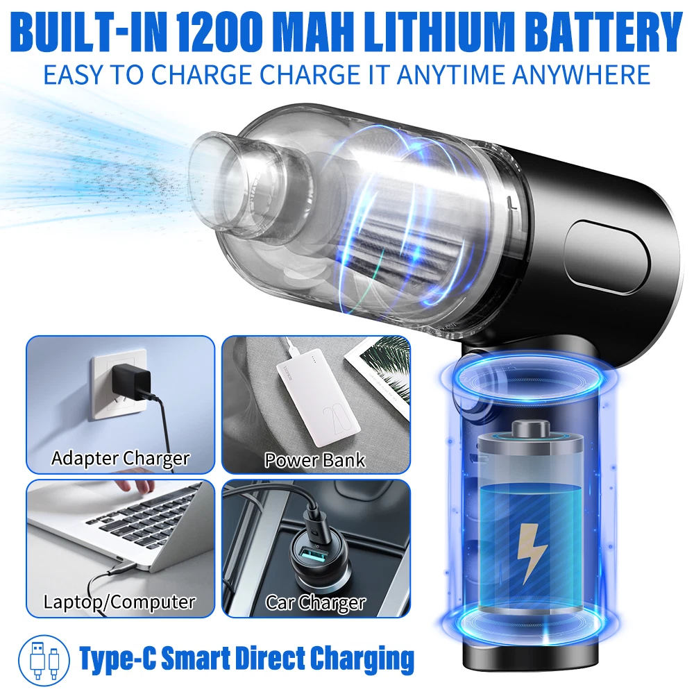 A:120W 4000mAh With LED Vacuum Cleaner Fe ature : 【5500PA POWERFUL SUCTION VACUUM CLEA NER】 : This super powerful handheld vacuum is equipped with a high-speed brushless motor with a steady output of 120W, this handheld hoover has a suction power of up to 5500PA, which easily removes pet hair, dust, crumbs, and confetti from your home, car, and office. 【2 IN 1 SUCTIONS HEAD HANDHELD VACUUM】 :This mini hoover of ours comes with a crevice nozzle, an extended hose and a cleaning brush, . The crevice nozzle effectively removes dust and dirt from narrow crevices and tight spaces. The brush nozzle is designed to remove hair from carpets, sofas or dust from keyboards. And with a long hose with connector can be extended for flexible cleaning of hard-to-reach places, ensuring that every corner is thoroughly cleaned. 【LONG LASTING & FAST CHARGING】 :This large capacity car hoover uses large capacity rechargeable lithium batteries, single battery capacity of 2000 mah, dual capacity of 4000mah, more durable, full charge can last 20-30 minutes, and with fast charging technology, full charge in just 3-4 hours 【Efficient Filtration System】 The handheld vacuum cordless cleaner provides one mini brush and two washable HEPA filters to extend the product's lifespan.(Note:Cleaned filters must be well dried before re-installation) 【Compact and Portable】 The portable car vacuum cleaner is designed to be lightweight, weighing only 1.15lbs, and can be operated with one hand.It is compatible with all cars, trucks, vans and SUVs. 【Ideal for Travel Essentials】 Car vacuum makes you clean the interior of your car anytime,which gives you a nice and comfortable experience on long trips. Specifi cation : Material: ABS Battery: built-in 2000 * 2 mAh lithium battery Power:120W Charging: DC port charging Speed:39000-45000rpm Features: wireless, small size portable, can suck can blow Rated power: 12 0W Rated frequency: 65w (HZ) Rated voltage:≤36V(V) Suction power: 55 00Pa Packag e list: Nozzle*5 Charging Cable*1 H ost *1 English manual *1 Filter *2 Cleaning Brush*1 Storage bag *1 =========================================== B:120W 2200mAh Vacuum Cleaner Details: Power Mode: USB Charging Operating Voltage: 100V-240V rated power:120W Included Components: Accessory Kit Body Material: Plastic Filter Type: Cartridge special nozzle type: Flat-billed bird Dust cup volume: <0.1L Battery Properties: Rechargeable Battery Package content: 1x 120W Car Vacuum Cleaner with 3.28ft Power Cord. 1x Brush Mouth. 1x Long Mouth. 1x Soft Long Tube. 1x User Manual. ====================================== C:120W 3000mAh Vacuum Cleaner Features: 6000Pa strong suction power, with rotating speed up to 39 000rpm. Dry wet amphibious & Strong suction. Easy to vacuum dust, debris, hair, liquid, paper... etc. D ifferent vacuum nozzles to work on any desired area. Portable, light-weight, easy to store and carry. USB charging, convenient and fast. Specifications: [product name]: hand held vehicle vacuum cleaner [product color]: black Vacuum degree: about 6 000kpa Rated power: 120W Product noise: less than 70db Rated voltage: 7.4V Product battery: built -in 1500 mAh*2 lithium battery Rating speed: 39000 (R/min) Packa ge Included: 1 x Cleaner 1 x Brush nozzle 1 x extension hose 1 brush head 1 x User Manual ============================================ D:120W 1200mAh Vacuum Cleaner S pecificatio ns : Material:ABS Battery: Built-i n 1200 mAh lithium battery Power:120W Charging: Type-C intelligent direct charging Relevant export certificates: fcc, ce Product Rotation: 39000-45000 rpm Rated power: 60W Rated frequency: 65w (HZ) Rated voltage: ≤ 36V (V) Product suction power: 5500Pa Advantageous features: wireless, small size portable, can suck can blow. Main scope of application: small cars vans SUVs SUVs homes offices dormitories, etc. Package included: 1 X long flat nozzle 1 X brush nozzle 1 X charging cable 1 X tail nozzle 1 X host 1 X English manual 1 X filter
