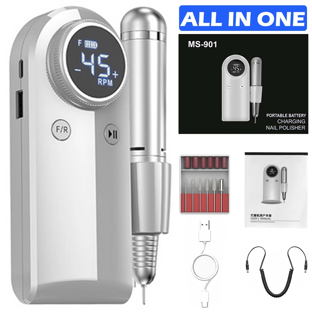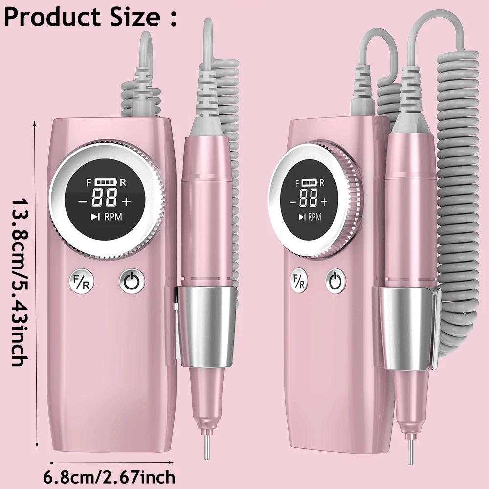 Features : 1. Rechargeable & Portable: The nail drill built in 2600mAH battery. After about 2 h charged, this electric file can use without plugging in the outlet and lasts 8-10 hour operation time. With its compact size and light weight, it can be easily to carry, convenient for you to use it anytime, anywhere. Portable clips at the rear of the body, can be hung in a belt or placed in a bag or box. 2. Adjustable speed and LED Screen : 0-45000RPM high speed and you can control the speed by a rotary switch on the top of machine. The LCD display can clearly show you the speed and the power status. 3. Low heat/vibration/noise handpiece: The special material and ample ventilation holes design enable it to have excellent heat dissipation function. Good quality makes it extremely quiet and smooth with slight vibration when doing nail care. 4. Multi-function and F/R direction : Electric Nail Drill Machine comes with 6pcs interchangeable nail drill bits (3/32”) for easily grinding, carving, cutting, polishing, removing gel polish and cuticles for both nails and natural nails. And the design with Forward and Reverse rotation directions are suitable for right hand or left hand use. 5. All-in-one Pack: comes with a plastic holder to for the handpiece, has a cradle to secure the handpiece from falling off the desk during operation; 6 drill bits, 6 sanding bands; Technical Specification : Color: Cl a ssic Gold / Classic Green/ Pearl White Dimension: 5.5 * 2.8 * 0.98 inch Rotary Speed: 0~45,000 RPM Power: 18W Charge Time: 1 Hours Working Time: 15 Hours Battery Capacity: 4000mAH Input Voltage Range: AC 100-240V/50-60(Hz) Output Voltage: DC 15V/2A Package Includes : 1 x Portable Nail Drill Machine 1 x Handpiece 1 x USB Charger 6 x Drill Bits 6 x Sanding bands 1 x User Manual