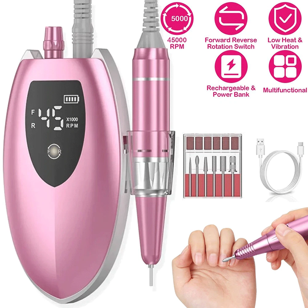 Specifications: ❥Item: Rechargeable 45000 RPM Electric Nail File Nail Gel Polisher Nail Drill Machine ❥Material: Aluminium Alloy+ABS ❥Rechargeable Adaptor Input: 110/220-240V 50~60Hz ❥Speed(RPM): 0~45000RPM ❥Battery Capacity: 4000mA ❥Power: 35W Nail Drill ❥Charging Time: 40 Mins ❥Use Time: 8 H ❥Charging Port: USB Recharge ❥Grinder Type : Suitable for 3/32 "drill bits ❥Grinding Head: 6 types of grinding heads ❥Product Size: 5.6 x 4 x 9.5 Inch( Include Line) ❥Item Weight: Approx 480g Package Includes : 1 x Portable Nail Drill Machine 1 x Handpiece 1 x USB Charger 6 x Drill Bits 6 x Sanding bands 1 x User Manual Feature : ❥❥Powerful and adjustable speed/direction, 6 different metal drill bits, high speed up to 45000 RPM.Low heat, low noise, ultra-low vibration.Powerful smoothing for natural acrylic nails, gel polish dip powder nails, and exfoliation of dead skin and calluses. Professional home and salon use, carving, carving, routing, grinding, sanding, sanding, cutting, polishing, drilling, great for nail polish. ❥❥High-definition LCD display, long battery life & power bank, large-capacity battery with brush less motor, prolonging more use time, this electronic nail machine can last for 8 hours after being fully charged for 40 min . Once charged, you can also use it as a power bank when your phone needs to be turned off. The high-definition LCD display on the rig shows the speed and remaining battery power, which is convenient for you to adjust the speed and reminds you to charge. ❥❥Portable and lightweight design, you can easily take it in your bag. The rig comes with a hook so you can hang it on your clothing, or put it in your pocket or bag. The rig also has a pen holder for easy working in different environments. ❥❥All-aluminum pen, easy to use, high-quality aluminum alloy long-life handle design, matte design can avoid all fingerprints, low noise, low vibration, low temperature operation, safe and reliable.Can be switched left or right, right or left handed. Variable speed control, suitable for different use requirements. Improved wireless smooth operation handle with flexible extension. Rotary lock blocks are used to secure the bit and quickly release the bit. ❥❥The multi-functional manicure drill kit has a wide range of uses, DIY family salon gifts, convenient and elegant gift packaging, and stores various accessories. This is an excellent choice that you must have. Great for holiday gifts. Both professionals and amateurs.