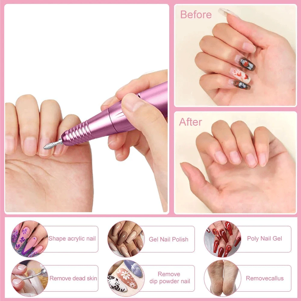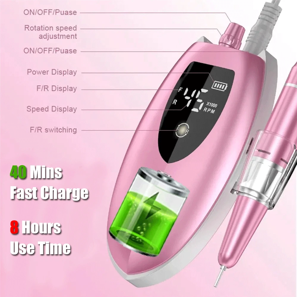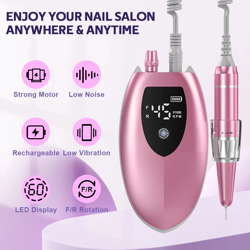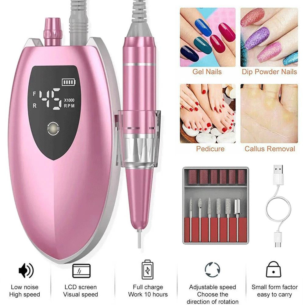 Specifications: Item: Rechargeable 45000 RPM Electric Nail File Nail Gel Polisher Nail Drill Machine Material: Aluminium Alloy+ABS Rechargeable Adaptor Input: 110/220-240V 50~60Hz Speed(RPM): 0~45000RPM Battery Capacity: 4000mA Power: 35W Nail Drill Charging Time: 40 Mins Use Time: 8 H Charging Port: USB Recharge Grinder Type : Suitable for 3/32 "drill bits Grinding Head: 6 types of grinding heads Product Size: about 5.6 x 4 x 9.5 Inch( Include Line) Item Weight: Approx 480g Package Includes : 1 x Portable Nail Drill Machine 1 x Handpiece 1 x USB Charger 6 x Drill Bits 6 x Sanding bands 1 x User Manual Feature : Powerful and adjustable speed/direction, 6 different metal drill bits, high speed up to 45000 RPM.Low heat, low noise, ultra-low vibration.Powerful smoothing for natural acrylic nails, gel polish dip powder nails, and exfoliation of dead skin and calluses. Professional home and salon use, carving, carving, routing, grinding, sanding, sanding, cutting, polishing, drilling, great for nail polish. High-definition LCD display, long battery life & power bank, large-capacity battery with brush less motor, prolonging more use time, this electronic nail machine can last for 8 hours after being fully charged for 40 min . Once charged, you can also use it as a power bank when your phone needs to be turned off. The high-definition LCD display on the rig shows the speed and remaining battery power, which is convenient for you to adjust the speed and reminds you to charge. Portable and lightweight design, you can easily take it in your bag. The rig comes with a hook so you can hang it on your clothing, or put it in your pocket or bag. The rig also has a pen holder for easy working in different environments. All-aluminum pen, easy to use, high-quality aluminum alloy long-life handle design, matte design can avoid all fingerprints, low noise, low vibration, low temperature operation, safe and reliable.Can be switched left or right, right or left handed. Variable speed control, suitable for different use requirements. Improved wireless smooth operation handle with flexible extension. Rotary lock blocks are used to secure the bit and quickly release the bit. The multi-functional manicure drill kit has a wide range of uses, DIY family salon gifts, convenient and elegant gift packaging, and stores various accessories. This is an excellent choice that you must have. Great for holiday gifts. Both professionals and amateurs. If you have any questions, please feel free to contact us, please do not leave any negative feedback, we will deal with it as soon as possible, thank you On Nov 10, 2024 at 20:23:42 PST, seller added the following information: