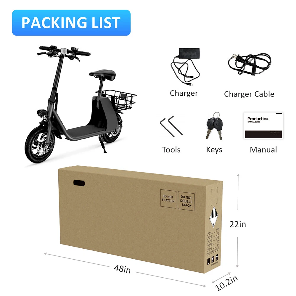 Electric Scooter Adults 12'' 450W 8Ah 18 Mph E-City Bike & E-Scooter with Basket 🚴♂✅ Free and fast delivery within 4-5 working days and excellent after-sales service: Our bicycles have multiple branches across the country. After you successfully place an order and make payment, we will arrange for our staff to pack your package as soon as possible. If you place an order before 4pm on the same day, we will arrange for shipment on the same day. If you place an order after 4pm on the same day, your package will be packed and sent to the courier the next day. The shipping cost is completely free, so please rest assured to place your order. HEZZO C2 12.5" Foldable Electric Scooter 450W Dual Motor 8Ah 36V 15-20 Miles 20Mph Feature: Powerful and Reliable: The Hezzo C2 Electric Scooter boasts a 36V 8Ah Lithium Battery and high-performance Brushless 350W Dual Motors, delivering a powerful and reliable ride for adventurous adults. Enhanced Stability: With front and rear suspension and 12.5-inch off-road tires, this e-scooter offers enhanced stability and control, allowing riders to confidently tackle various terrains with ease. Durable Construction: Made from reinforced iron and aluminum alloy, this scooter is built to withstand daily use and rough conditions, ensuring long-lasting durability and reliability. Convenient Foldable Design: The Hezzo C2 Electric Scooter features a foldable design for easy storage and transport, perfect for commuters and outdoor enthusiasts looking for convenience. Versatile Performance: Suitable for riders up to 150 kgs, this electric scooter provides a versatile and thrilling riding experience, making it an ideal choice for those seeking a blend of performance, durability, and convenience. Care & Warranty Please be sure to charge your scooter fully before first usage. Don’t skip this as it’s important and prolongs the life and capacity of your battery.When using e-scooter - please take extra care and wear some protective gear. It is not a toy.If the product faulty when you first receive it - please coontact us straight away so it can be looked into. The product comes with 1 year warranty. If it's factory fault - We will send a part to change it yourself. Or you may want to post to US based after sales point if the repair is too dificult. If you damage caused by yourself (not manufacturers fault) - you can still purchase the parts from HEZZO to repair your scooter. Contact us We can be contacted at any time through eBay messages if you have any questions, comments or product requests. We will respond to you within 24 hours and do our best to help you out! We encourage our customers to contact us with any questions or concerns. We'd like to be sure you are completely satisfied with your purchase. If for any reason you're not 100% happy - please contact to discuss the matter. Returns 30-day "change of mind" return policy from the day you receive the goods. If for any reason no longer want the item - you can send the item back at your own expence for a refund. Requirement for returning the item: the good must be unused, unopened, undamaged. 14-day return policy for items that are faulty - replacement or refund will be issued only after the goods comes back and get inspected. If you request a return while meeting the above requirements, please contact me first. I will provide you with a return address or a mailing label. Specification Brand: Hezzo Type: Electric Scooter Model: C2 Color: Black,Blue,Red,Yellow Suspension: Front + Rear Dual Suspension Max Range per Charge: 15-20Miles Speed: 18 MPH Battery: 36 V 8 Ah Max Load: 15 0KG motor-assisted: 36 V 450W (Peak 680W) Tire: 12.5 inches tires Charging Time: 4-5 H Warranty: One Year Frame Material:Steel Alloy Weight:41 Ibs Mas load:265 Ibs Size:1214*537*925mm Package:1220*260*560mm Package including: 1 x Electric Scooter 1 x Charger 1 x Tool Kit 1 x User Maual Shipping It can only be delivered to eBay registered addresses. Addresses cannot be changed after the order has been placed. Handling time around 1-2 working days. It will be shipped by tracked delivery service. Tracking details will be uploaded as soon as available. Late/failed courier collections, warehouse errors, fuel shortages does happen every so ofter - please be patience is something like this occurs. Note: Our products have been certified under UL2849 safety standards. ayment Delivery details Terms of sales About us Contact us Payment ● We accept and prefer payment via PayPal,Google Pay,VISA,Master Card,American Express. ● Please submit payment within 7 days after the auction ends. ● If you have any questions, please feel free to contact us! Delivery details ● Ship to worldwide. ● The item will be shipped within 1-2 business days after clearance of payment. ● The order address has to match your Shipping address, please kindly note. Terms of sales ● We sincerely hope that your purchase and our customer service will give you the best PURCHASE EXPERIENCE on eBay. If you are satisfied with the item you have received, please let us know by giving us a nice rating and 5 stars. ● If you have any questions, please do not hesitate to contact us. We will do our best to help you. About us ● We have own E-bike Factory , so we can provide the best price and high quality of electric bike for you. ● If you are looking for a dependable electric bike and mobility scooter, welcome to my store! ● And If you also want to expand more business with us, please feel free to contact us, we will do our best to help you and you can get full warranty of e-bike! Contact us ● Customer satisfactory is most important to us. ● If you have any questions, please feel free to contact us! ● Please give us at least 24 hours to reply! ● Our office hour:-9:00a.m.-- 6:00 p.m.(GMT+8) of Monday to Friday