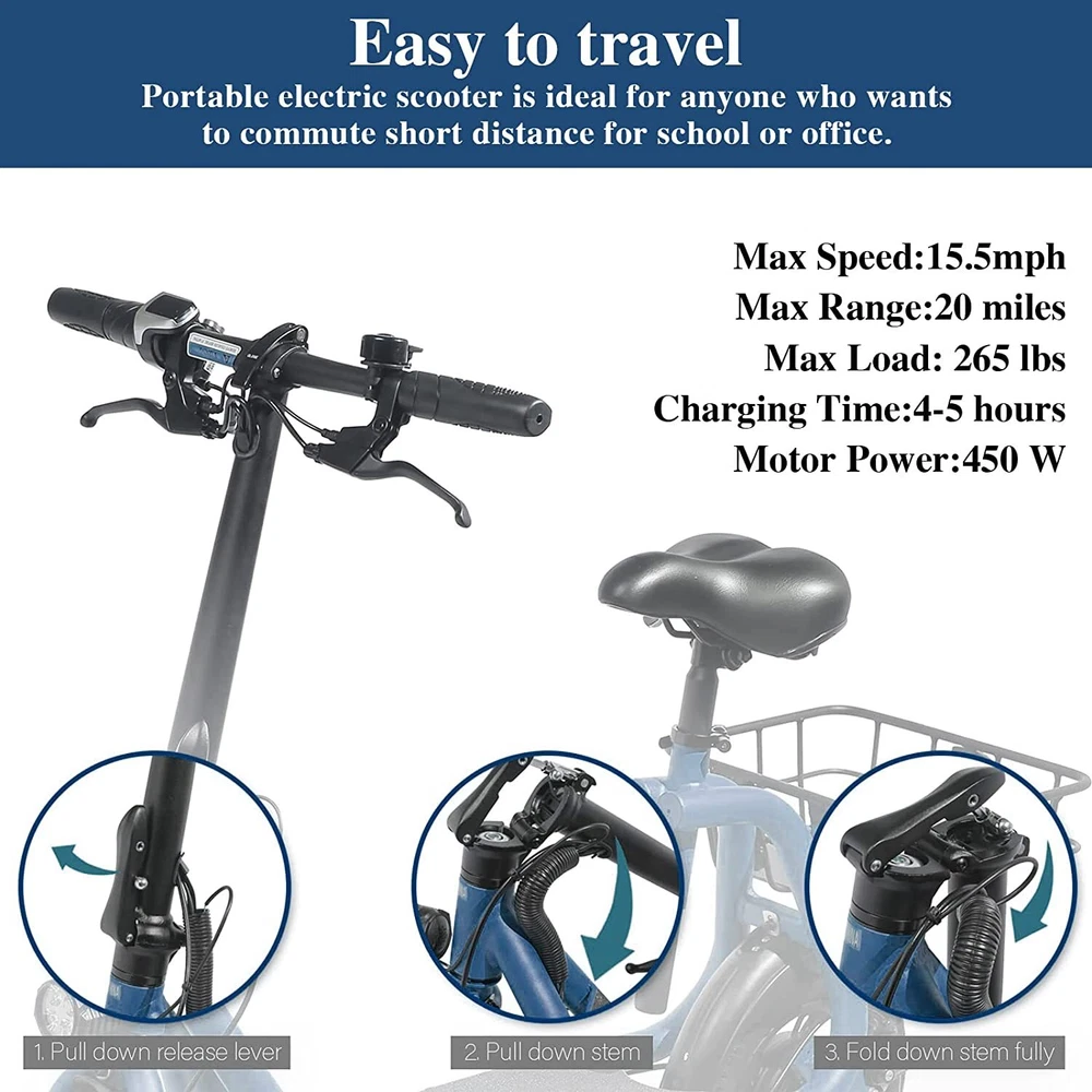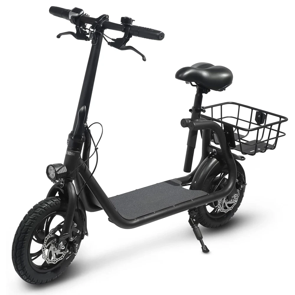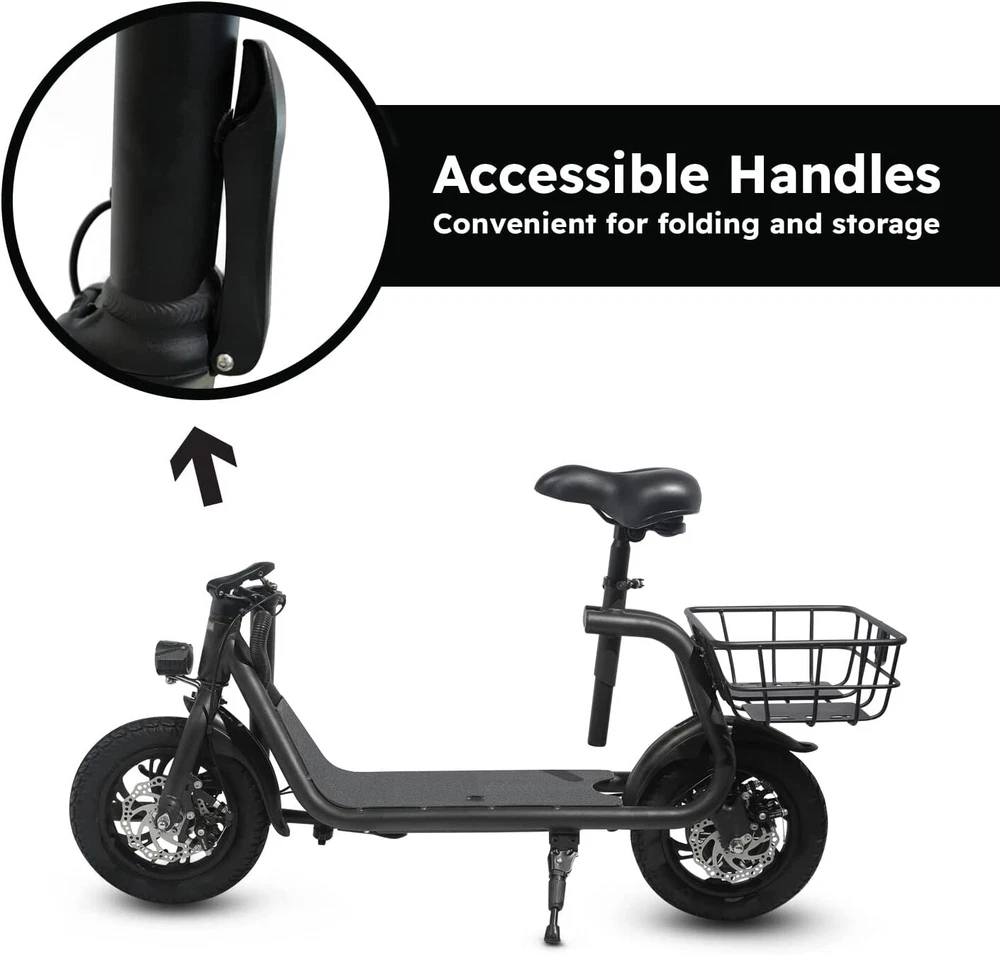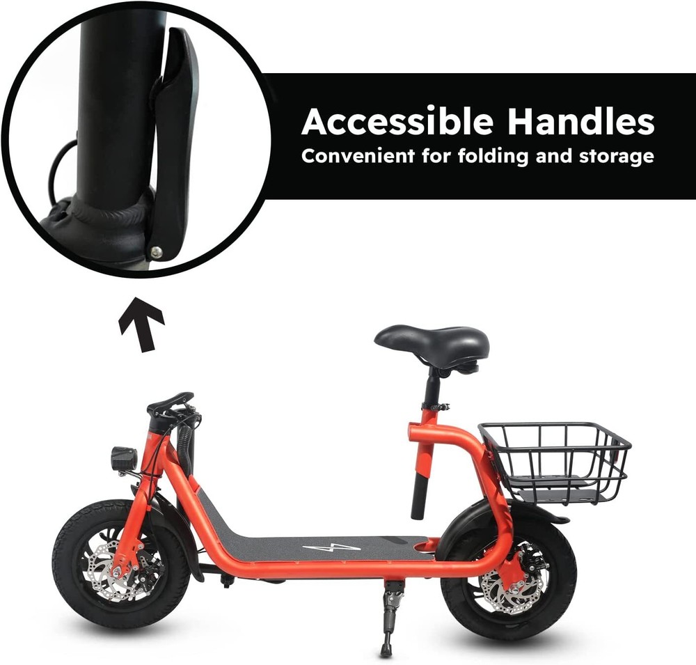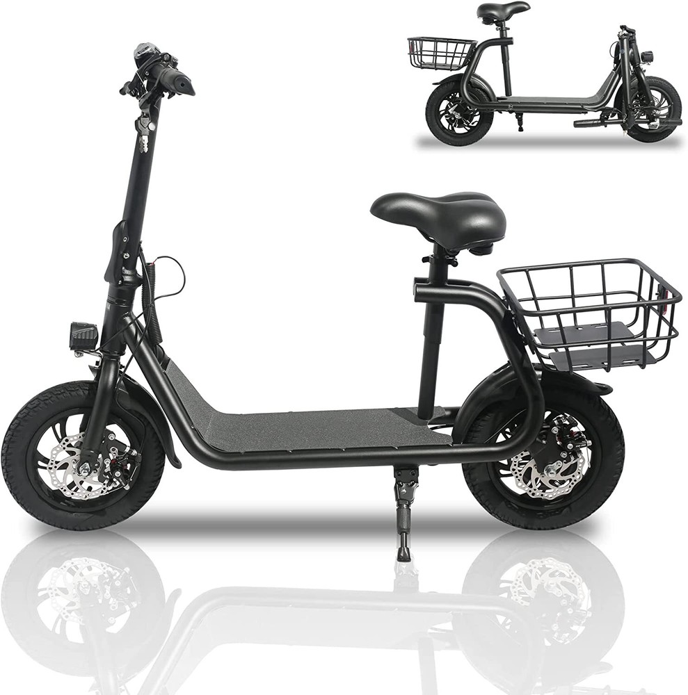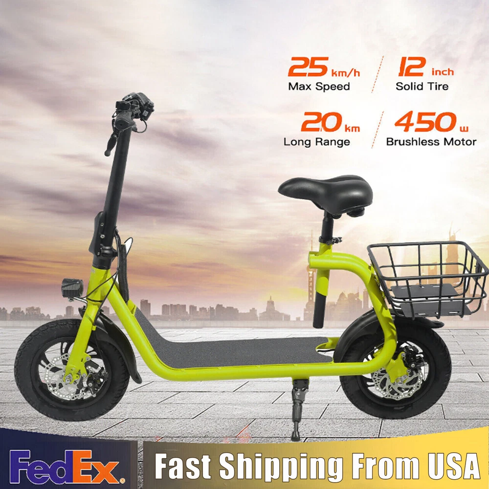 Folding 450W Sports Electric Scooter Adult with Seat Moped Commuter E-Scooter Product Features: Powerful Motor & Long Range: The adult electric bike comes with a 450W powerful brushless motor and large 40 cells 8.0Ah Lithium-ion battery, enables a 15-mile range, and a max speed of 15.5 mph. Portable & Lightweight: The foldable electric bike only weighs 42 lbs and can comfortably accommodate riders up to 265 lbs. This adult electric scooter can be easily folded and stored in the car trunk, which makes it perfect for commuters and students. Safe & Durable: With double braking systems, the front and back disc brake of the e-bike give you double safety. The 12" tires built for multi-terrain of daily use or outdoor activities. Detail Oriented Design: The E Scooter come with 13 x 11 inch rear carry basket and scooter deck, front LED light and rear reflectors for safety. Easy Assemble Required: The only assembly required is the seat and basket attachment. The handle bars are folded and just need to be erected. All tools are provided in the box. Product Specifications: Bike Type: Folding Bike, Electric Bike Age Range: Adult Wheel Size: 12 Inches Suspension Type: Rear, Front Included Components: Basket, Tool Kit Frame Material: Aluminum Brake Style: Disc Battery: Large 40 cells 8.0Ah Li Battery 36V Max Load: 265 lb Max Speed: 15.5 mph Max Range: 15 miles Package Listing: 1 x E Scooter 1 x Charger 1 x User Manual 1 x Tool Kit UL 2849 certified: https://productiq.ulprospector.com/en/profile/ Payment Shipping Return Feedback Question Payment We accept payment via Paypal ONLY. Immediate payment is required & Shipping will be arranged only your payment is cleared. Shipping Same business day dispatch if paid by 4 pm EST(1 pm PDT). No shipping on weekend or Public Holidays & No responsibility for any customs duty. Return We stand behind our products. Items can be returned for exchange or full refund within 60 days from the date you receive your item. Return shipping is the responsibility of buyer unless the return is a result of our mistake (i.e., your receive the wrong item or damaged item). We will pay for shipping replacement back to you if an exchange is requested. If you want to initiate a return, simply clicks "Return this item" next to the transaction in My eBay, chooses a reason, and prints a return shipping label and packing slip. We’re automatically notified. Feedback Please leave us a FIVE star and POSITIVE feedback if you are satisfied with our product and service. Neutral or negative feedback will not solve problems happily. We believe communication will fix problems and hope every customer can have a good purchasing experience. Question All ebay message will be responded within 1 business day or less, except weekends and holiday!