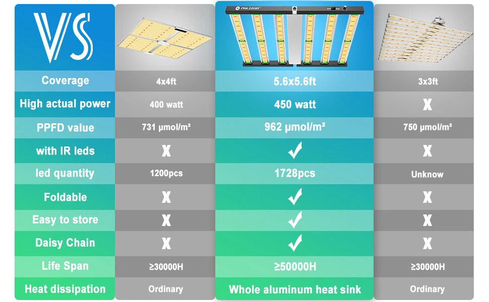 450W LED Grow Light Full Spectrum 6 Bars Samsung Led LM281B For Indoor Plants US 2023 Latest Design Foldable series LED Grow light is a high-output and full term lighting solution for indoor vertical farming and grow room with high effiency.Leds and high quality driver to scale from vegetative growth.while using less electricity and producing less heat than traditonal lights. LED yields are improving every year and there are now many reliable models of Phlizon LEDs that have been proven for growing high yields indoors by various growers in the industry. Unlike a lot of other brands, Phlizon LED grow lights have both a heatsink and built-in fans to help keep grow lights cool. This light is very similar to the much more expensive Fluence SPYDRx, in that they both use High Tech SMD chips and 660nm red light Item specifics 🌿MAXIMIZE CROP YIELD & ENERGY SAVING Wide 8-bar form design offers even & broad canopy coverage, maximize grow space, ideal for high PPFD cultivation with single or multi-tier racking.Consuming only 450 Watts true output with 1782pcs LEDs, more scientifically and energy-efficient! Perfect for 6.5' x 6.5' veg stage, 5.5' x 5.5' Flower stage, higher intensity reach 30% than other blue red lights.Newest SMD LED technology provide light output PPFD up to 1360 μmol/㎡s, high energy efficiency at 2.8umol/J.The best solution to get more and better quality fruits. 🌿Sunlike Full Spectrum Grow Light This full spectrum LED Grow Light uses 2592 pcs upgrade SMD lamp beads (3000K, 6500K and 660nm). Adequate and sun-like light can prevent the growth of plants from spindly and moulding. The best lighting solution for indoor hydroponics and soil cultivation, such as potatoes, peppers, tomatoes, etc.suit for all plants whole stages indoor growing, rapid plant response from seed to veg to flower to harvest. 🌿Achieve Enviously Large Harvests High-performance gardens with new LED technology provide highest PAR/LUMEN output(1360μmol/m².s), Max 2.8g yield per wattage (power draw), achieve maximum quality and quantity, much better than traditional 2000W HPS/HID grow light. 🌿Commerial Daisy-chain function The daisy-chain function allows you to connect up NO limited plant lamps through the RJ14 port, or control over 100 lights by purchasing an external 0-10V controller, especially beneficial for large area of indoor growing and commercial planting. 🌿High Reflective Heat Sink Led Grow System Quickly heat dispersing material aluminum reducing light lost to aisles and walls, increase the light intensity up to 20%, allowing your plants receive more energy and without burning your plants for maximum headroom. 🌿Noise-free Fanless Led Grow Lamps for Indoor Plants Foldable grow lights use newest aluminum heat-sink design, No fans ZERO noise, passively cooled with aluminum alloy 8 LED bars as well as detachable driver that contribute to better airflow and great heat dissipation, reducing the probability of problems due to overheating, allowing your plants receive more energy. High-quality LEDs protected by glue coating (waterproof Rating: IP65), worry free of the moist environment. 🌿DIMMABLE & FOLDING Design The light intensity can be changed by dimmer knob according to the different growth stages of plants.Plant led grow light can be folded up 180°, installed and moved easily, keep your house tidy. Structure optimization and material upgrade make it more lightweight and easy to install and use. 🌿Marvelous Customer Service Phlizon provides truly 3-5 years standard warranty ! If there is any question or concerns, please feel free to Email us. We will help you with great pleasure! Specifications Model: PH-FD8 LED grow light Shell material: aluminum Power:450W+/5% HPS equivalent: 1500 watts Voltage:120-277V AC, 347-480V AC, 50/60 Hz LEDs: HighTech SMD1782PCS LED 6bar(number): Total in1782pcs : 1728pcs SMD led beads , including 1056pcs 3000K leds , 384pcs 6000K leds, 264pcs 660nm red leds,24pcs IR leds. Spectrum:Full spectrum, 3500K,6000K,660nm,730nm for seed to flower growth Driver:External dimmable Mounting Height:≥ 6” Above Canopy Dimming:Knob dimmer, Dimension:36*26*3"(90*68*8cm) Weight:22 lbs (10kg) Input voltage: 100 ~ 240V AC Wavelength: full spectrum 380nm ~ 780nm Frequency: 50Hz / 60Hz LED brand: High Tech Samsung Chips Driver: UL Certified driver Service life: 500,000 hours Coverage area: 5.6'x5.6' Package includes 1 x LED Grow Light 1 Set x Free Steel Hanging kits (Easy installation) 1 x Free Warranty cards 1 x Free Power cord with Plug(UK plug) The other brands grow lights can only control the power switch. But Phlizon upgraded daisy chain, truly synchronized control all lights, ideal for large commercial planting. you can control all the function of grow lights, No limit to the number of connected lights.with a controller(not included),you can controll such as timer setting, time reservation, Dimmer, and Power. Widely applied in the commercial growing (horizontal and vertical), climate rooms, house garden, home grows (grow box and tents), greenhouse cultivation, pipeline,cultivation, hydroponics. Recommended for: Commercial grows Greenhouses Home grows (rooms and tents) Soil, hydroponic, aeroponic, or aquaponic systems Indoor farming or gardening Application: Greenhouse Lighting, Indoor Vertical Farm Lighting, Grow Room Lighting, Horticulture Lighting, Grow Tent Lighting Medical plants, Vegetable, Flowers, Crops, Fruits, Herbs, Leafy greens, pot culture, bonsai Clone, seedlings, nursery, vegetative stage, blooming, yield fruit, harvest Why Choose Led Grow Light? After application testing, LED plant lights are very suitable for plant growth, flowering, and fruiting. 🌿As an artificial supplemental light, led plant lamp’s light can be enhanced anytime in a whole day, what effectively extend the lighting time by plants. 🌿Whether it is sunny, cloudy or rainy, led plant lamp can reasonably and effectively extend and scientifically control the light needed for plan
