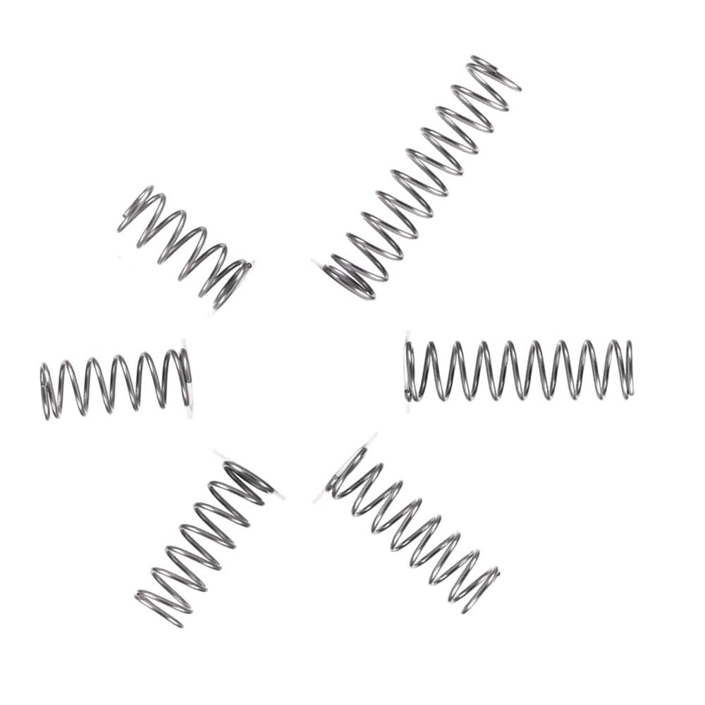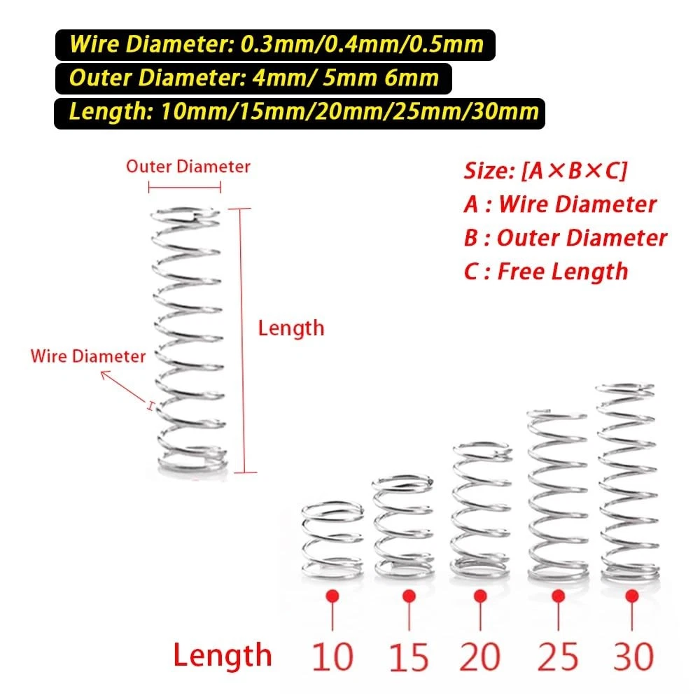 [Item] -- 304 Stainless Steel Compression Springs Assortment Kit [Description] -- 15 different sizes, totally 450 springs. [Size] -- Wire diameter * Outer diameter * Free length 0.3mm*4mm*30mm (0.012"x0.16"x1.18") -- 40pcs 0.3mm*4mm*25mm (0.012"x0.16"x0.99") -- 40pcs 0.3mm*4mm*20mm (0.012"x0.16"x0.79") -- 40pcs 0.3mm*4mm*15mm (0.012"x0.16"x0.59") -- 40pcs 0.3mm*4mm*10mm (0.012"x0.16"x0.39") -- 40pcs 0.4mm*5mm*30mm (0.016"x0.2"x1.18") -- 30pcs 0.4mm*5mm*25mm (0.016"x0.2"x0.99") -- 30pcs 0.4mm*5mm*20mm (0.016"x0.2"x0.79") -- 30pcs 0.4mm*5mm*15mm (0.016"x0.2"x0.59") -- 30pcs 0.4mm*5mm*10mm (0.016"x0.2"x0.39") -- 30pcs 0.5mm*6mm*30mm (0.02"x0.24"x1.18") -- 20pcs 0.5mm*6mm*25mm (0.02"x0.24"x0.99") -- 20pcs 0.5mm*6mm*20mm (0.02"x0.24"x0.79") -- 20pcs 0.5mm*6mm*15mm (0.02"x0.24"x0.59") -- 20pcs 0.5mm*6mm*10mm (0.02"x0.24"x0.39") -- 20pcs [Customer Service]- If you need any advice or product support, please contact our excellent customer service team who will happily respond to your question within 24 hours. [Anti-rust Material] --Our compression springs are made of 304 Stainless Steel, which is reliable and reusable. It is very resistant to oxidation, corrosion and rust for a long service time. [Package Include] -- 15 different sizes spring assorted in individual compartment, total 450 pieces in box. [Easy to Carry] -- Comes in a transparent box, which is light and small, easy to carry and store. 15 compartment storage with size label marked, you can pick up your target size easily and quickly. [Fit Most Use] -- 15 sizes would be completely enough for all your DIY project and Home repair, such as electrical equipment, 3D printer, piano, pens, toys, scissors, pliers, home tool, etc. [Size: A×B×C] -- A is Wire diameter, B is Outer diameter, C is Free length: [0.012"x0.16"x1.18"]; [0.012"x0.16"x0.99"]; [0.012"x0.16"x0.79"]; [0.012"x0.16"x0.59"]; [0.012"x0.16"x0.39"]; [0.016"x0.2"x1.18"]; [0.016"x0.2"x0.99"]; [0.016"x0.2"x0.79"]; [0.016"x0.2"x0.59"]; [0.016"x0.2"x0.39"]; [0.02"x0.24"x1.18"]; [0.02"x0.24"x0.99"]; [0.02"x0.24"x0.79"]; [0.02"x0.24"x0.59"]; [0.02"x0.24"x0.39"];