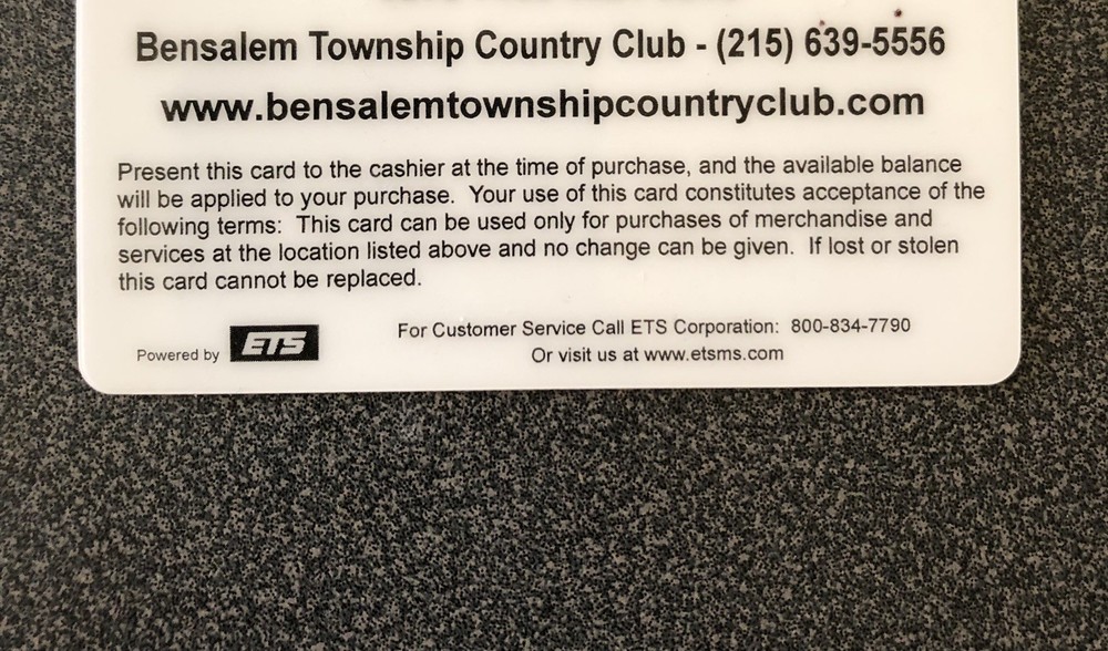 No expiration gift card balance is $459 good for greens fees, pro shop merchandise, food and beverage at Bensalem Township Country Club 2000 Brown Avenue Bensalem PA 19020