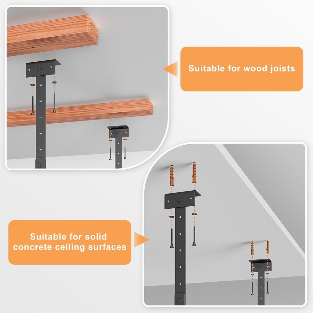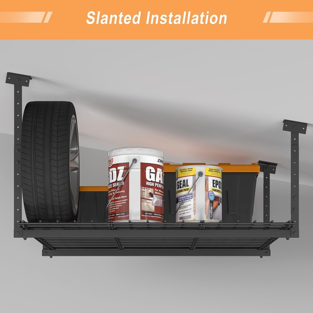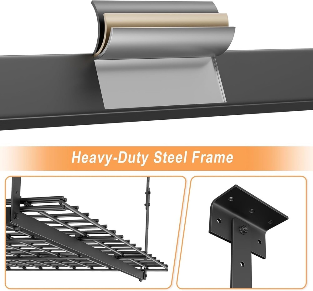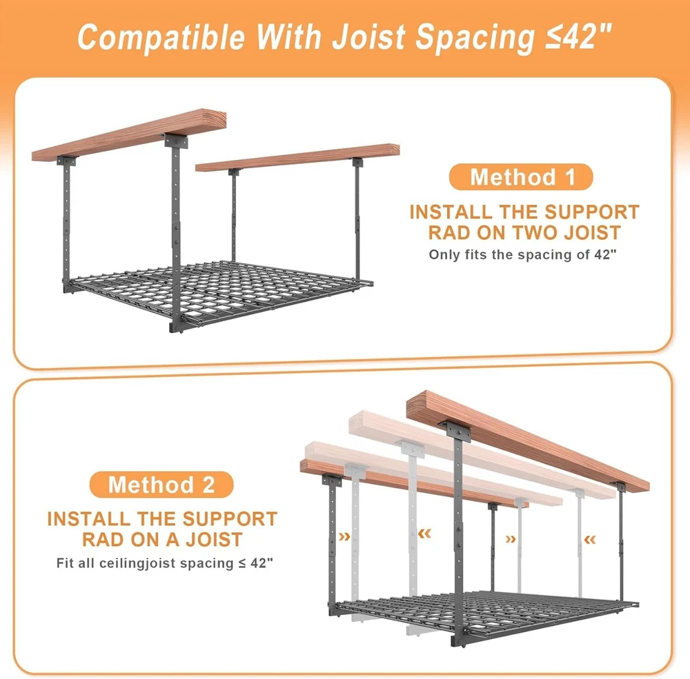 ceiling rack đŚă30+ Cubic Feet Organized Storageă- 45"x45" garage overhead storage creates massive 30+ cu.ft capacity â store 8-12 large plastic bins, luggage sets, camping coolers, or holiday decorations with smart vertical space management. đăHeavy-Duty 250 lbs Capacityă- Crafted with industrial-grade cold-rolled steel, our garage ceiling storage rack securely holds up to 250 lbs. Perfect for bulky seasonal items, toolboxes and outdoor gear. đ§ăQuick Installationă- On any Ceiling Joists â¤42". Pre-drilled universal mounting brackets work with all standard joist spacing. No complex measurements â install this overhead garage storage rack in under 1 hour using basic tools. đă17"-28" Height Adjustment ă- Customize your garage ceiling storage space with 11-inch vertical flexibility. Clear vehicles or shelves effortlessly while maximizing overhead storage efficiency. đĄď¸ăWorry-Free Supportă- Your satisfaction is our priority! overhead garage storage come with 24/7 customer service and a 1-year limited warranty. If any part fails, contact us for instant replacementsâguaranteed!