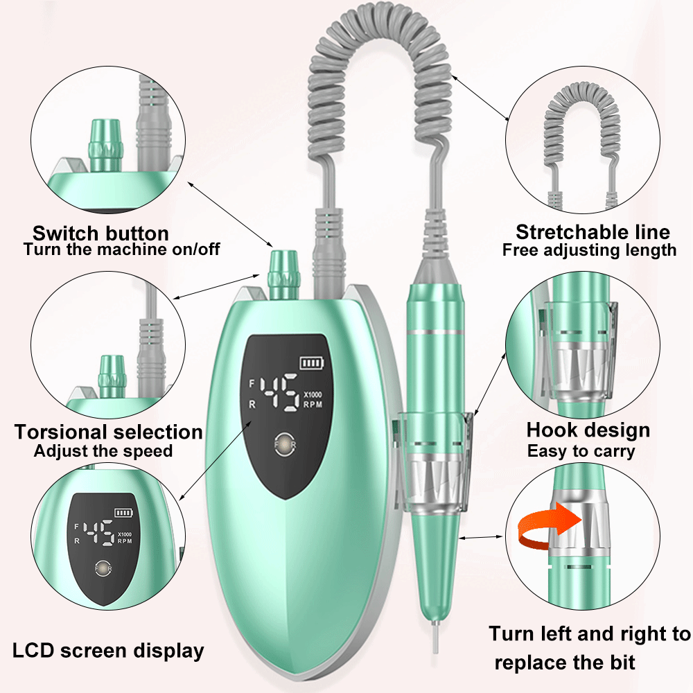 Specifications: ❥Item: Rechargeable 45000 RPM Electric Nail File Nail Gel Polisher Nail Drill Machine ❥Material: Aluminium Alloy+ABS ❥Rechargeable Adaptor Input: 110/220-240V 50~60Hz ❥Speed(RPM): 0~45000RPM ❥Battery Capacity: 4000mA ❥Power: 35W Nail Drill ❥Charging Time: 40 Mins ❥Use Time: 8 H ❥Charging Port: USB Recharge ❥Grinder Type : Suitable for 3/32 "drill bits ❥Grinding Head: 6 types of grinding heads ❥Product Size: 5.6 x 4 x 9.5 Inch( Include Line) ❥Item Weight: Approx 480g Package Includes : 1 x Portable Nail Drill Machine 1 x Handpiece 1 x USB Charger 6 x Drill Bits 6 x Sanding bands 1 x User Manual Feature : ❥❥Powerful and adjustable speed/direction, 6 different metal drill bits, high speed up to 45000 RPM.Low heat, low noise, ultra-low vibration.Powerful smoothing for natural acrylic nails, gel polish dip powder nails, and exfoliation of dead skin and calluses. Professional home and salon use, carving, carving, routing, grinding, sanding, sanding, cutting, polishing, drilling, great for nail polish. ❥❥High-definition LCD display, long battery life & power bank, large-capacity battery with brush less motor, prolonging more use time, this electronic nail machine can last for 8 hours after being fully charged for 40 min . Once charged, you can also use it as a power bank when your phone needs to be turned off. The high-definition LCD display on the rig shows the speed and remaining battery power, which is convenient for you to adjust the speed and reminds you to charge. ❥❥Portable and lightweight design, you can easily take it in your bag. The rig comes with a hook so you can hang it on your clothing, or put it in your pocket or bag. The rig also has a pen holder for easy working in different environments. ❥❥All-aluminum pen, easy to use, high-quality aluminum alloy long-life handle design, matte design can avoid all fingerprints, low noise, low vibration, low temperature operation, safe and reliable.Can be switched left or right, right or left handed. Variable speed control, suitable for different use requirements. Improved wireless smooth operation handle with flexible extension. Rotary lock blocks are used to secure the bit and quickly release the bit. ❥❥The multi-functional manicure drill kit has a wide range of uses, DIY family salon gifts, convenient and elegant gift packaging, and stores various accessories. This is an excellent choice that you must have. Great for holiday gifts. Both professionals and amateurs.