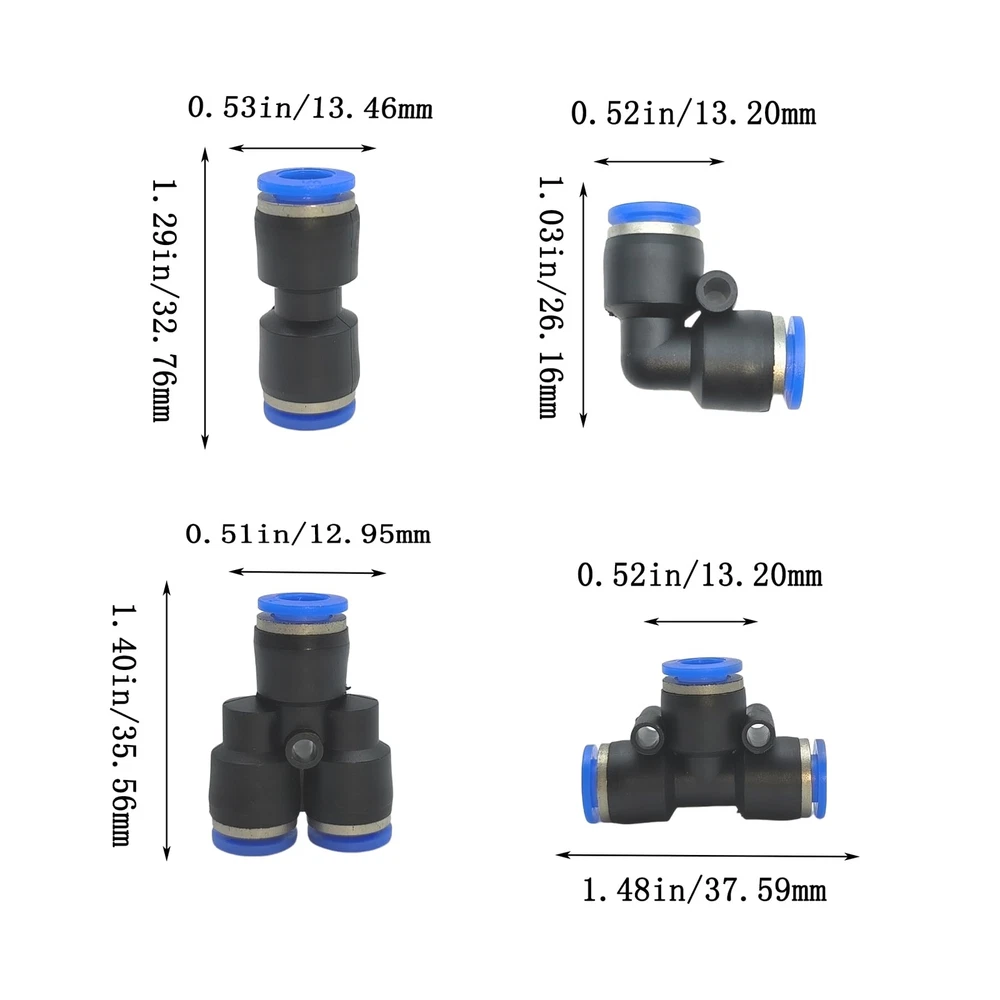 Feature: This fitting is made of high quality plastic, with good air tightness, high pressure resistance, firm and reliable, and long service life. Internal card spring design, sealing tight, not easy to unbuckle, special groove design of the sealing ring, to ensure the sealing. Can be applied to the gas pipe range, strong sealing, strong and durable, not easy to deformation burst, the cap can be 360 ° rotation. Easy to connect the air tube, just press easily to pull out the air tube, easy to install, simple and dexterous. Material:High Quality Plastic Working Pressure:0-1 MPa Working temperature:32~140°F Material: Made of quality plastic which is not easy to fall off after connection; The sealing element has good sealing performance and is not easy to leak; The pneumatic parts have high strength, which are not easy to burst and ensure long service life. Different styles: there are 4 different types of pipe fittings, including tee, elbow, Y and straight, which can arbitrarily change direction after installation, and can be manually inserted and pulled out from the gas pipe without extra tools. Easy to use: Simple push-in design for connecting tubes without additional sealing for safe tube use. Wide application: all models of push lock fittings are suitable for air pipes, pneumatic tools and more, and can be applied to connect pipes and different pneumatic components; Each model has its own purpose. Package include: 45pcs connect air hose fittings include(10 Spliters+10 Elbows+10 Tee+15 Straight Tubes).
