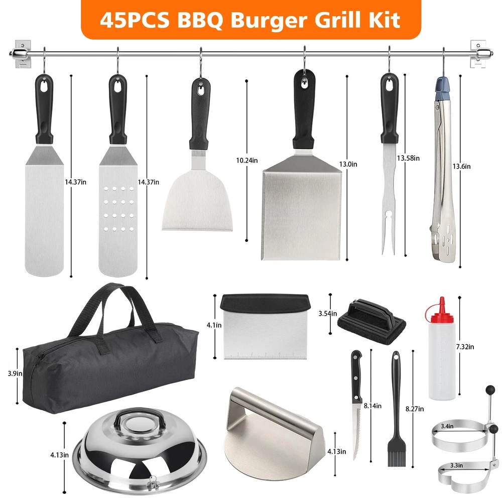 45-Piece for blackstone Griddle Accessories Kit Description: Enhance your outdoor cooking experience with our comprehensive 45-piece for blackstone Griddle Accessories Kit. This set includes essential tools for any camp chef, featuring a grill lid, burger press, spatulas, grill tongs, and much more—all conveniently packed in a carry bag. Ideal for professional hibachi-style cooking, this kit makes the perfect gift for men who love grilling. Included Items: Grill Lid: For even heat distribution and versatile cooking. Burger Press: Perfect for shaping uniform burgers. Long Spatula: Ideal for flipping and serving. Slotted Spatula: For draining excess grease. Large Burger Spatula: Specifically designed for flipping large patties. Small Spatula: For precise handling of smaller items. Dough Cutter: For cutting dough and other prep tasks. Grill Tongs: For secure flipping and handling of food. Grease Brush: For applying oils and sauces. Meat Fork: For turning and probing meats. Corkscrew: For opening wine bottles. 2 Squeeze Bottles: For dispensing sauces and oils. 4 Egg Rings: For perfect fried eggs. 2 Seasoning Bottles: For adding spices and seasonings. 6 Corn Holders: For holding corn on the cob. 8 Hooks: For hanging tools and accessories. 8 Meat Skewers: For grilling kabobs. Cleaning Brush: For maintaining your griddle surface. Carry Bag: For easy transport and storage. Instruction Manual: Detailed instructions for use. Color Box Packaging: Ready for gifting. Key Features: Comprehensive Set: Includes everything you need for professional-level grilling. High-Quality Tools: Made from durable materials to withstand rigorous use. Portable Design: Comes with a carry bag for easy transportation. Ideal Gift: Perfect for men who enjoy outdoor cooking and grilling. Easy Maintenance: Most items are dishwasher-safe; hand-wash the cast iron burger All-in-one BBQ Burger Grill Kit: This 45-piece griddle tool kit includes 12-inch melting dome,burger smasher, burger flipper, large burger spatula, griddle spatula, slotted spatula, chopper, knife, oil brush, grill tongs, BBQ fork, 8x BBQ skewers, 8x corn holders, 4x egg rings, cleaning brush, 8x hooks, and a convenient storage bag. All accessories for blackstone griddle you need is here. High-Quality Stainless Steel: Our grill accessories for blackstone are crafted from heavy-duty 304 stainless steel, ensuring compatibility for blackstone griddles. griddle accessories for blackstone are BPA-free, exceptionally sturdy, rust-resistant, heat-resistant, and built to last. Diverse and Essential black stone grilling accessories: Our grill set includes griddle spatulas for efficient turning, lifting, and frying; a burger smasher for creating evenly shaped, juicy patties; a burger flipper for effortless flipping and serving; a chopper for precise cutting and scraping; a 12-inch melting dome for even meat cooking; and various egg ring shapes for added culinary fun. Easy to Clean & Store: Our BBQ grill tools are non-stick and dishwasher-safe, making cleanup a breeze. Our griddle accessories kit includes 8 hooks for effortless hanging and organization. Plus, it comes with a spacious storage bag that fits all the items for easy carrying and storage. Professional grilling accessories for outdoor grill. Perfect Gift for Griddle Lovers: This BBQ grill burger accessories kit is a thoughtful present for those who love crafting delicious burgers on their griddle stones or Camp Chef griddle. An ideal Father's Day gifts, Thanksgiving gifts, Christmas gifts, and more. Perfect grilling gifts for men. Considerate birthday gift for dad.