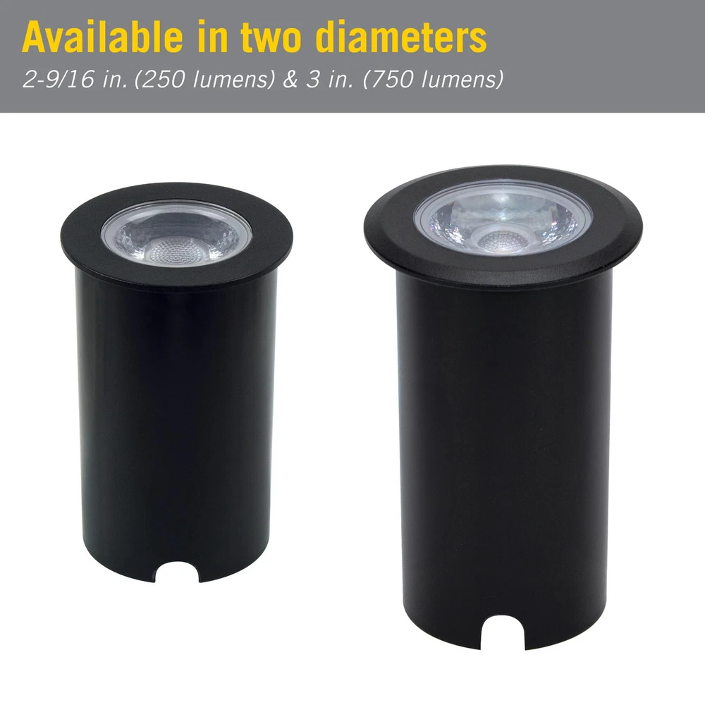 White Inground LED Landscape Lights from are perfect for low voltage landscape lighting of driveways, walkways, gardens, pathways, patios and decks. Ideal for outdoor up lighting, the white LED well lights are available in multiple color temperature and diameters. Installation is simple with either 12V or 24V AC or DC power. The maintenance-free landscape lights are weather resistant and feature IP67 waterproof components. They can be buried in the ground or installed in hard surfaces, like wood, stone, or concrete. Use the removable sleeve as a form for new inground installations or use a drill bit to cut into existing surfaces. Low voltage LED outdoor landscape well light features a 30 degree beam angle Indoor/Outdoor IP67 all-weather deck lights, perfect for garden pathway lighting or deck, pool, and step lights 12-24V AC/DC low voltage LED landscape lights must be paired with hardwire LED drivers (sold separately) Long-lasting, aluminum construction LED lights are energy efficient and low maintenance Impact-resistant inground lights are rugged and durable with a maximum walkover weight of 4400 lbs