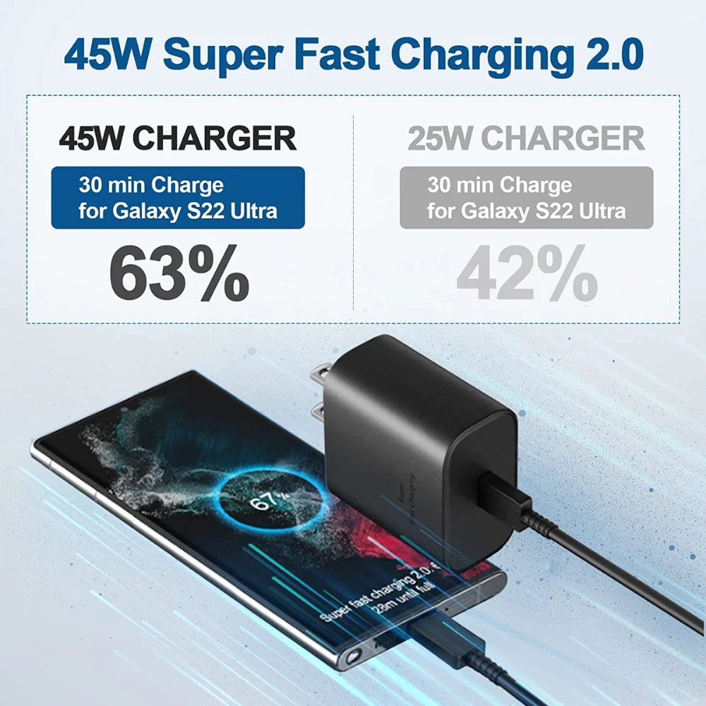 【Super Safety Fast Charging】:PD3.0 Technology ensures an optimized and rapid safe charging experience(25W) for all for for Galaxy S22, S21, S20 / Note 20 / Note 10 / 10+ and S10 5G Models,up to 9V/2.77A charge speed. Most phones will charge from 0 to 100% in about 60-90 minutes, some devices with very large batteries could take approximately 3 hours. 【Universal Type C Phone Charger 】:The USB C Wall Charger can provide fast charge for Type-C phones and tablets, such as the 2018 iPad Pro 11/12.9, 2020 iPad Pro 11/12.9,for Samsung Galaxy S22, S22+, S21, S21+, S20, S20+,S10, S10+S9, S9+ Plus, S8, S8+ Plus / Active, A70, A80, S10, S10 plus, for Google Pixel, Pixel 2, Pixel 3, Pixel XL, Pixel 2XL, Pixel 3XL, Pixel 4XL, Pixel 3A, LG G7 Thing, G8, G6, G5, Stylo 4, V20, V30, V35, V30S, V40 ThinQ Plus, for Motorola Moto Z and more. 【6 Feet USB-C to USB-C Charging Cable】 :Length of 6.6 feet, easy for charging on different occasion, for travel, home, car, office, etc. 【Flexibility and Safety】: Use the cable to sync and transfer files at amazing speeds with your for Galaxy or other compatible smartphone or laptop. Intelligent circuit design protects against short circuiting, over-heating, over-current, and over-charging for safe with fast charging. Sustained high-power output will have a temperature rise, but they are all within the safety limits. 【Package Includes】: 1×25w wall charger or 1×6ft c to type c cable, 1×25w wall charger + 1×6ft c to type c cable