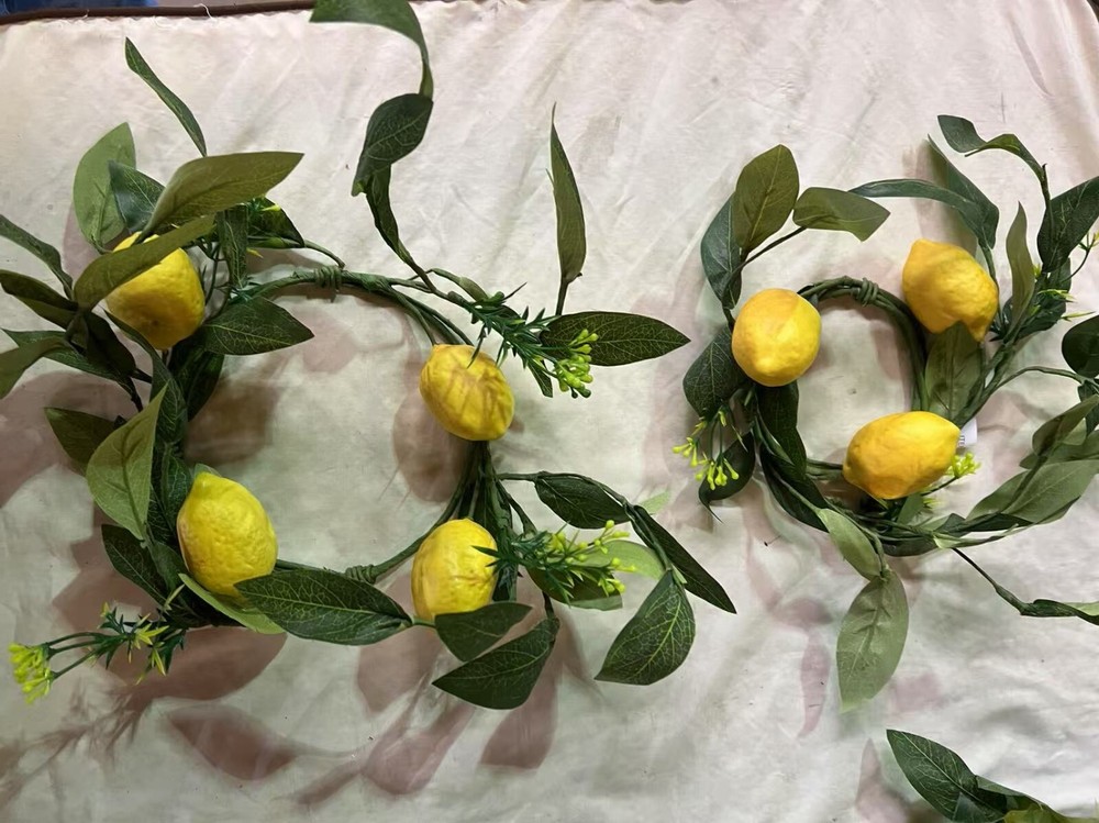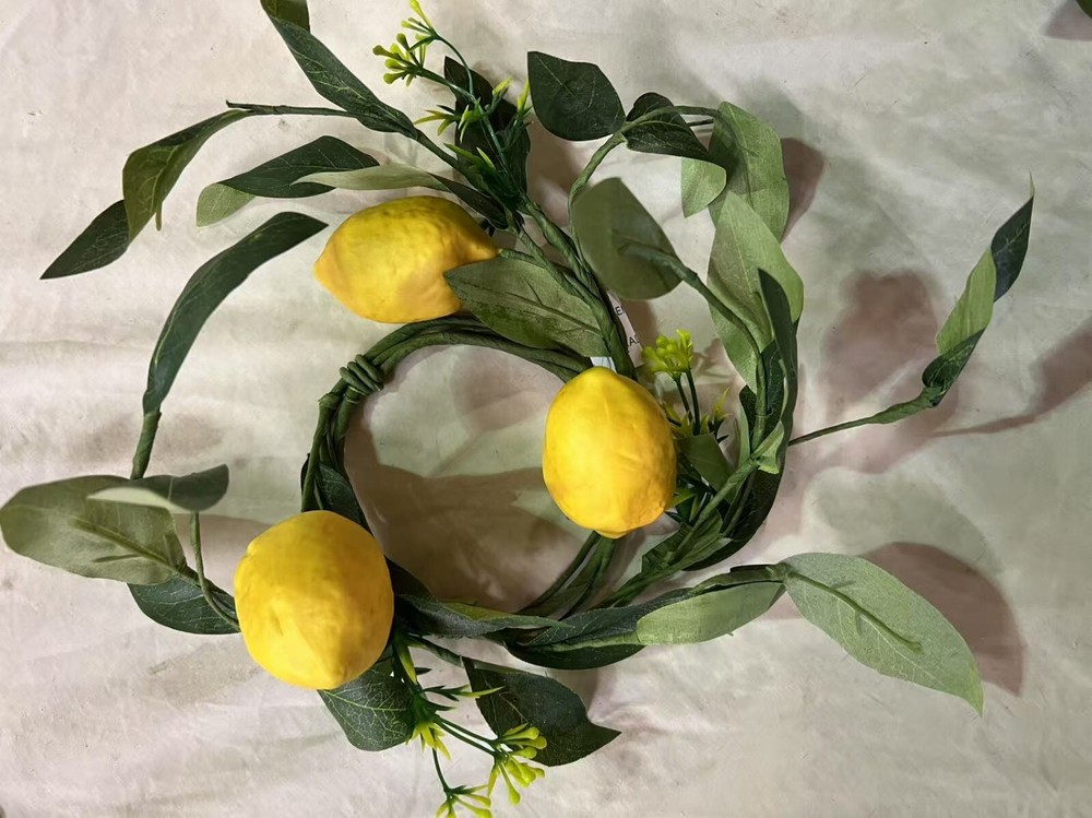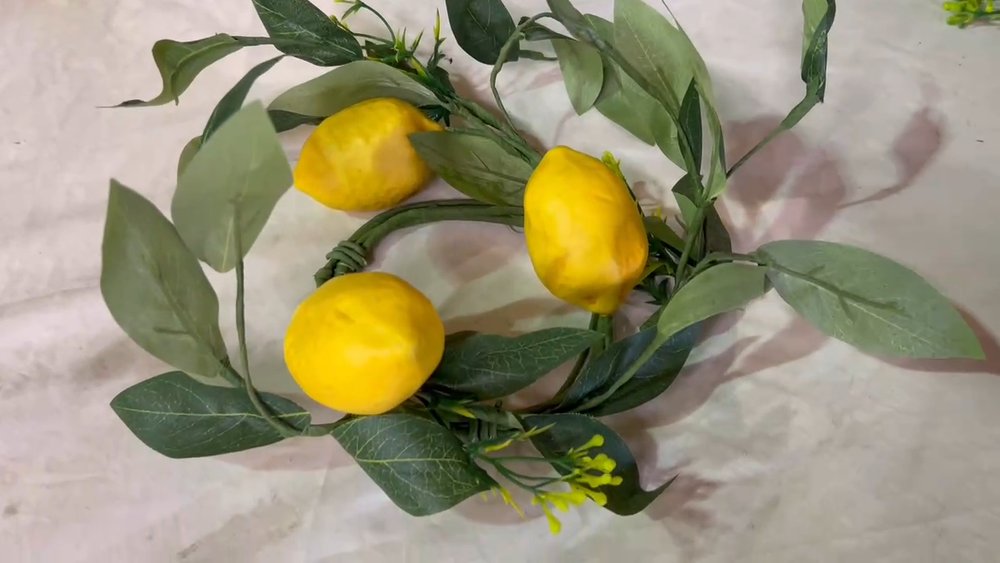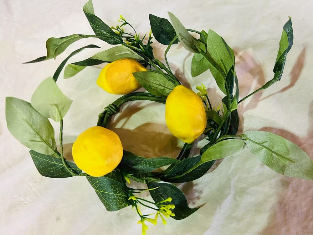 This 4.5in lemon candle ring features vibrant yellow lemons and lush greenery. Perfect for summer table decor, farmhouse kitchens, or centerpieces. Fresh, bright, and reusable!