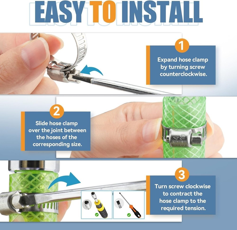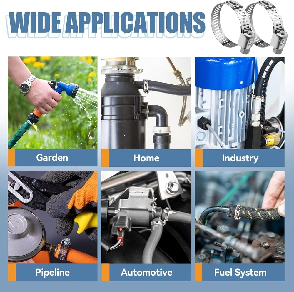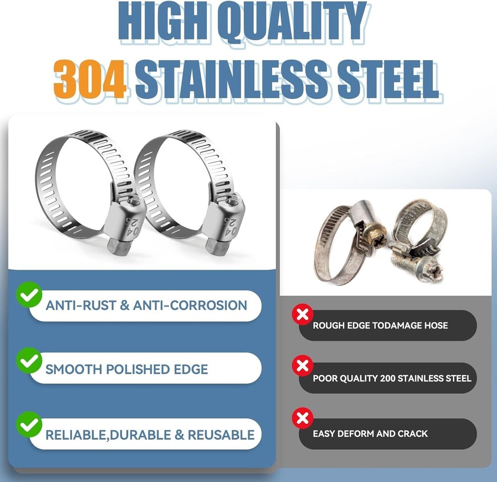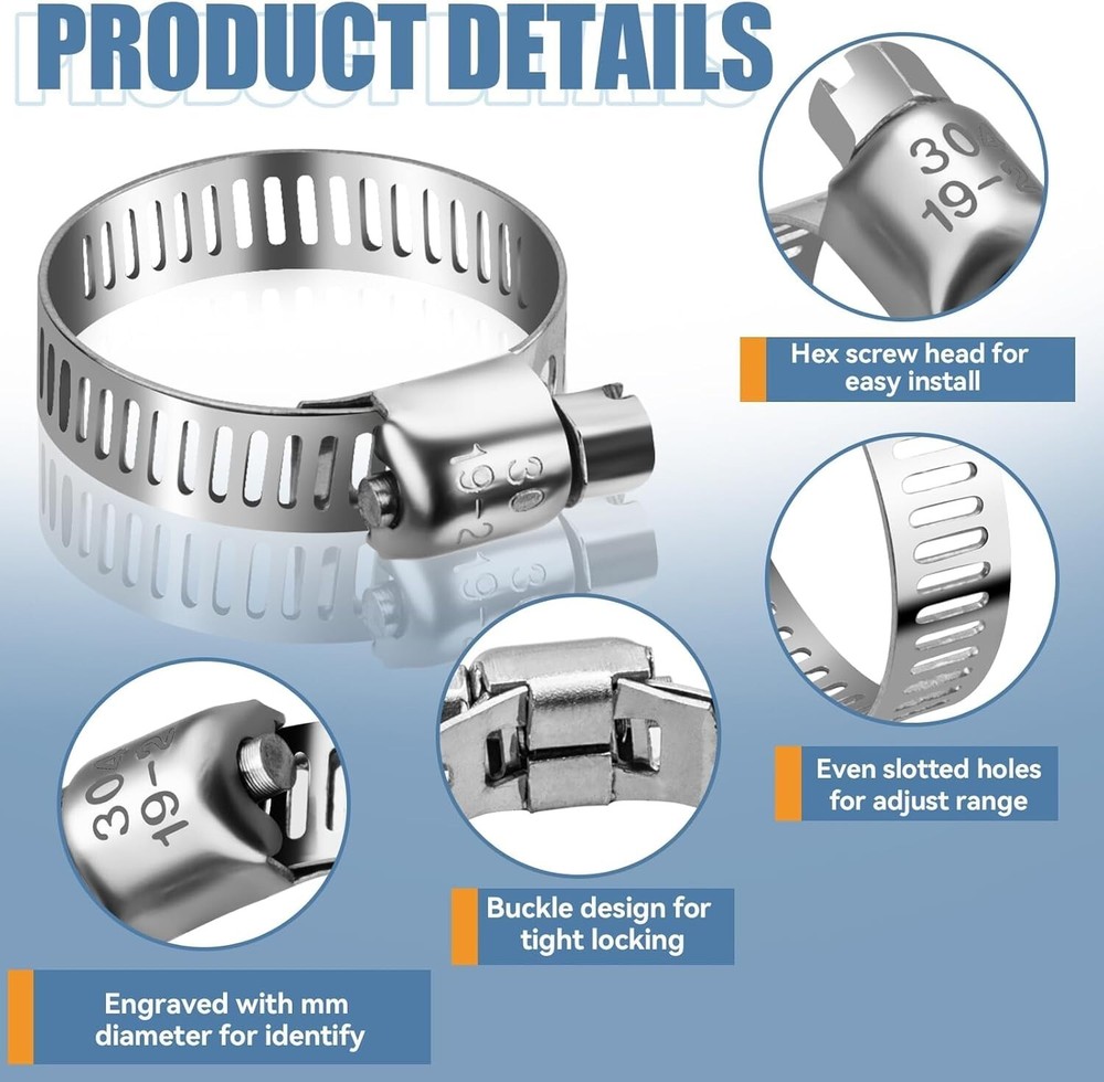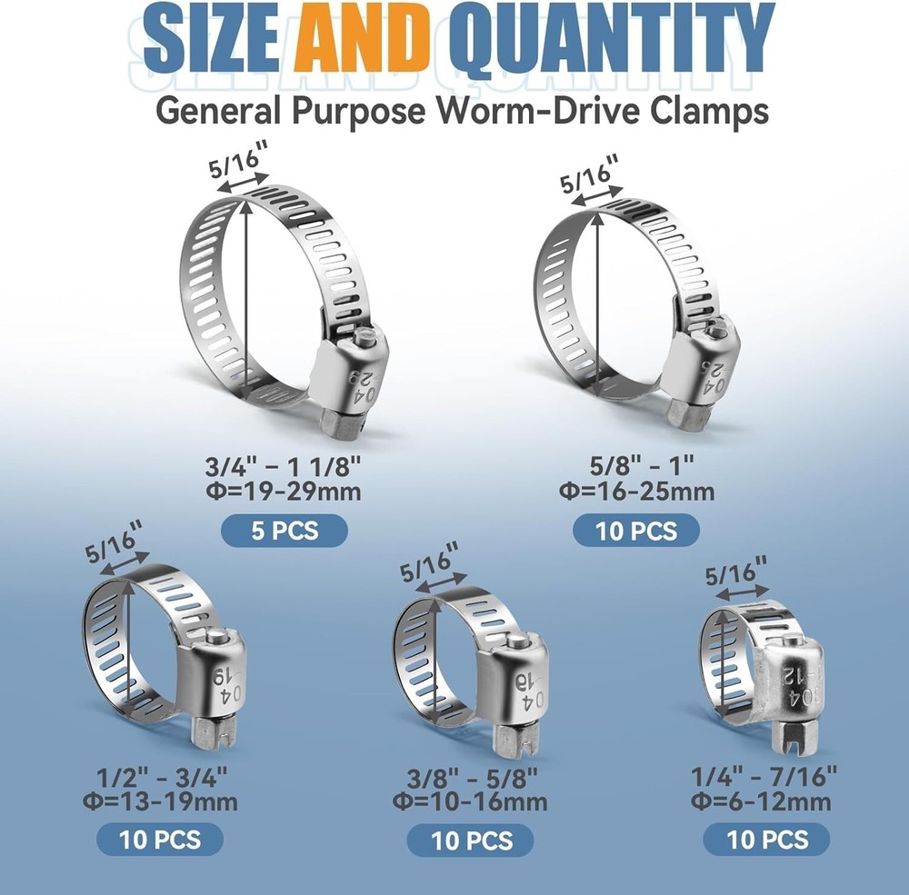 About this item 【High-Quality Material】This set includes 45 hose clamps, all made from premium 304 stainless steel, ensuring corrosion resistance and long-lasting durability. These stainless steel adjustable hose clamps are suitable for use in various harsh environments, providing enduring reliability. 【Versatile Applications】Designed for a wide range of applications, these hose clamps are ideal for plumbing, automotive, and mechanical fields. They meet the needs of pipe clamps, fuel line clamps, and duct clamps, making them perfect for both home DIY projects and professional-grade applications. 【Adjustable Size and Flexibility】This worm gear hose clamp set can be adjusted from 1/4'' to 1-1/8'' (6-29mm), demonstrating excellent flexibility and extensibility. It contains 5 different sizes, forming a versatile hose clamp assortment kit, adaptable to different usage scenarios and needs. 【Efficient and Secure Performance】Featuring a worm drive design, these clamps ensure tight locking and high torque. Their worm gear mechanism provides a secure hold and smooth drive, offering superior clamping power and safe sealing. 【Cost-Effective Set】The 45-piece set offers excellent value, whether you need multiple sizes for a single project or want to stock up on spare parts. Its comprehensive range of sizes and quantities can meet your diverse needs, especially suitable for automotive mechanical applications.