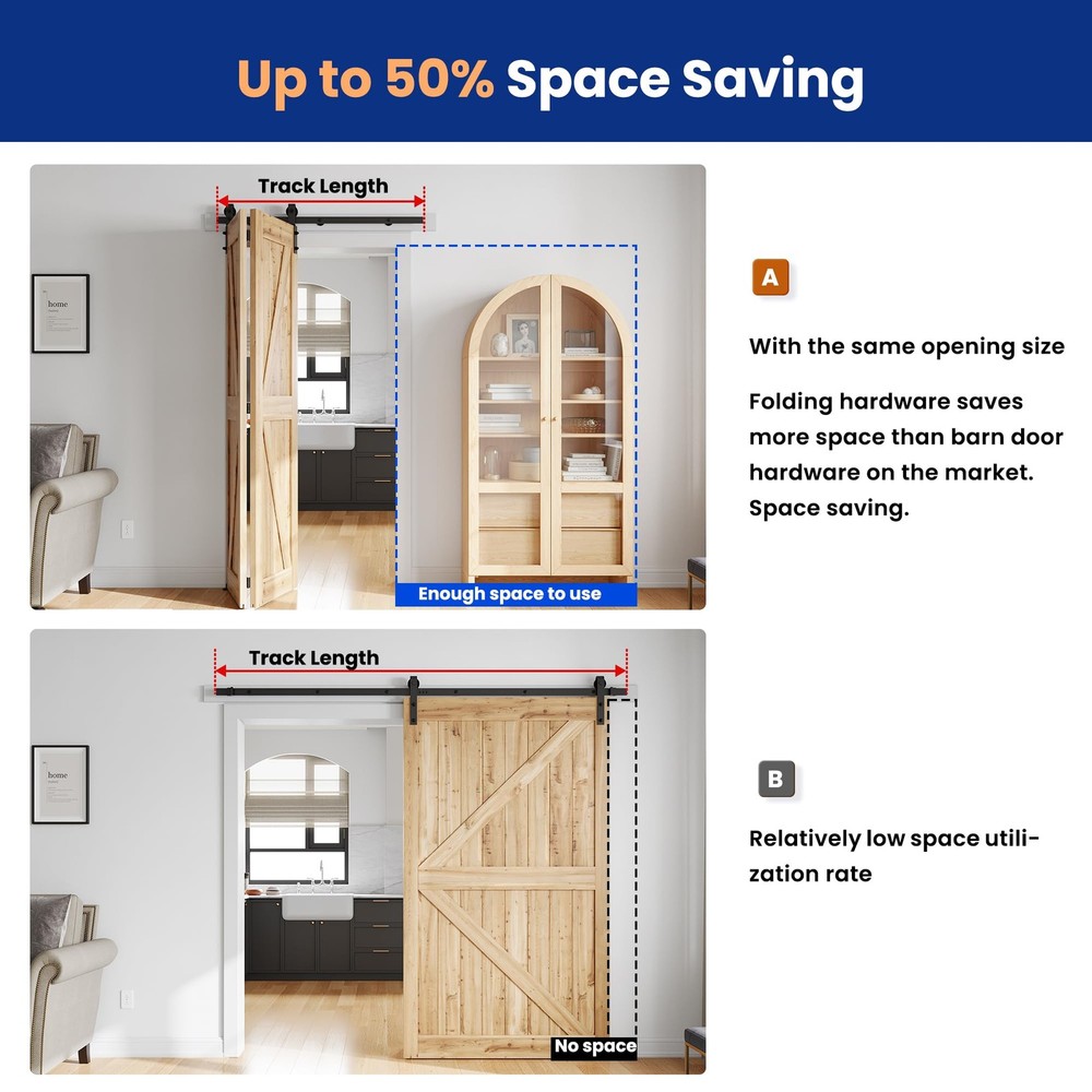 [Why Choose Us]: Our bifold door hardware kit is made of high-quality carbon steel and has the characteristics of corrosion resistance and waterproofing. It is equipped with rollers made of high-strength nylon material, which runs smoothly and has low noise. [Easy Installation]: Our products are packaged in partitions, marked with graphics. Professional instruction and customer service team help you solve all installation problems in time. Save the cost of finding a carpenter or decoration team. [Package Included]: 1x 3.8FT Rails, 3x Rail Spacers, 1x Fixed Roller, 1x Adjustable Roller, 1x Roller Lock Bracket,1x Bottom Pivot Plate & Sleeve, 2x Top Connector Plates, 3x Butt Hinges, 3x Hex Key; All other necessary hardware is included as you see in the pictures. [DOOR NOT INCLUDED] [Door Weight Max Capacity]: Our bifold barn door hardware kit Capacity is 360 lb, Fit sigle door panel max width: 22", Fit door panel thickness: 1 3/8" and 1 3/4". [Right Choice for Your House]: Compared with the classic track, our bifold door hardware kit saves more space and has more applicable scenarios:bedrooms, living rooms, wardrobes, storage rooms, cloakrooms, dressing room, etc.