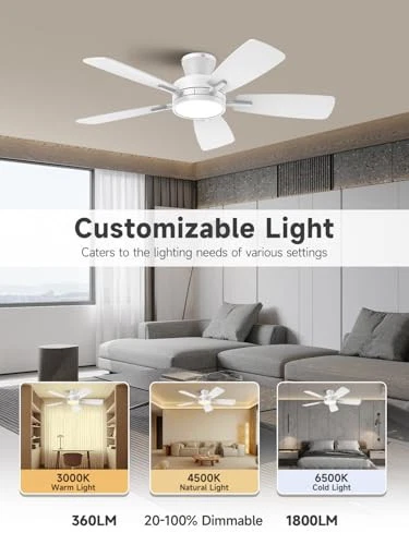 Return Policy Fast Delivery Trusted seller Ceiling Fans with Lights and Remote, 46 Inch Low Profile Ceiling Fan with Light, Flush Mount, Reversible, 3CCT, Dimmable White Modern Ceiling Fan for Bedroom, Living Room, Outdoor Patio Product Description Whisper-Quiet Experience: This modern ceiling fan with light is perfect for light sleepers, creating a peaceful environment for a restful night. Operating at just 35dB, it's as quiet as falling leaves or the soft flutter of a butterfly's wings (30dB). It's ideal for families with babies or elderly members. Reversible DC Motor: The reversible design enhances airflow, keeping you warm in the winter and cool in the summer. This 46 inch flush mount ceiling fan features a DC motor with an A-level energy efficiency rating, reducing power consumption by up to 80% compared to traditional fans. Customizable Lighting: Whether you're enjoying a cozy evening or need brighter light for family game night or homework, the white ceiling fan with light offers dimmable settings (20%-100%) to suit any occasion. Additionally, you can choose any color temperature between 3000K and 6500K, allowing you to create the perfect ambiance for any space. Ceiling fans with lighs and Remote: All operations can be controlled via the remote, including 6 fan speed settings, light color temperatures adjustment, and a timer with options for 2, 4, or 8 hours to automatically turn off. The fan and light can be controlled independently. Low Profile Ceiling Fan with Light: Featuring a flush mount design, two-tone textured blades, and a replaceable low profile light that seamlessly integrates with the fan body, this ceiling fan brings understated elegance to any room. Ideal for indoor spaces like living rooms, dining rooms, bedrooms, kitchens, or offices, and suitable for covered outdoor areas such as patios or porches. (Note: Not for direct rain exposure.) Memory Function: Set your preferred light brightness and color temperature, then turn off the light for at least 10 seconds to save these settings. When you turn the light back on, it will remember your last settings. Note: Turning the light back on within 10 seconds will change the color temperature. Shipping Returns Payment Shipping Shipping is FREE to all addresses other than APO/PO boxes in the lower 48 states. All our stock ships from US-based warehouses. Shipped via USPS or UPS (depending on location and package weight) Unless stated otherwise, all orders will ship within 24-72 hours of your payment being processed. Check our feedback to see the great reviews of FAST shipping we offer. Returns Seller does not accept returns Payment We currently accept payment via eBay managed payments only. Once payment is cleared, we will dispatch your shipment within 1-3 business days. Please refer to the "Shipping" tab for more information regarding shipping speed to your destination.