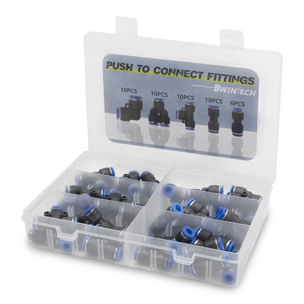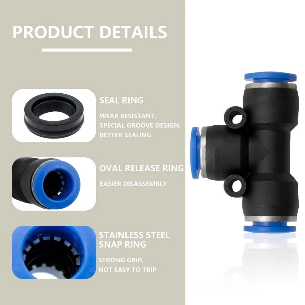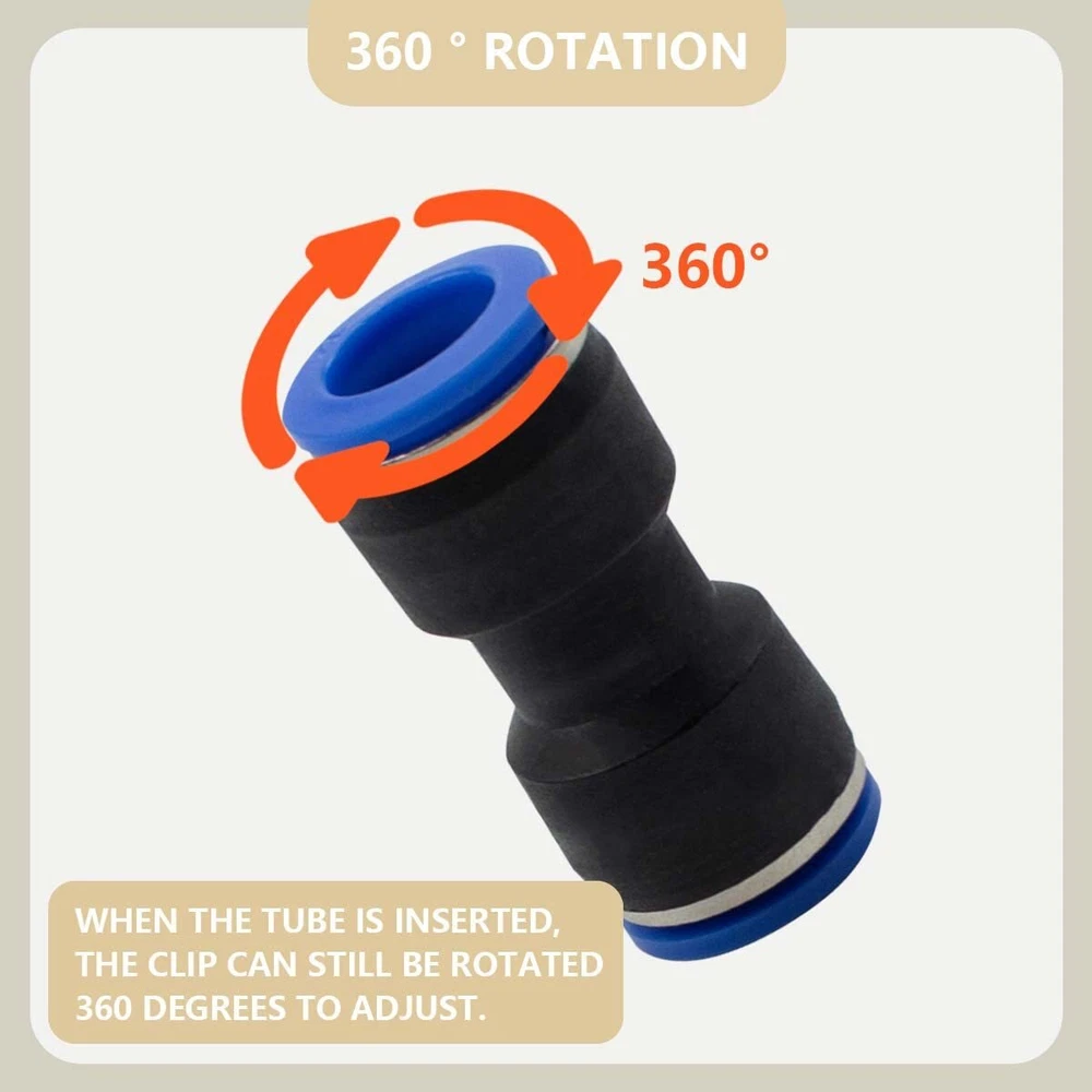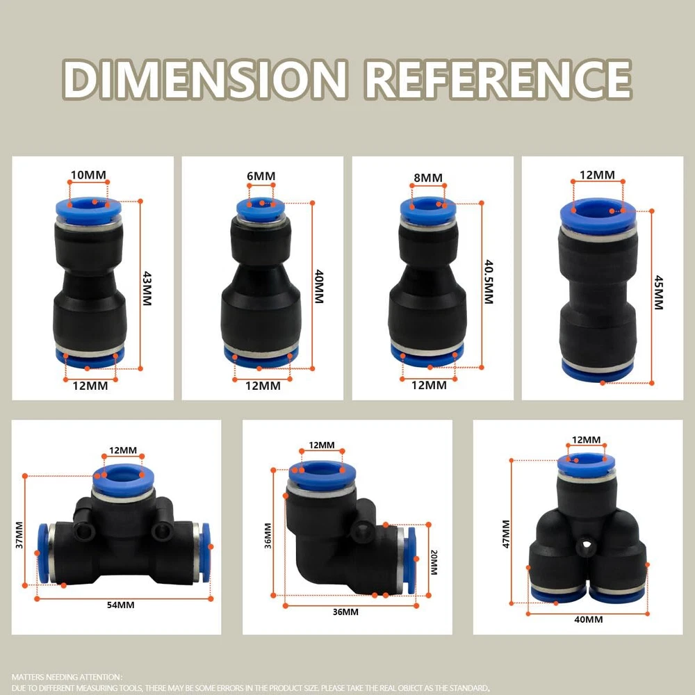 【Package】 46 Pcs Air line Pushing Connectors, incuding 12mm straight/Elbow/Tee/Splitter Connectors and 2 pcs 6-12,8-12 ,10-12mm reducing connector. 【Dual Application】:The straight/Elbow/Tee/Splitter pneumatic connector is used to connect polyethylene, nylon and PU tubes, air pipes and pneumatic tools, widely used in industries automatic equipment like machinery, electronics, automobile, packaging. 【Working Environment】: 0-8 bars. Working Temperature: 0-60°C. Applicable Tube: PU/Nylon/PE. 【Quality Goods】This fittings are made of high quality brass plastic, durable and no air leakage for long term use. Built-in stainless steel locking claw and NBR O-ring, you'd never worry about that tube falls off. High pressure resistance, can withstand strong pressure without tripping, so no tripping needed. 【Easy to Intall】 No extra sealing is required, just a simple push to connect to the tube and they are tightly connected. Elliptical release rings at both ends are more convenient to disassemble without extra tools. In addition, those fittings are flexible and space-saving, 360-degree rotate freely.