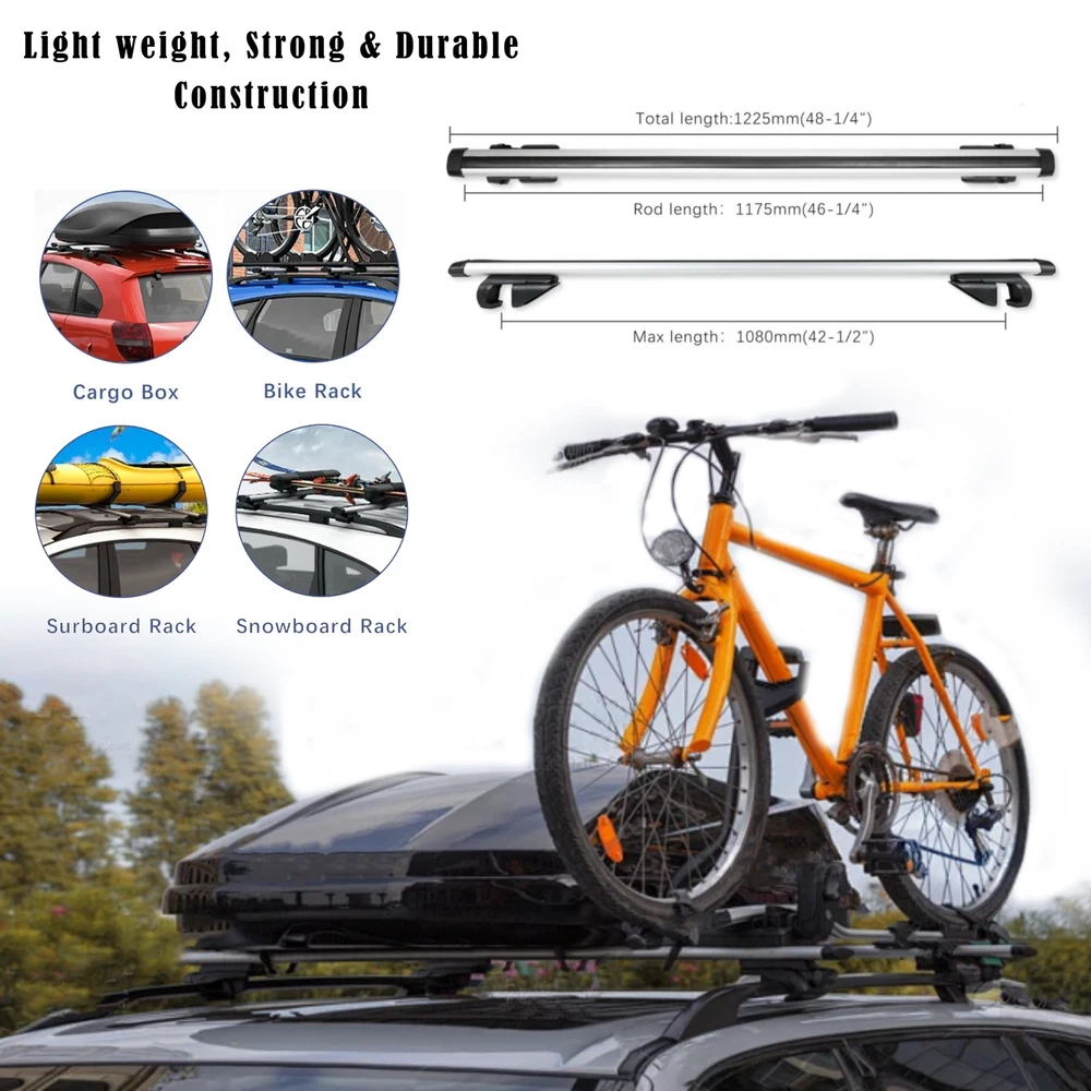 Vehicle Fitment Guide: 1.Universally for vehicles with an existing roof side rail system 2.Do not fit flush mounted or round/oval shaped roof rails 3.Please measure the dimension of the factory roof side rail to make sure our clamps is big enough to fit your application & your vehicle tower distance is not over 42 inches before purchasing 4.If you have problems with the installation, please contact us or go to a professional modification store for help. Features: Large Load Capacity: They are made of high-strength aluminum alloy and specially designed for distributing the load evenly, powerful enough to bear objects with a maximum weight of 150kg, hard to break. Locked Mechanism: Built-in locking system on roof crossbars to prevent it from being stolen. And locks & keys will help you to remove the ends for cleaning the crossbar inside or draining the water. Strong Clamp: The inside of each clamp is designed with rough surface for a tight, firm, hard-to-shake and secure clamping effect. Additionally, it can prevent the damage to the paint. Wide Application: They are widely used for cargo transportation, such as kayaks, canoes, luggage, snowboards, ski bikes, fishing rods, etc. Specifications: Material: Aluminum Alloy Load Capacity: 150kg Fitting Clamps Inner Width: Max 6cm/2.4in Product Size: about 120 x 7 x 5.5cm/47.2 x 2.8 x 2.2in Rod Length: about 120-124cm/47.2-48.8in Package Included: 2x Adjustable Aluminum Cross Bar 4x brackets and necessary mounting hardware for installation. Built-in lock & key On Jan 16, 2025 at 13:59:47 PST, seller added the following information: