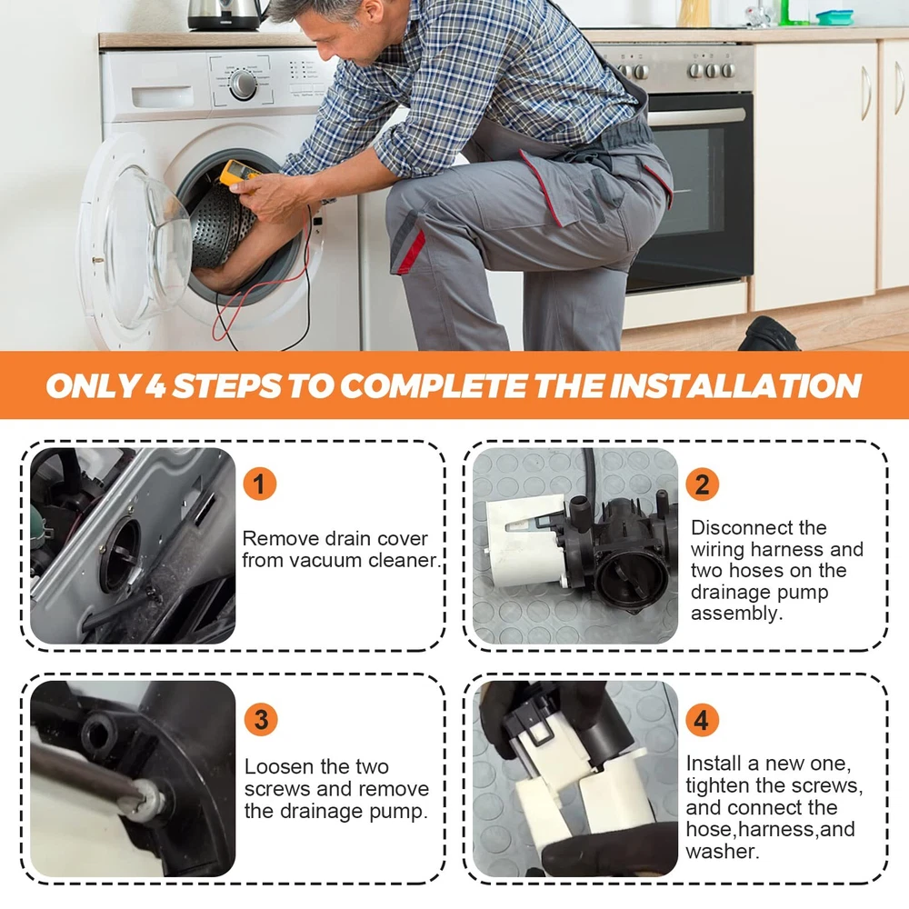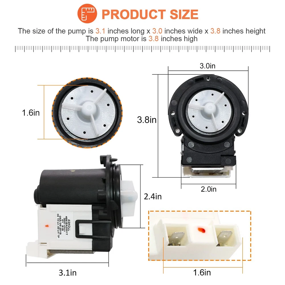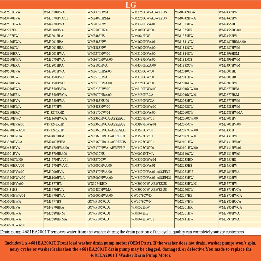 PACKAGE INCLUDE:1*4681EA2001T Washer Drain Pump for GENUINE OEM PART INSTALLATION TIPS:Before replacing the part, disconnect your washer from its power source and turn off the hot and cold water supplies. Helpful tools include 2 screwdrivers basin to catch water Towels / rags small plastic baggies to keep the screws marker to mark the baggies.Taking photos of the wire setup will make assembly easier. FIXES THE FOLLOWING SYMPTOMS: Will not drain Noisy Pump but will not spin Washer leaks Clothes are wetter than usual WORKS WITH MOST BRANDS:Replacement part for kenmore and LG Washing machine WORKS WITH THE FOLLOWING MODELS NUMBER: Kenmore79640518900 79641028900 79641072310 79641073310 79641172210 79641182310 79640272800 79640272900 79641002610 79641003610 79641072311 and more. LGWM1333HW WM1355HR WM1355HW WM1811CW WM1812CW WM1814CW WM1815CS WM1832CW WM2010CW WM2011HW WM2016CW WM2016CW/00 WM2016CW/01 and more. PLEASE NOTE:The brand name or model designation for this product is made solely for purposes of demonstrating compatibility. Thanks. [๐ฐ๐ฒ๐ด๐ญ๐๐๐ฎ๐ฌ๐ฌ๐ญ๐ง ๐๐ ๐๐ฅ๐๐๐ก ๐ฃ๐จ๐ ๐ฃ ๐ฅ๐๐ฃ๐๐๐๐๐ ๐๐ก๐ง]OEM 4681EA2001T M3379-65468 Front load washer drain pump motor rated voltage is 120V-127V 60Hz 85W 1.4A 45L / Min.The AP5328388 lg washer water pump motor consists of a motor component and a filter housing. The detachable filter housing makes it easier to clean the water pump during regular use and maintenance. Additionally, adding a sealing ring can make the water pump operate more smoothly and is quiet when running, which is made of premium quality materialafter many factory inspections OEM 4681EA2001T Original Version lg washing machine drain pump [๐ฃ๐๐๐๐๐๐ ๐๐ก๐๐๐จ๐๐๐ฆ]1 x OEM Lg washer drain pump 4681EA2001T AP5328388 removes water from the washer during the drain portion of the cycle. 4681EA2001T front load washer drain pump motor can make the dryer work more quietly. OEM 4681EA2001T washer drain pump motor can solve the following problems: โ Washer will not drain โกWasher pumps wonโt spin โขNoisy cycles โฃWasher leaks. Youโll just need disconnect the power and water supply. Use a Phillips screwdriver, locking pliers, needle nose pliers, towel, and small flathead screwdriver etc tools. Only takes 30 to 60 minutes to complete on your own, which will save you maintenance costs and labor costs [๐ฏ๐ฒ๐ฑ ๐๐๐ฌ๐ฆ ๐๐จ๐๐ฅ๐๐ก๐ง๐๐]OEM 4681EA2001T drain pump washing machine ๐๐๐ฝ๐ฝ๐ผ๐ฟ๐๐ ๐ฏ๐ฒ๐ฑ ๐๐๐ฌ๐ฆ ๐๐๐ง๐๐ฅ-๐ฆ๐๐๐๐ฆ ๐ฆ๐๐ฅ๐ฉ๐๐๐. Our company attaches great importance to the shopping experience of each customer.Risk-free shopping, If you have any quality problem about 4681EA2001T washer drain pump assembly during guarantee period, please contact customer service in time. We will try our best to solve the problem. Customer satisfaction is our tireless pursuit [๐ฆ๐จ๐๐ง๐๐๐๐ ๐๐ข๐ฅ ๐ ๐ข๐ฆ๐ง ๐ช๐๐ฆ๐๐๐ฅ๐ฆ]Genuine OEM 4681EA2001T Washer Drain Pump fit for Kenmore and LG washing machine wm3001hwa, wm8000hva, wm8000hwa, wm2550hrca, wm2550hwca, gcw1069cs, wm3550hwca, wm3070hra, wm4070hva, wm3070hwa, wm2350hrc, wm3360hvca, wm2350hwc, gcw1069qs, wm2650hra, wm3360hrca, wm3360hwca, wm3150hvc, wm2650hwa, wm2655hva, wm3885hcca, wm3150hwc, wm3885hwca, wm2250cw, wm2450hra, wm3987hw, wm3470hva, wm3470hwa, lswf388hvs, wm3550hvca, wm2455hg, wm2277hb, wm2487hrma, 48231009799, 48231010108, cw2079cwd, cw2079cwn, f1201fd, f1201fd1, f1201fdp, f1201fdp1, f1216fds, f1216fds1, f1253fds, f1253fds3, f1254fd, f1254fd1, f1254fd3, f1305fdm, f1314fds [๐๐๐ฆ๐ฌ ๐ง๐ข ๐๐ก๐ฆ๐ง๐๐๐]4681EA2001T Replaces part numbers: WD-11270RD, WD17VTS6, WD17VVS6, 4681EA1007D, 4681EA1007G, 4681EA2001D, 4681EA2001N, 4681EA2001U, 2003273, AP5328388, PS3579318, EAP3579318.โคBefore installing 4681EA2001T Washer Drain Pump, you should prepare a Nut driver, screw driver and locking pliers, and disconnect the power and water supply. Remove the drain cover on the cleaner, disconnect the wiring harness and two hoses on the drain pump assembly. 2 washers on the tilted back leg. Loosen the two screws and disassemble the drain pump. Install a new one and tighten the screws.Connect hoses, wiring harnesses and gaskets