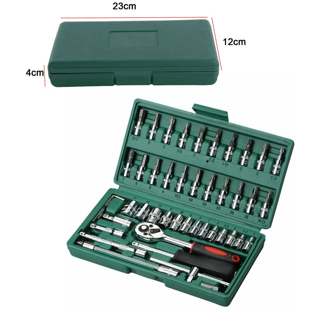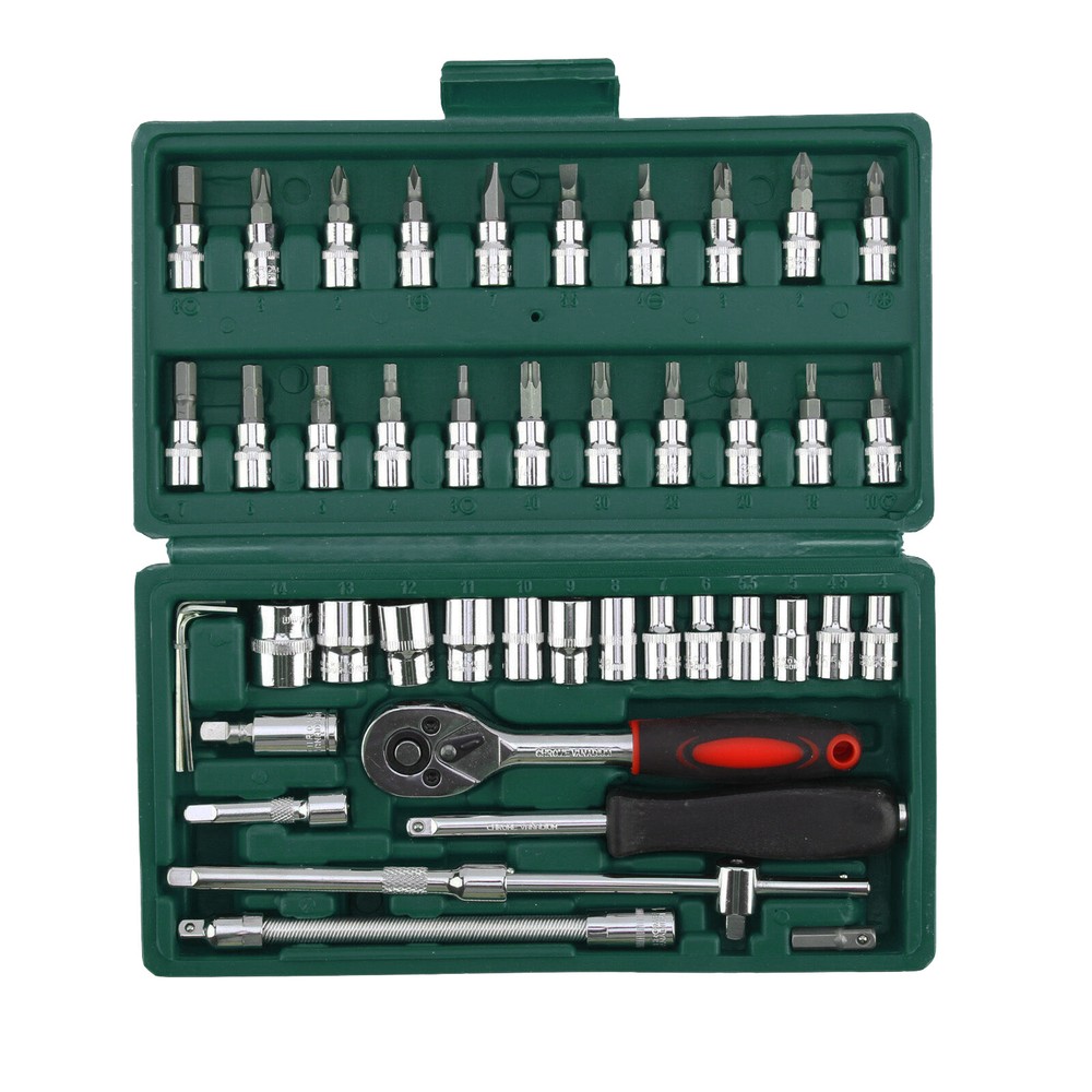 46pcs Socket Ratchet Wrench Set 1/4" Drive Flexible Car Repairing Tools Kit Description: Main functions: 1. The screwdriver handle can meet batch head (a word cross T word plum blossom socket head hex extension rod universal joint can receive bending bar) 2. The socket using high-quality chrome vanadium steel 50 bv30 cold-press forming, torque 50% higher than that of carbon steel, use inferior smooth surface processing, good rust prevention effect. Batch head adopts cr-v materials, stronger hardness, toughness is higher. 3. Rapid fall off ratchet wrench (positive and negative adjustable), The push button quick release feature ensures taht the socket is locked securely while in use, but also allows for easy removal or quick change of socket evev with greasy or oily finger. and our high quality 45 teeth ratchet can improve the operation speed. Is open throttle, in air conditioning, seat nut, tire fenders, car door locks, home (basic contains) usually used in the suit small screw nut the ideal of a set of tools. Material: High-carbon steel Color: As picture shows The max. size: Approx.14mm Set Contents: Flowers Hex: T10 / T15 / T20 / T25 / T30 / T40 Inner flat head hex: H3 / H4 / H5 / H6 / H7 / H8 A word: SL4 / SL5.5 / SL7 Cross: PH1 / PH2 / PH3 M word: PZ1 / PZ2 / PZ3 13-1/4" DR Sockets: 4-4.5-5-5.5-6-7-8-9-10-11-12-13-14MM 3-hex key wrenches: 1.5/2.0/2.5MM 1-1/4" DR universal joint 1-1/4'' X2'' extension bar 1-1/4'' X4'' extension bar 1-1/4'' X6'' flexible extention 1-1/4'' DR sliding T bar 1-1/4'' quick ratchet handle 1-6'' spinner handle 1-bit adaptor 1- blow case Included: 1 X Repairing Kit(46pcs)