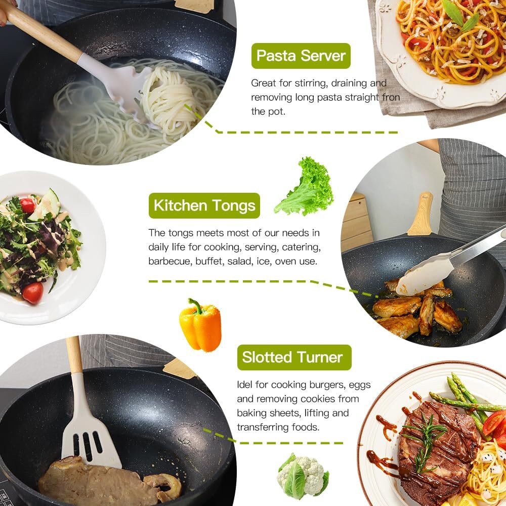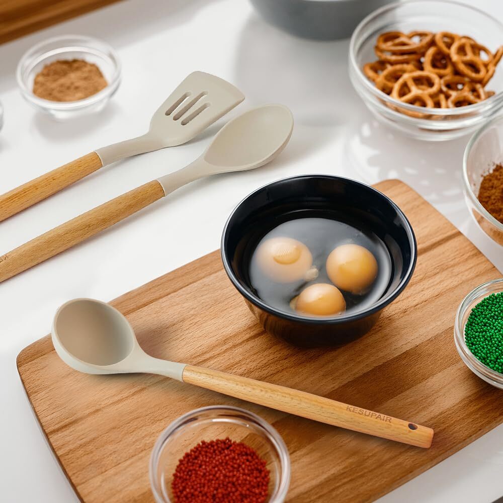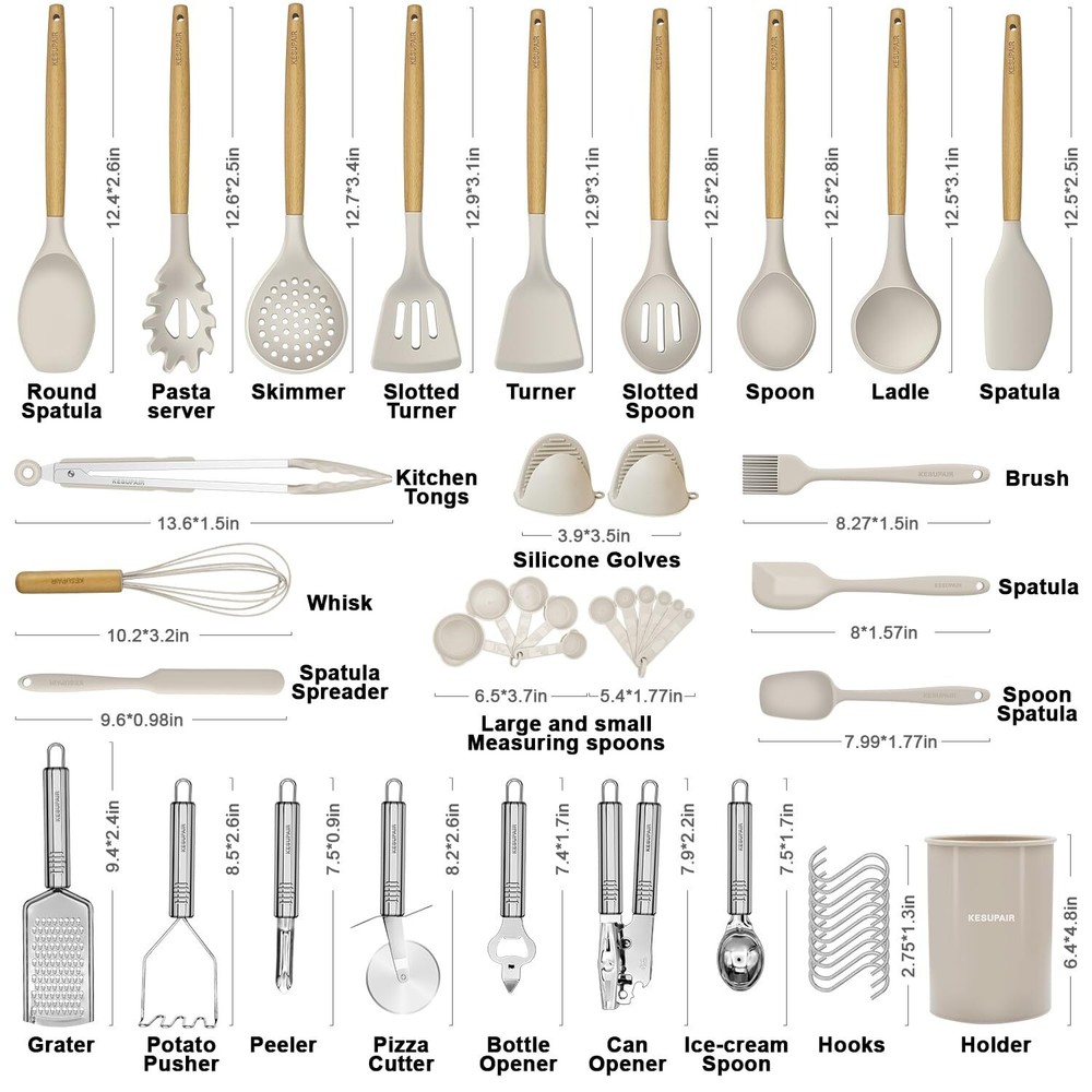 This silicone kitchen set is a game-changer! The 46-piece collection has every tool I need, from spatulas to tongs, all with sturdy wooden handles and heat-resistant silicone heads. The khaki color looks elegant, and the included holder keeps everything organized. The quality feels premium, and they're so easy to clean—no more melted plastic utensils! Perfect for everyday cooking or gifting. Love that it even comes with handy extras like a peeler and grater. Definitely worth the investment for any home chef!