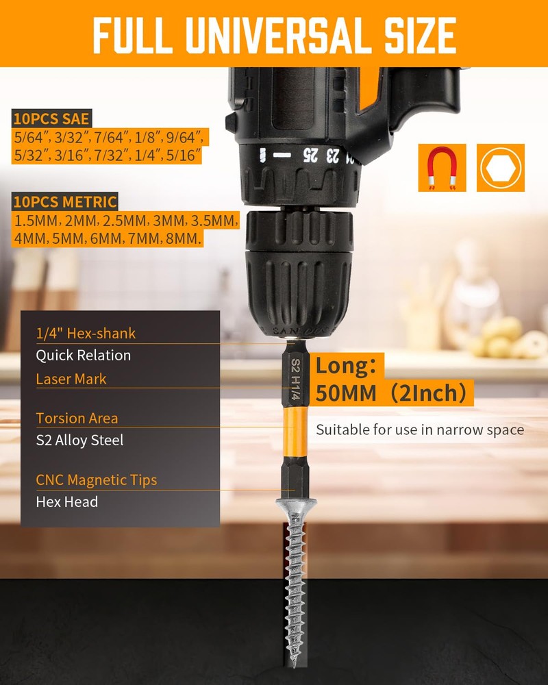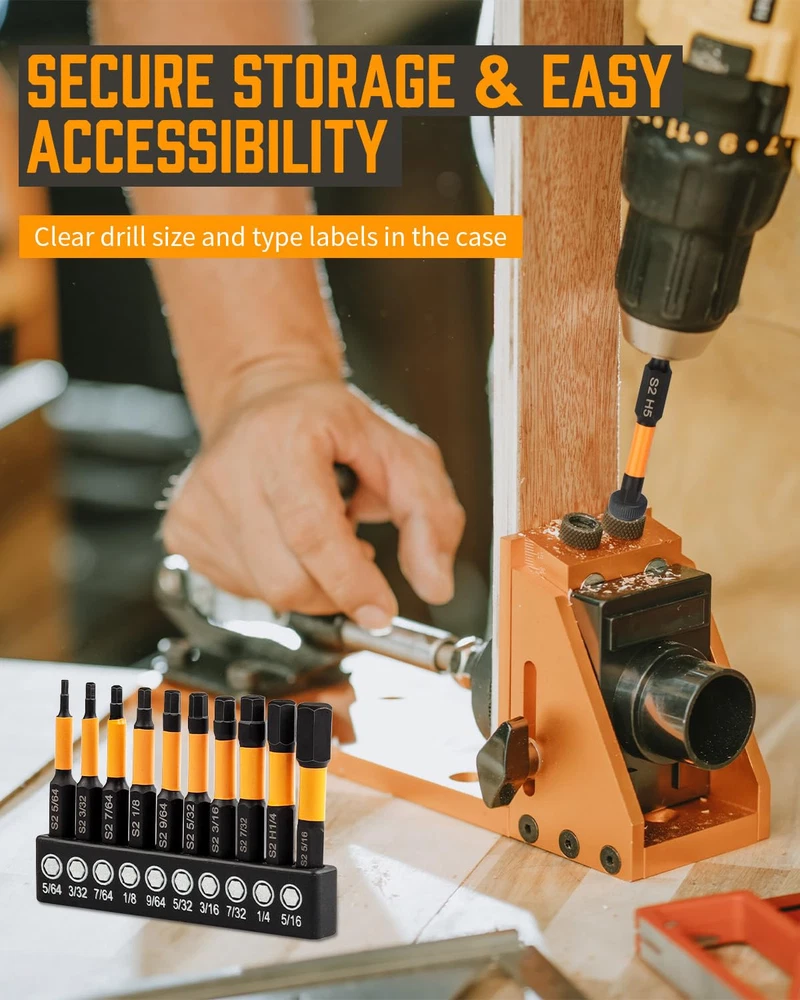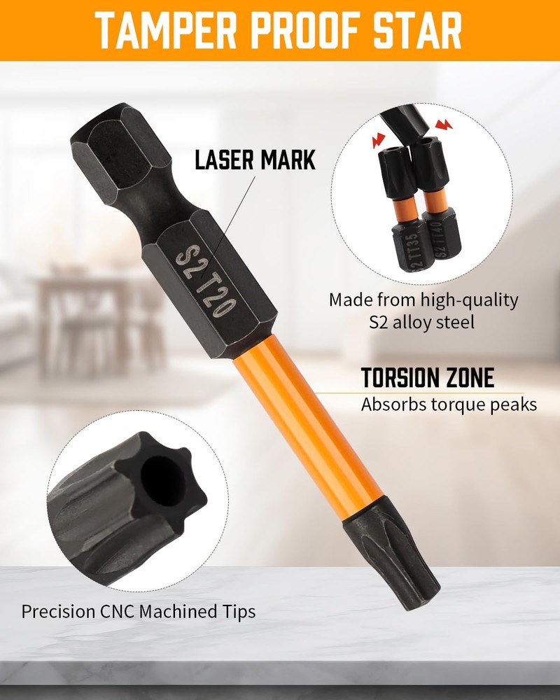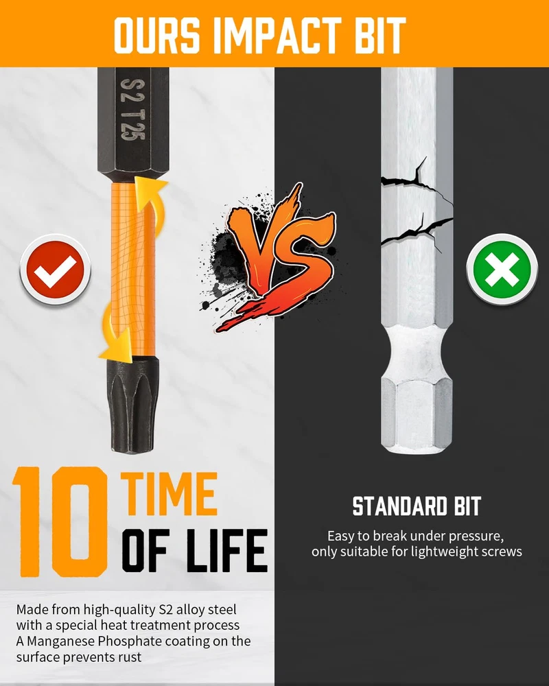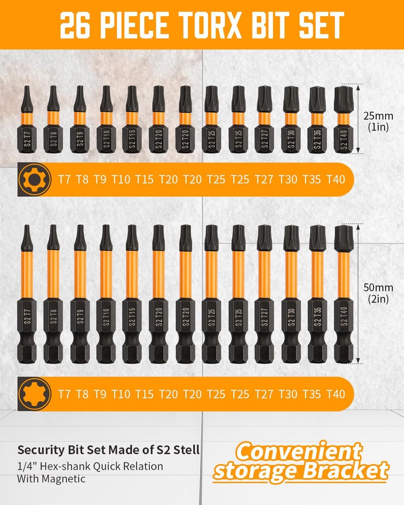 Robust for Longevity - Made from high-quality S2 alloy steel with a special heat treatment process that enhances their resistance to wear and tear. a Manganese Phosphate coating on the surface prevents rust, Each bit features a specially designed torsion zone that absorbs torque peaks, significantly reducing the risk of breakage during intense screw driving tasks. Enhanced Magnetic Impact bit Design - Each Drill bit set is expertly crafted with a reinforced magnetic impact tip, The magnetism remains strong after multiple uses, magnetic tips provide a firm grip on screws, minimizing slippage and increasing safety. Hex bit set is ideal for professionals and DIY enthusiasts. 20 Pcs Hex Bit Set - The allen wrench drill bit set includes a wide range of sizes, both in SAE and metric measurements, 10pcs SAE-5/64",3/32", 7/64", 1/8", 9/64", 5/32", 3/16", 7/32", 1/4", 5/16". 10pcs metric-1.5mm, 2mm, 2.5mm, 3mm, 3.5mm, 4mm, 5mm, 6mm, 7mm, 8mm. 1/4" hex-shank quick Relation 26 PCS Security Torx Bit Set - Includes 13pcs 2" torx bits - t7, t8, t9, t10, t15, t20*2, t25*2, t27, t30, t35, t40, 13pcs 1" tamper proof torx bits - t7, t8, t9, t10, t15, t20*2, t25*2, t27, t30, t35, t40. This torx set has you covered with all the essential sizes and styles, ensuring you're never without the right tool. Secure Storage and Easy Accessibility - Keep your workspace organized and your bits at your fingertips with the included durable case. Each bit is securely held in place, ensuring they are easy to find, , and transport. The clear labeling of bit sizes and types in the case makes selection quick and hassle-free, enhancing your efficiency Versatile Compatibility and Application - bit set is designed to be universally compatible with most drills and drivers on the market. The material ensures exceptional durability and longevity, making them perfect for heavy-duty use in various applications, including automobiles, home repairs, and woodworking.