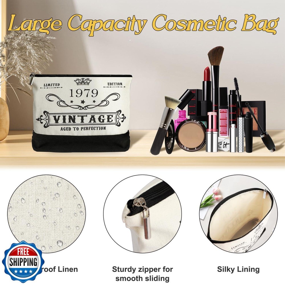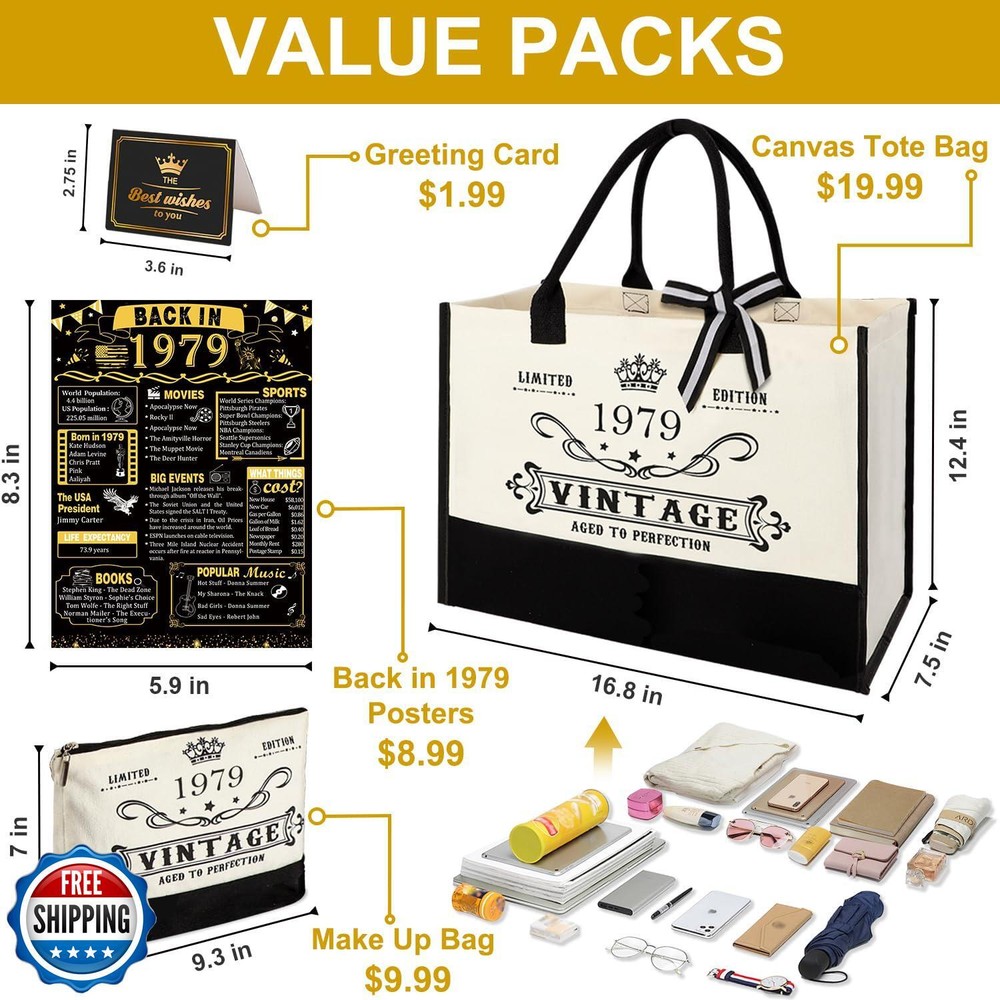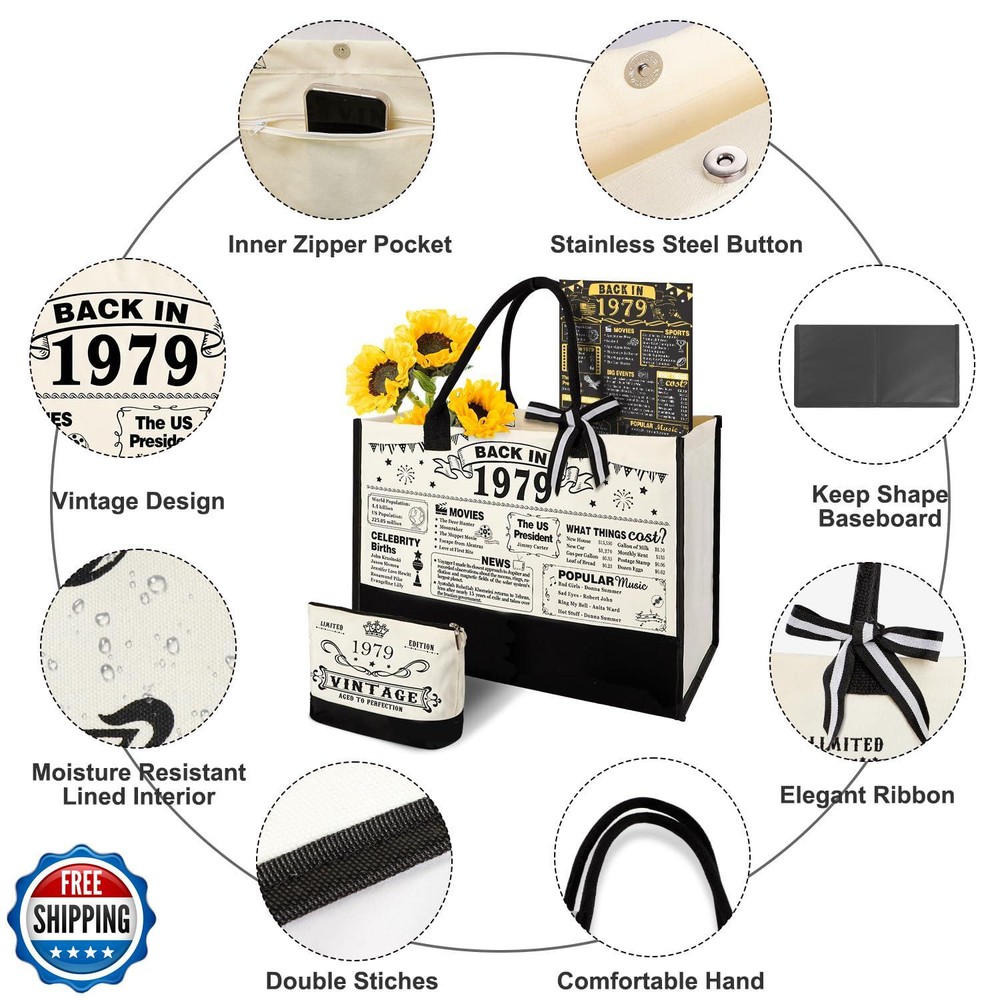 46th Birthday Gifts for Women Canvas Tote Bag Travel Gear, Unique 46 Years Old Birthday Gifts for Girlfriend Sister Friends Her, Vintage 1979 Handbag and Cosmetic Bag and Back in 1979 Poster Features Great Gift for Her 46th Birthday: This gifts set for 46th birthday women contains: 1 X 1979 beach bag, 1 X cosmetic bag, 1 X back in 1979 poster, 1 X greeting card. Unique canvas tote bag gifts set will be a adorable gift for women's 46th birthday. This birthday 46 gifts themed idea makes the perfect choice for putting a smile on her face on their special day. 46th Birthday Present Idea: The tote bag cover and back in 1979 poster are filled with fun facts and trivia from 1979, making it a great gift idea for women's 46th birthday. The 46th Birthday basket is for women who was born in 1979 and ready to celebrate their 46th birthday, to relive fond memories of the past with family and friends. It is a thoughtful 46th birthday gift box for women who was born in 1979. Easy to Clean and Reusable: This canvas tote bag is made of cotton canvas which is easy to clean. Features a bottom gusset and reinforced handles with double stitching for durability. The interior is covered with a waterproof layer to help you avoid dampness. The cosmetic bag is made of 100% linen material, with a waterproof coating and silky lining on the inside, so you don't need to worry about the bag contents getting wet. Large Capacity Tote Bag: Our 46th birthday tote bag for women is designed to accommodate all your essentials. With large capacity (16.8”L*12.4”H*7.5”W), tote bag is easily contained clothes, shoes, beach towels, snacks, an iPad and magazines, and etc. It has an inside zippered pocket for valuables. The size of cosmetic bag is 9.3”W x 7”H. Roomy enough to hold your basic beauty supplies. Versatile Gift: This funny 46th birthday gifts for women is a perfect gift idea for your sister, granddaughter,friends, female coworkers, classmates, girlfriend, daughter on their 46th birthday. Perfect for daily use, shopping, travel, beach, picnic, party, office work, etc. It is also a great gift choice for Christmas, Thanksgiving, New Year's Eve, Valentine's Day etc. Shipping Free & Fast Shipping: We offer free shipping to most of the USA with a normal delivery time of 3-7 days. However, due to the current situation, additional delivery time (up to 3 weeks) may be required for some items. Alternative Carriers: We may use alternative carriers (e.g., USPS, FedEx, UPS) to ensure your package arrives safely and on time. Due to the use of multiple carriers, we are unable to provide a tracking number automatically. Handling Time: Orders are processed and shipped within 1-2 business days of receiving cleared payment. Shipping Restrictions: Shipping to Alaska, Hawaii, Puerto Rico, Guam, and other US territories may incur shipping charges or delivery restrictions. Please contact us before ordering, or your order can be refunded/cancelled. State Restrictions: Certain items may not be shipped to California due to state regulations. Contact for Tracking Updates: If you require tracking updates or have any concerns about the delivery of your order, please feel free to contact us, and we will be happy to assist you. Return Policy 30-Day Hassle-Free Returns: If you are not completely satisfied with your purchase, you can return the item for free within 30 days of receiving it for a full refund or exchange. Easy Return Process: Contact us, and we will provide you with a prepaid return shipping label and detailed instructions. No Restocking Fee: There are no restocking fees for returns. However, the buyer is responsible for return shipping costs if the return is not due to a seller"s error. Refund Processing: Refunds will be processed within 1 business day of receiving the returned item in its original condition. Feedback Your feedback is extremely important to us. We strive to provide the best products and customer service possible. If you are satisfied with your purchase, please take a moment to leave us a positive review. If you have any concerns or issues with your order, please contact us before leaving negative feedback. We are committed to resolving any problems and ensuring your satisfaction. Contact Us If you have any questions or concerns, please feel free to reach out to our customer support team. You can contact us through the eBay messaging system. We are available Monday to Friday, 9:00 am to 5:00 pm EST, and we will do our best to respond to your inquiry within 24 hours. Thank you for supporting our small family business!
