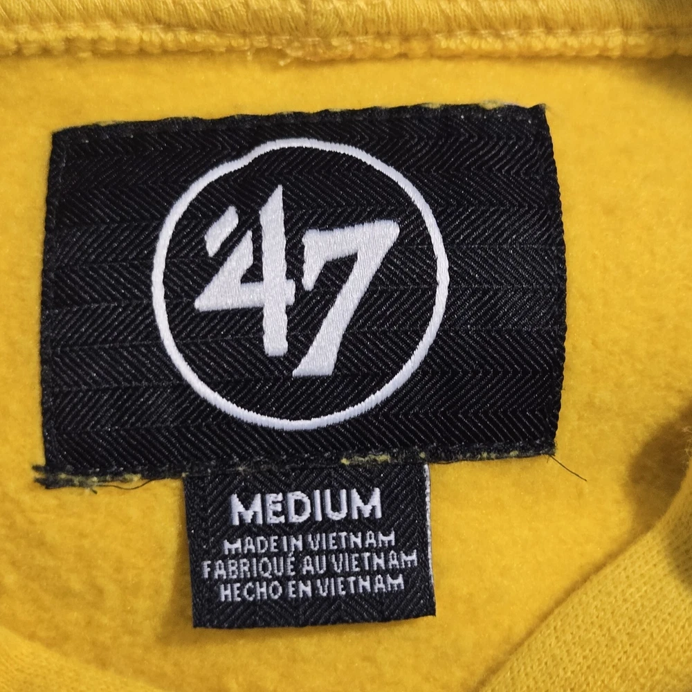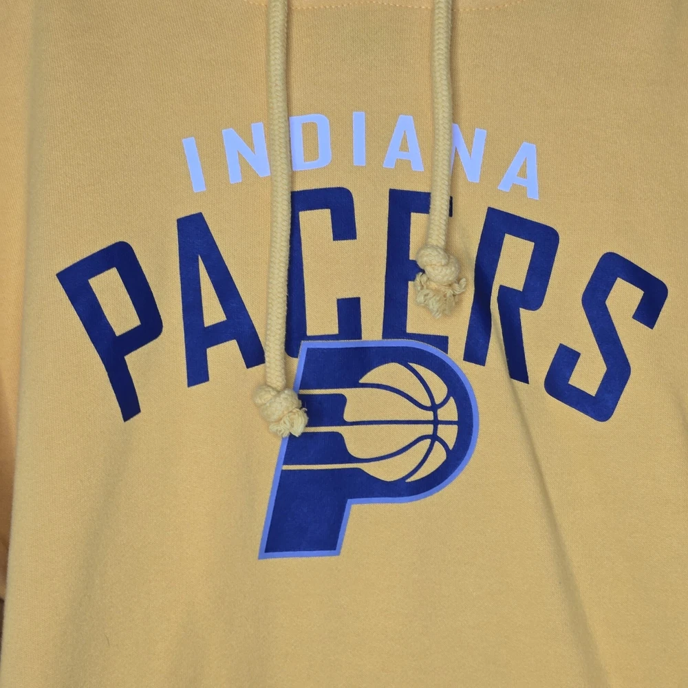 The '47 Brand NBA Indiana Pacers Hoodie Sweatshirt in yellow and blue is an officially licensed product featuring the Indiana Pacers team logo. Made for unisex adults in size medium, this sweatshirt is suitable for basketball fans looking to support their team in style. This sweatshirt is perfect for wearing during the NBA regular season games to stay warm and show team pride. The measurements are 23" front chest and 26" length. It is preloved in excellent condition.