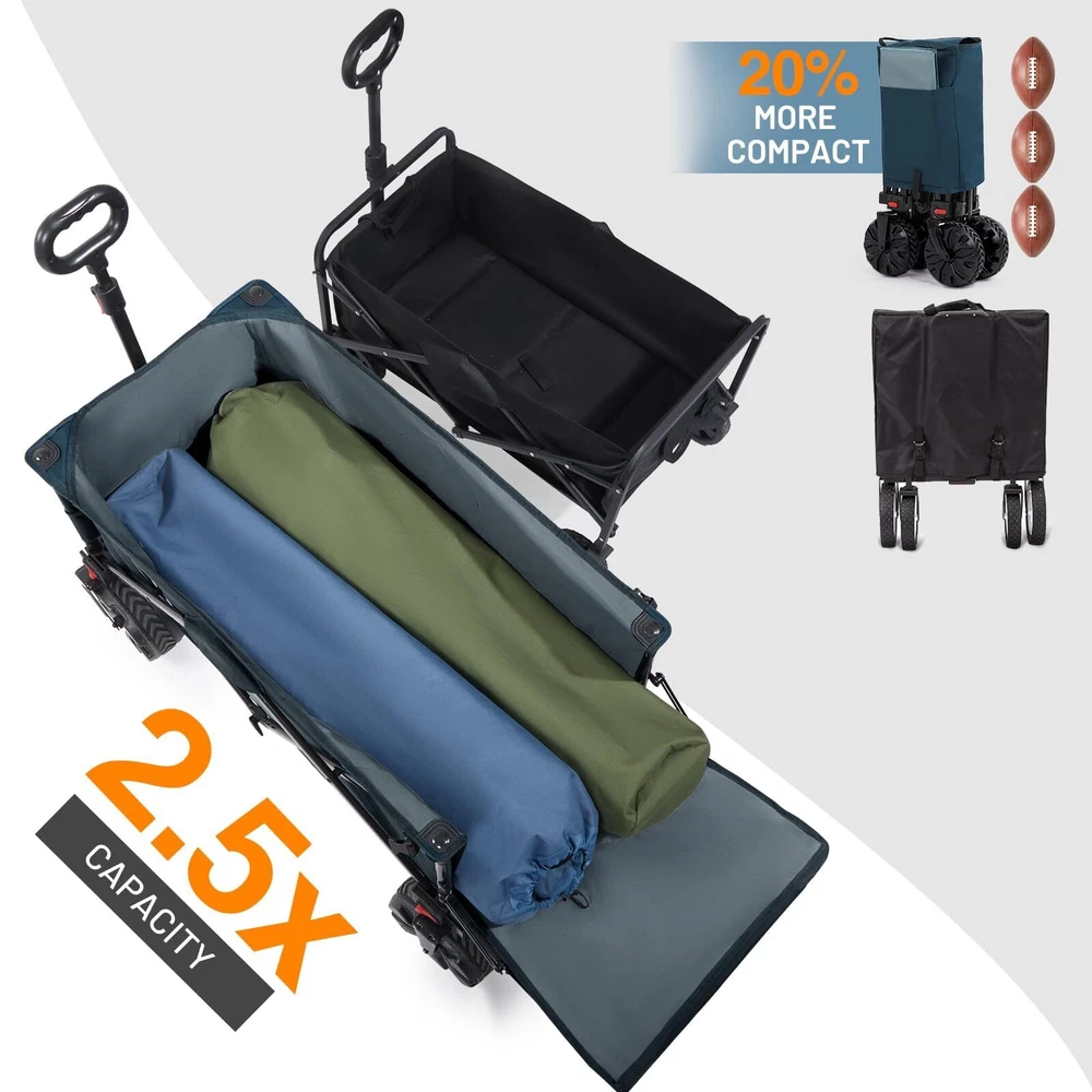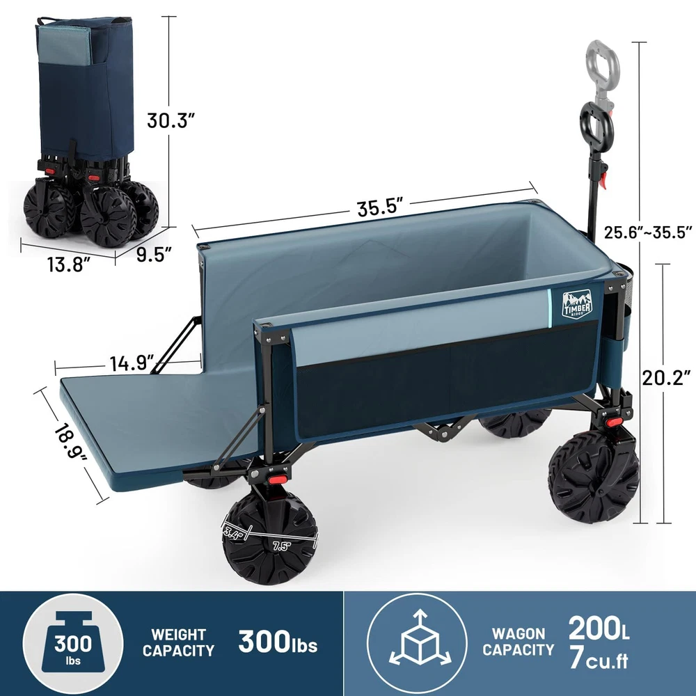LONGER & SPACIOUS: This collapsible wagon features a foldable tailgate, great for a 10x10ft pop-up canopy, and offers a storage capacity of up to 200 L/7 cu.ft, 50% more than other wagons. It is also very friendly to pet dogs, able to get in and out easily ALL-TERRAIN WHEELS: Equipped with 7.5"x 3.4" big wheels, this beach wagon cart ensures easy maneuverability with 360° rotating front wheels, ideal for camping, shopping, or gardening without causing fatigue STURDY FRAME: Crafted with a heavy-duty alloy steel frame supporting up to 300lbs, and featuring long-lasting 500D Oxford fabric, this folding wagon is built to last; the mesh bottom allows for easy cleaning with water AMPLE STORAGE: The heavy duty wagon includes 2 cup holders and oversized side pockets for convenient storage; the utility cart handle can be adjusted from 25.6" to 35.5" to accommodate different heights, ensuring a comfortable experience QUICK FOLDING: No assembly required, simply lift from the bottom and fold away in seconds; with a compact size of 13.8 "x9.5 "x30.3", it can be stored easily in a suitcase, garage, or closet for convenient transportation BELIEVE US: At , each product is meticulously crafted with care and supported by our dedication to ensuring customer contentment. Should any concerns arise, our assistance is readily available