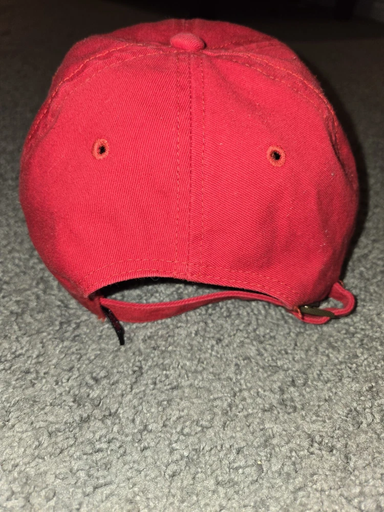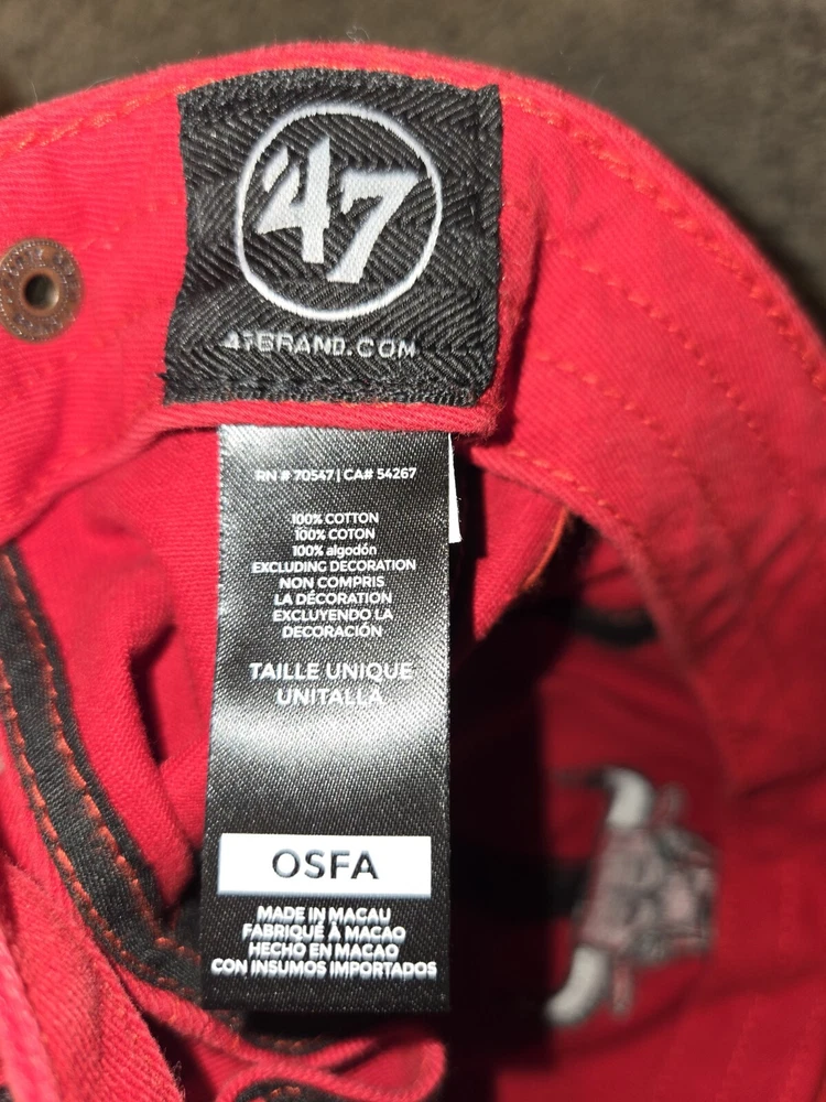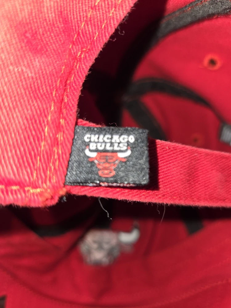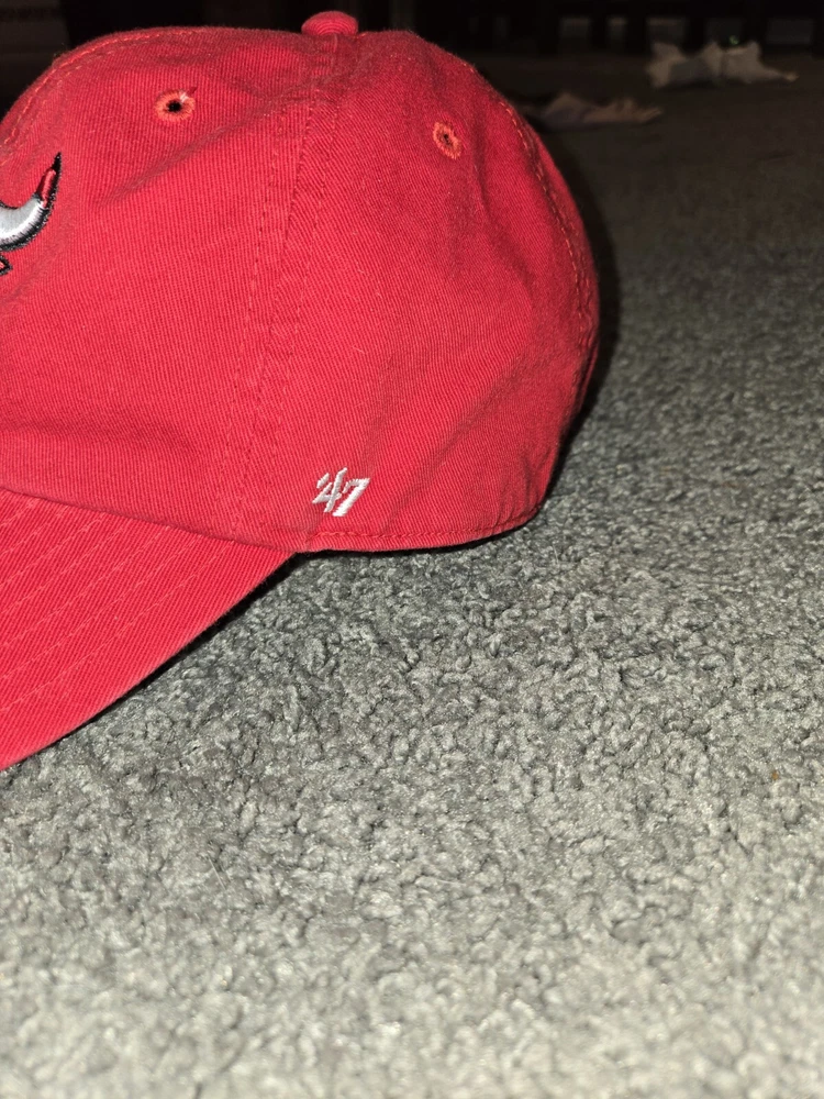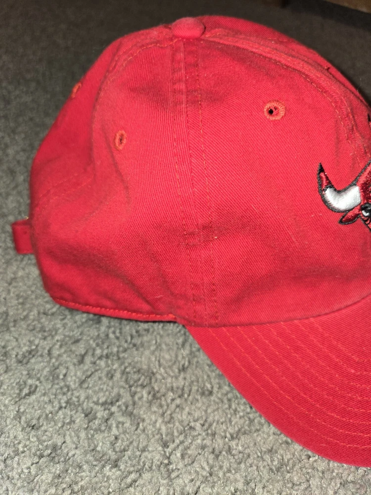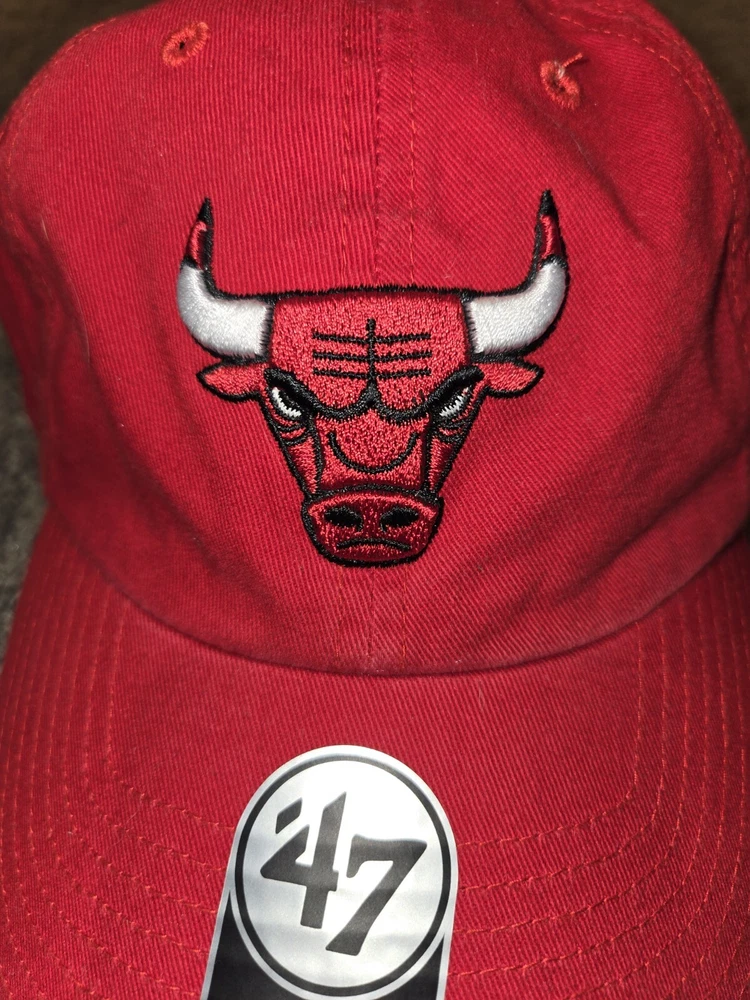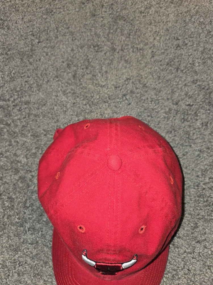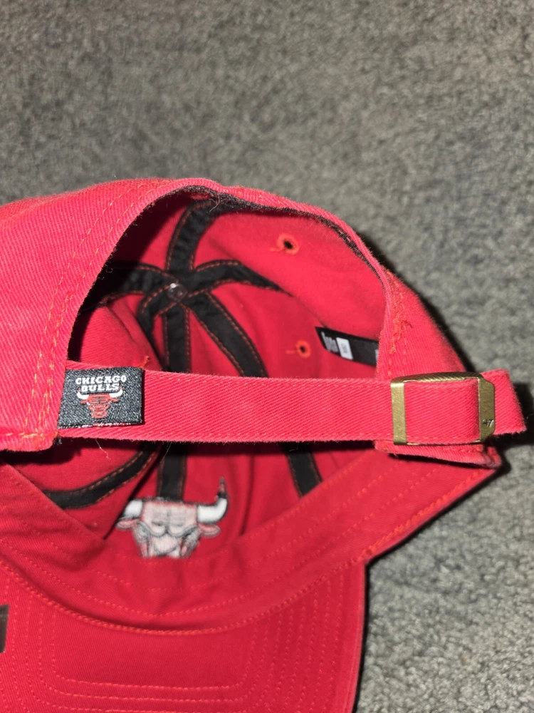 This is a vintage '47 brand Chicago Bulls baseball cap in red, with an adjustable strap for a comfortable fit. It features the NBA team's logo and is designed in a solid color style. Perfect for men who are fans of the Chicago Bulls or sports enthusiasts looking for a stylish accessory.