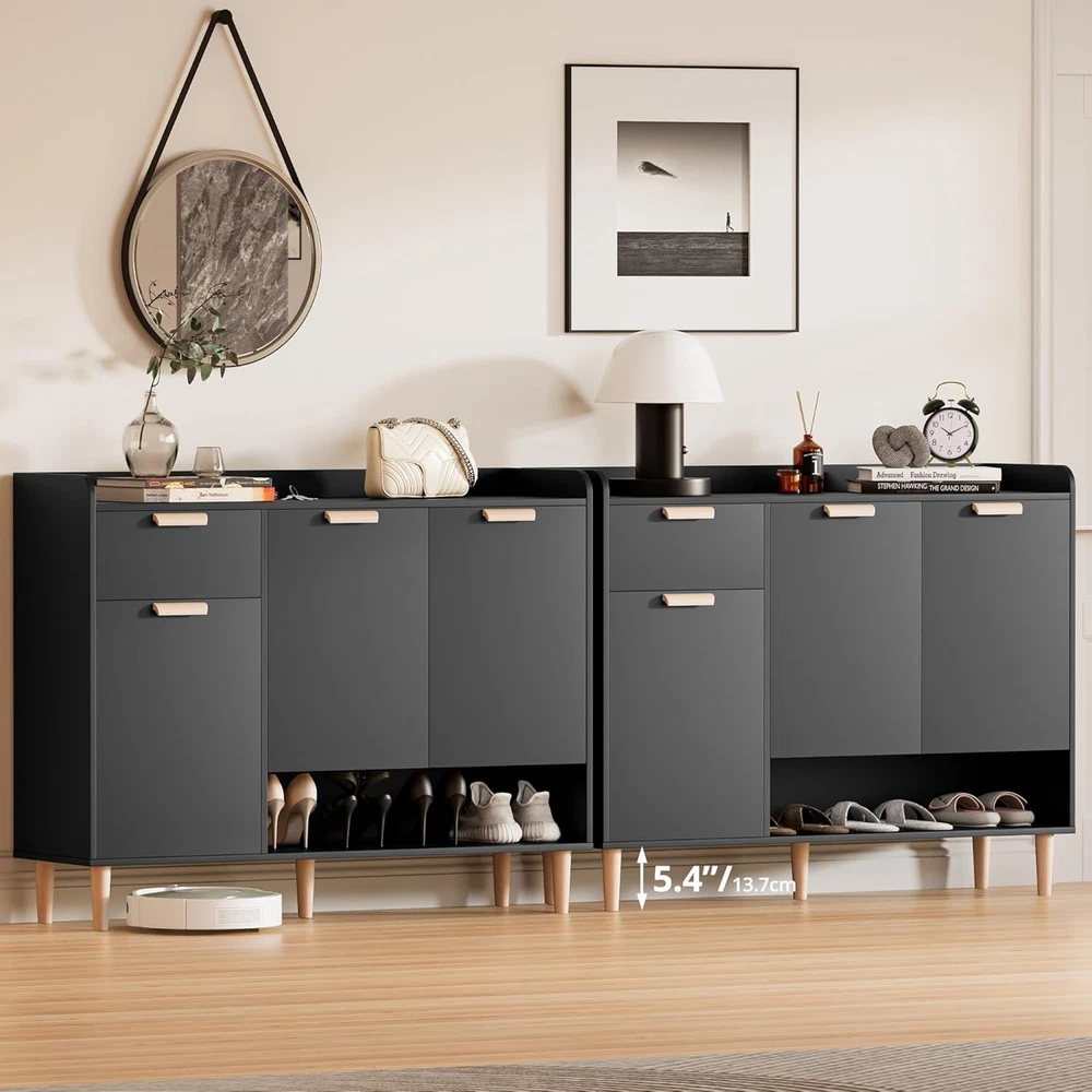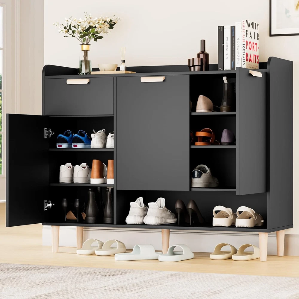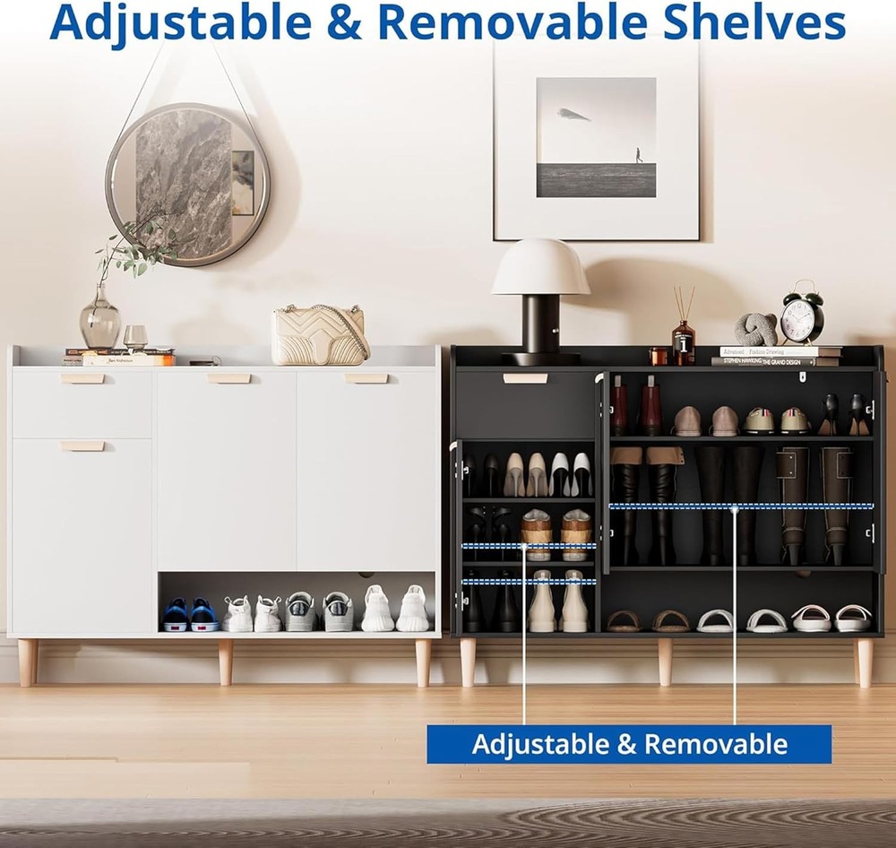 Product Description About this item Modern Shoe Cabinet:The modern shoe rack features clean lines and a sleek design, perfect for keeping shoes organized. Its stylish look fits seamlessly in entryway, hallway or bedroom,adding a touch of elegance to any contemporary space 4 Adjustable Shelves: This shoe stand has 4 adjustable shelves. You can adjust the height according to your needs to accommodate flat shoes, mid-tube shoes or long-tube shoes to accommodate shoes of different sizes and complete organization Extra Storage Space:The top desktop is spacious for potted plants or decorations. The drawer is a good place to put shoelaces and keys. In addition, there is an open shoe rack at the bottom to accommodate wet shoes Unique Door Design:The shoe cabinet storage for entryway is made of solid MDF and will become a decorative entry furniture in your home. The door design prevents dust from entering and prevents odors Durable and Stable Structure: The shoe shelf is equipped with durable hinges, and the door panels are easy to open or close for long-term use. In addition, the metal cabinet anchors ensure stability and safety to prevent tipping over Easy to Assemble: Our wood shoe rack comes with all essential accessories and a detailed graphic installation guide, making assembly a breeze. Any question? Please feel free to let us know and solve it The video showcases the product in use. The video guides you through product setup. The video compares multiple products. The video shows the product being unpacked. video Merchant Video Say Goodbye to Clutter, Embrace Organization: Welcome the Tidiness! Previous page Next page