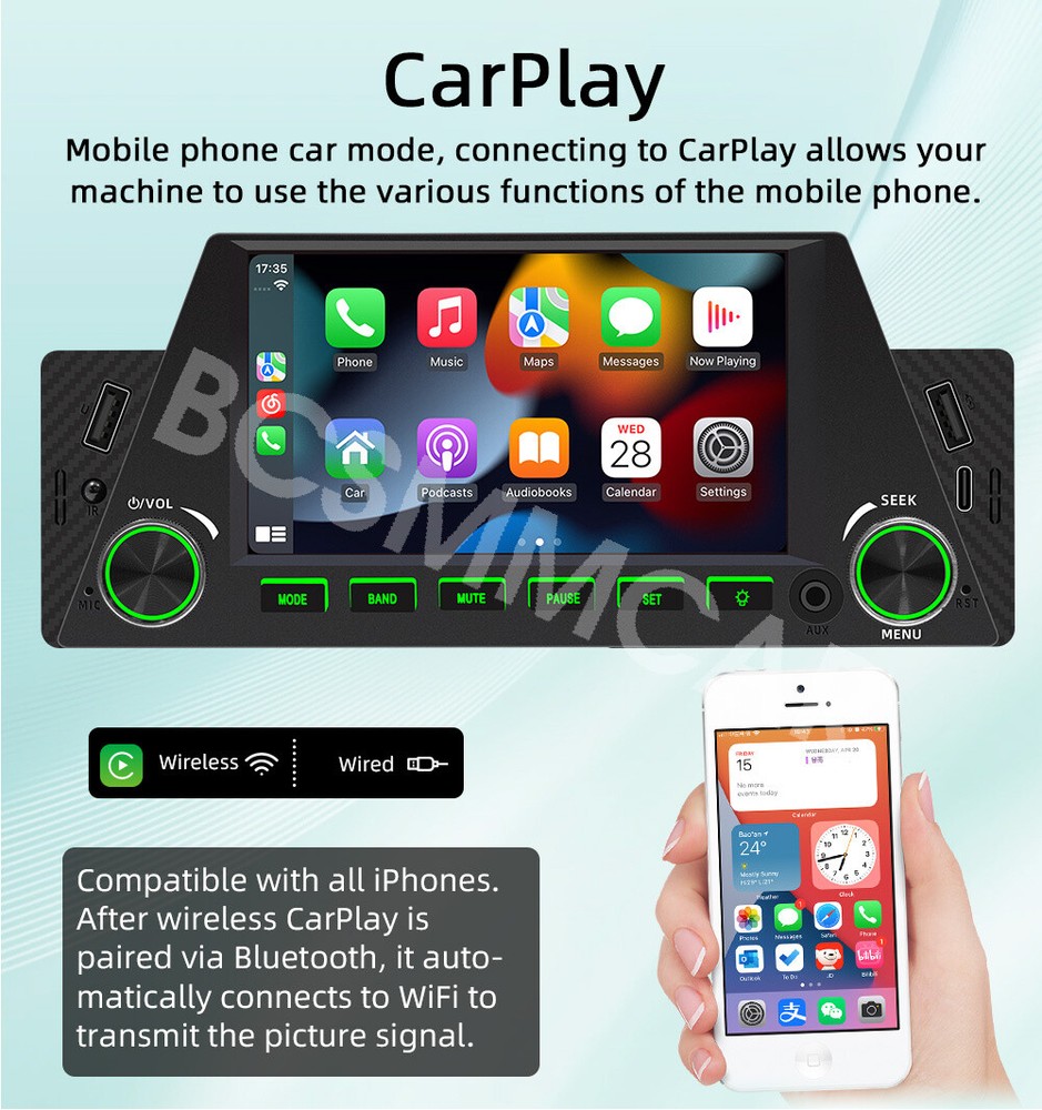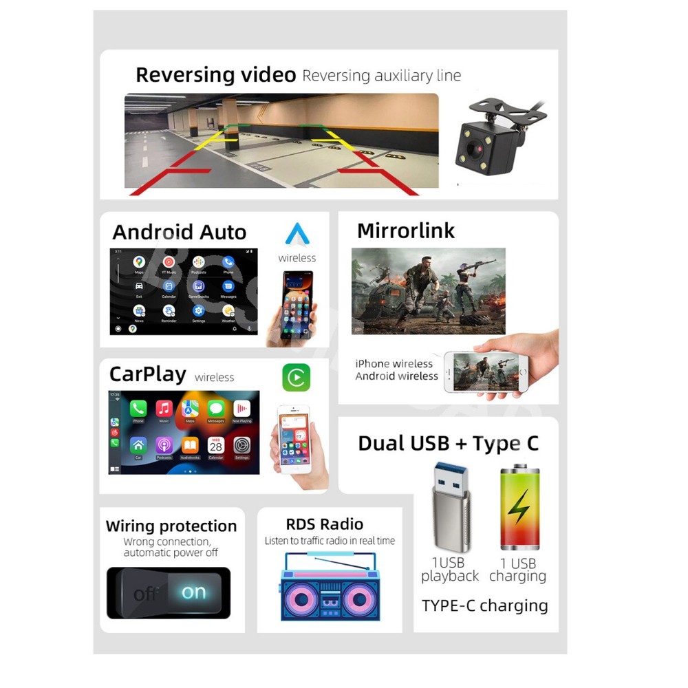 Product View Detail With 4LED Camera 1 Din 4.7inch MP5 Car Radio Multimedia Video Player Bluetooth Mirror Link FM Stereo For Wireless Android Auto Caplay Dual USB Note:Not is universal , Please check with your car panel's size !!! Basic parameters Model :161W Type: Car MP5 System: Overview Melis System Software solution: F133 Radio frequency: FM 87.5~108.0MHz AM 522~1620KHz (switchable between radio frequencies in China, America 1, America 2, Japan, Russia, Middle East, and Europe) Radio IC: SI4732 Amplifier IC: CD7388CZ Output power: 60Wx4 Working voltage: 12~14.4V Working temperature: -10~60 ℃ Bluetooth version: 5.1 (default name: SWL-BT) WiFi frequency: options include 2.4G, 5.2G, 5.8G, and can be used for wireless connections CPU: F133 Running memory: 533M Display resolution: 1280x720 Screen size: 4.7 inches Installation size: 178x52MM Shell size :188x83MM Host depth: 95MM Functional parameters Mobile Internet: Support Reverse image: support (included 4LED camera) Video playback warning: support Steering wheel control :supports button learning Video output: support USB: front USB charging+front USB 2.0 reading+rear USB 2.0 reading Reset button support Audio output: 2 channels (left channel+right channel) Video output :2 channels Rear external microphone input: support (optional external microphone configuration) Video input 1: channel Reverse video input: 1 channel Audio format: MP3/AAC/APE/OGG/M4A/RA/WAV Video format: H263/H264/H265/DIVX HD (720P 1080I 1080P) AVI/FLV/MKV/MPEG/MP4/WMV9/VC/ASF/TS/QT Image format JPEG/PNG/BMP/GIF/TIFF Language parameters:English, Chinese, French, German, Arabic, Italian, Japanese, Portuguese, Russian, Spanish, Hebrew, Polish, Türkiye, Czech, Dutch Factory password: 113266 Accessories 1. Host 2. Manual 3. Power cord 4. Remote control 5. Loading key (accessories, manual, packaging may be updated from time to time, subject to actual receipt) 6.4LED Rear Camera Basic functions 1. Radio 2. USB flash drive (audio/video/image) 3. Bluetooth function 4. RCA audio output can be connected to a subwoofer 5. Reverse rearview function 6. Video input 7. Original steering wheel learning function 8. Wired and wireless mobile phone interconnection; Wired and wireless Android AUTO/Apple CarPlay 9. Colorful lights 10. Rear USB 11. USB charging interface 12. Power supply positive and negative polarity reverse protection function 13. RDS function 14. TYPE-C charging interface Shipping Policy Payment Method Returns Policy Shipping Policy Payment Method Returns Policy Copyright © 2017 DataCaciques Home Payment Shipping About us Contact us BCSMMCAR Store Categories Store Categories Other Product View Detail With 4LED Camera 1 Din 4.7inch MP5 Car Radio Multimedia Video Player Bluetooth Mirror Link FM Stereo For Wireless Android Auto Caplay Dual USB Note:Not is universal , Please check with your car panel's size !!! Basic parameters Model :161W Type: Car MP5 System: Overview Melis System Software solution: F133 Radio frequency: FM 87.5~108.0MHz AM 522~1620KHz (switchable between radio frequencies in China, America 1, America 2, Japan, Russia, Middle East, and Europe) Radio IC: SI4732 Amplifier IC: CD7388CZ Output power: 60Wx4 Working voltage: 12~14.4V Working temperature: -10~60 ℃ Bluetooth version: 5.1 (default name: SWL-BT) WiFi frequency: options include 2.4G, 5.2G, 5.8G, and can be used for wireless connections CPU: F133 Running memory: 533M Display resolution: 1280x720 Screen size: 4.7 inches Installation size: 178x52MM Shell size :188x83MM Host depth: 95MM Functional parameters Mobile Internet: Support Reverse image: support (included 4LED camera) Video playback warning: support Steering wheel control :supports button learning Video output: support USB: front USB charging+front USB 2.0 reading+rear USB 2.0 reading Reset button support Audio output: 2 channels (left channel+right channel) Video output :2 channels Rear external microphone input: support (optional external microphone configuration) Video input 1: channel Reverse video input: 1 channel Audio format: MP3/AAC/APE/OGG/M4A/RA/WAV Video format: H263/H264/H265/DIVX HD (720P 1080I 1080P) AVI/FLV/MKV/MPEG/MP4/WMV9/VC/ASF/TS/QT Image format JPEG/PNG/BMP/GIF/TIFF Language parameters:English, Chinese, French, German, Arabic, Italian, Japanese, Portuguese, Russian, Spanish, Hebrew, Polish, Türkiye, Czech, Dutch Factory password: 113266 Accessories 1. Host 2. Manual 3. Power cord 4. Remote control 5. Loading key (accessories, manual, packaging may be updated from time to time, subject to actual receipt) 6.4LED Rear Camera Basic functions 1. Radio 2. USB flash drive (audio/video/image) 3. Bluetooth function 4. RCA audio output can be connected to a subwoofer 5. Reverse rearview function 6. Video input 7. Original steering wheel learning function 8. Wired and wireless mobile phone interconnection; Wired and wireless Android AUTO/Apple CarPlay 9. Colorful lights 10. Rear USB 11. USB charging interface 12. Power supply positive and negative polarity reverse protection function 13. RDS function 14. TYPE-C charging interface Shipping Policy Payment Method Returns Policy Contact US Shipping Policy All items will be checked before packing. All items are new and of high quality. Item will be shipped within 1 business days upon receipt of payment, excluding weekends and public holidays. If to USA,we will ship your order by USPS,it will take about 8-12 working days to you,and you can track it on line. If to other country,we will ship your order by China Post or Singapore Registered Air Mail,it will take about 14-21 working days to you,you aslo can track it on line. Delivery time is about 14-28 business days and it may take up to 8 weeks . Payment Method We accept payment by PayPal only ! Payment should be completed within 5 days after buyer places the order,or else an unpaid case will be opened in order to cancel the transaction. If you can not pay in time, please contact us. e-check from PayPal will only be processed once the