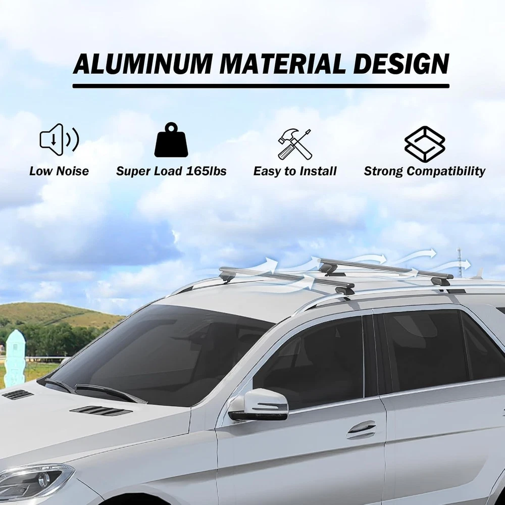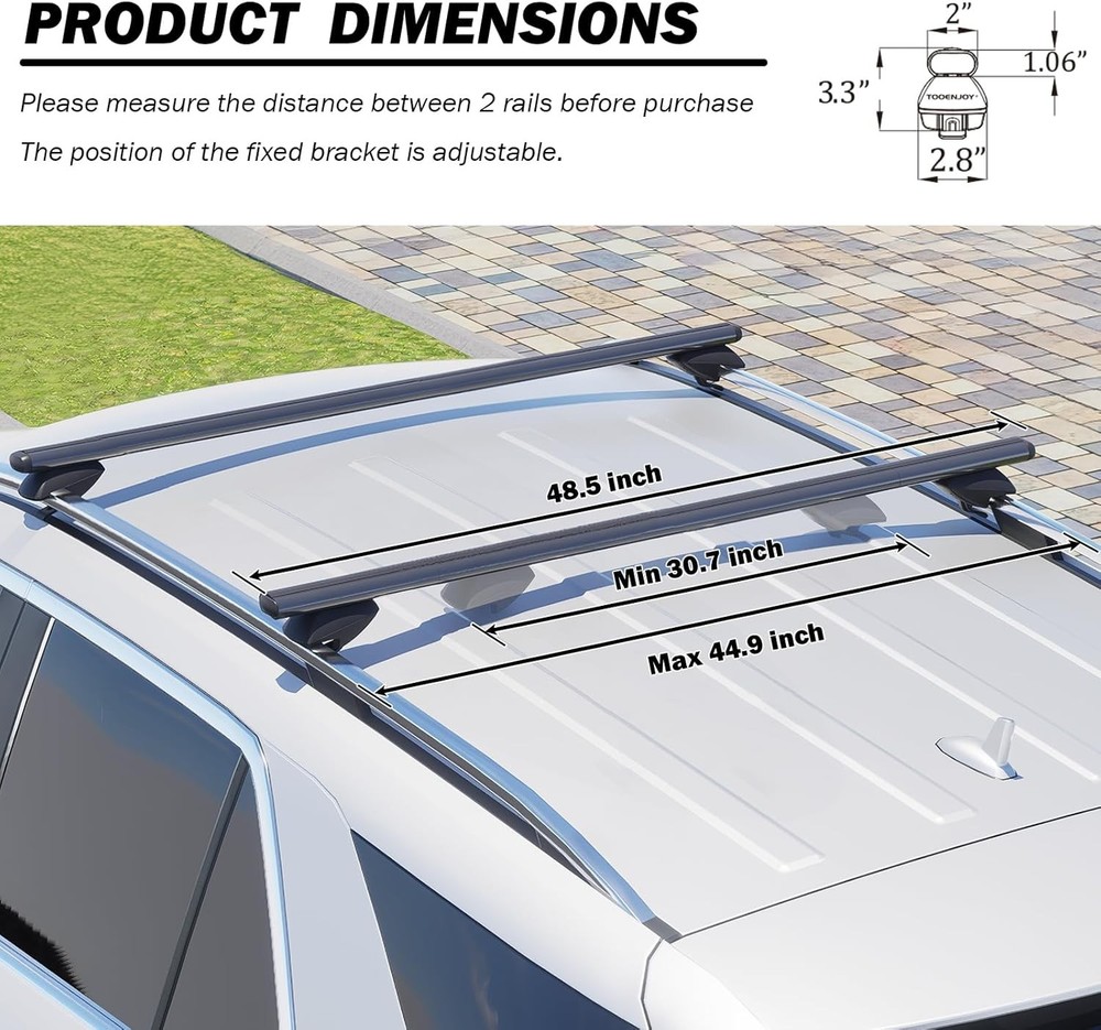 Raised Rail Fit: Our roof rack cross bars are adjustable from 30.7 inches to 44.8 inches, flexibly compatible with cars, vehicles and SUVs with raised side rails with a gap between 30.7 and 44.8 inches Bring You Durability: Cross bars is made from powder-coat finish aluminum, which means scratch resistance, anti-corrosion, and can be used for many years. Clamp stand bases with rubber pads secure your cross bars firmly on the vehicle side rails and protect the vehicle from scratching Expand Car Capacity: It's sturdy enough to carry up to 165 lbs (75 kg). It will free up the inner space of your vehicle and maximize the storage possibility of your vehicle to load camping gear, luggage, fishing poles, bikes, snowboards, skis, and other rooftop accessories and ensure you enjoy outdoor adventures to the fullest Easy Installation & Removal: The crossbars come with a detailed instruction manual, which help you install them in a few minutes. Just simply align with the preset holes of the vehicle side rails and install the roof racks with the attached wrench. We also has an installation video and it shows you the installation steps clearly Notes: Please make sure it fits your vehicle before purchasing! For safety when carrying long large accessories such as surfboards or skis, please use special racks and fixing devices to secure them to the rack. This slim cross bar is not suitablefor use with two lift racks products! (We can recommend pro series)