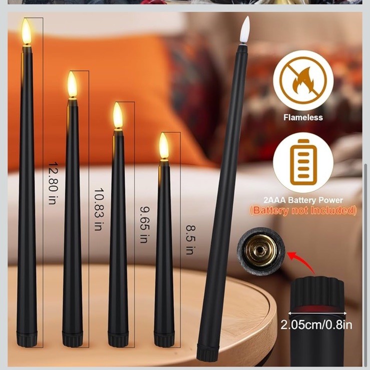Open box New item! Ample Quantity: every package contains a total of 48 flameless flickering candles; Each length category has 12 pieces; The ample quantity ensures you can create stunning visuals without worrying about running out of candles Convenient Size and Multiple Styles: our LED candlesticks come in 4 different lengths: 8.5 inches, 9.65 inches, 10.83 inches and 12.80 inches; Whether you need to lighten up a dinner or a festive party, these candles are versatile to fit your needs Quality Material: crafted from strong plastic, these LED flameless taper candles are designed to last; Their classic color gives them an elegant and chic look, making them nice for any occasion; These battery operated candles are an ideal addition to your decorations Ease of Use: these LED flameless taper candles are very easy to use; The bottom of each candle has a rotary switch for opening the battery cover; Simply install 2 AAA batteries into each candle (batteries not included), and enjoy the calming atmosphere Romantic Fake Candles: these LED candlesticks mimic the flicker of real candles perfectly; Add an exquisite touch to your home decor with these faux flickering candles without worrying about smoke or wax drips; They're suitable for dinner parties, romantic nights, or as everyday home decor