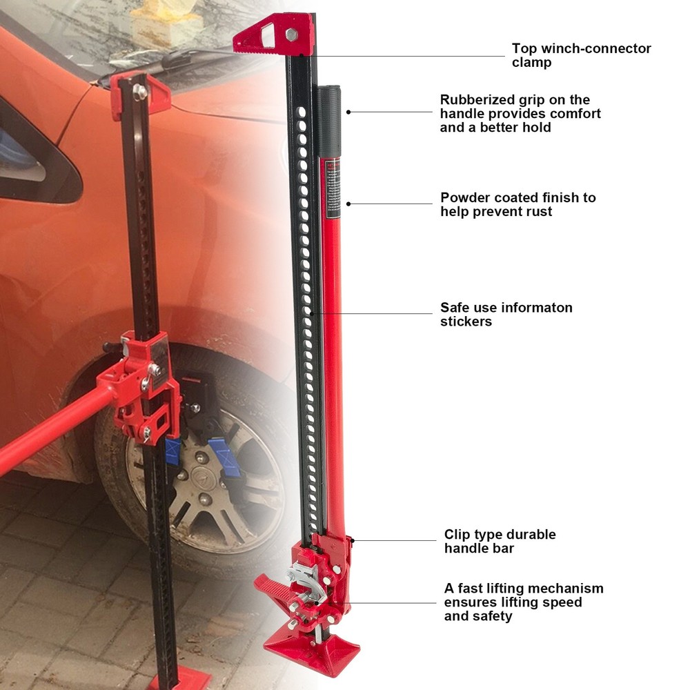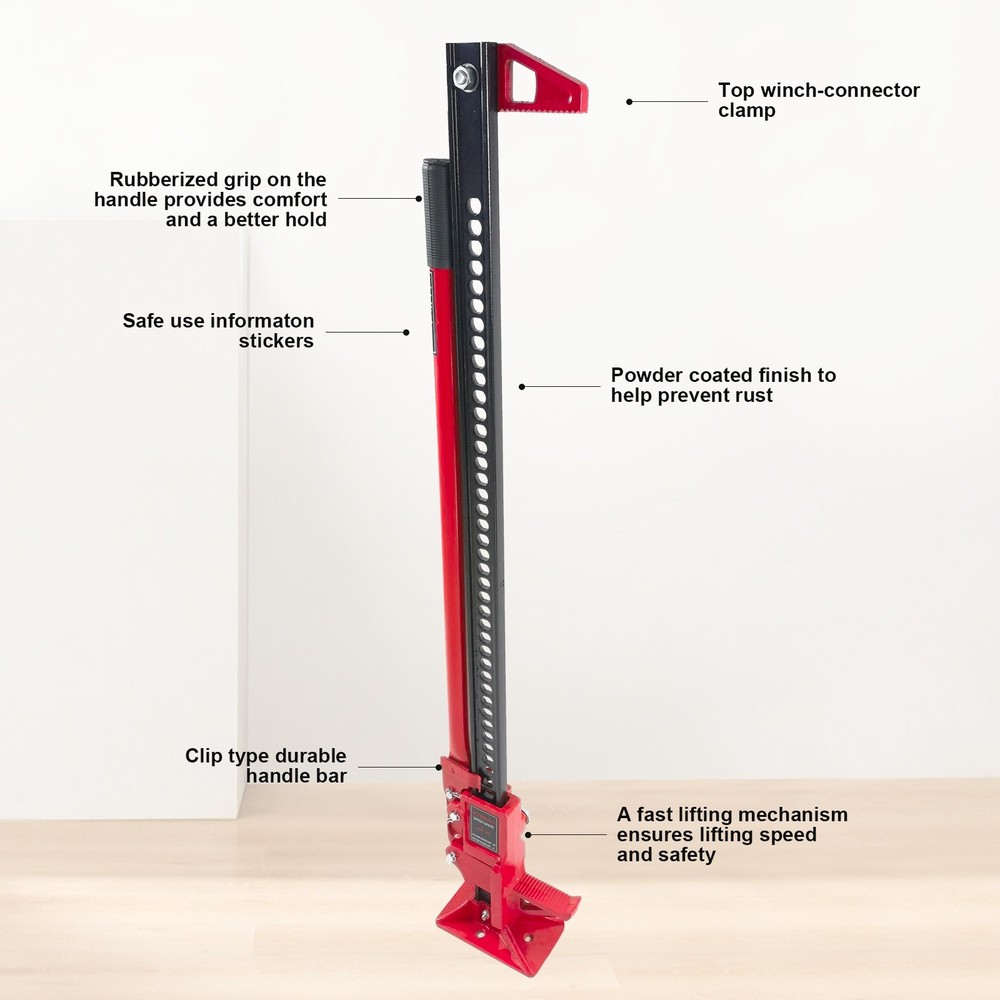Specification Package Weight(lbs): 30.86 Package Dimensions(LengthxWidthxHeight:inch): 49.80x10.63x5.51 Item Weight(lbs): 27.56 Item Size(LengthxWidthxHeight:inch): 49.80x10.63x5.51 Material: Steel Lifting Range(inch): 4.72" to 40.16" Load Capacity: 6000lbs/3Ton Maximum Lifting Height(inch): 48" Warranty: 1 Year Color: Red Description 1. It is easy for you to pull out old fence posts、cars stuck in the mud and concrete footings (deep pipes) out of the ground. 2. For greater safety, all farm jacks are equipped with a shear bolt which prevents the jack from being used on loads greater than 6000 pounds. 3. Ratcheting off-road jack utility high jack is ideal for any application that deals with lifting, pulling, clamping, winching, and spreading. 4. Features a lifting range of 4.72" to 40.16" and a 6000 lbs load capacity; Multi-directional jack is designed to be used vertically and horizontally. 5. Great for off-road and rough environments, farm-related applications, and as an emergency fire and vehicles rescue tool. 6. Fast lifting mechanism ensures lifting speed and safety; Rust-resistant, powder coated finish and zinc-plated hardware. 7. Cut-out wedge for 'gripping' when spreading. Top-clamp can be attached at any point on the High Jack 'I' Beam with quick-tightening wing nut.