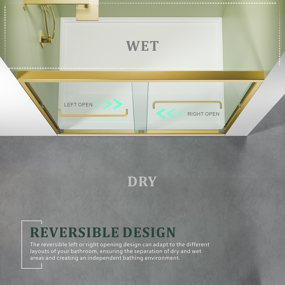 Shower Room Glass Door 48" W x 72" H; Width Adjustment Range: 44 in. to 48 in. by cutting guide; Color: Brushed Gold. Splash-Proof Design The brushed gold shower door double adopting high-quality materials and structural design to enhance waterproofness, the splash-proof structural design at the bottom can effectively prevent water leakpage, and each glass panel side is covered with a waterproof sealing strip to effectively prevent water splashing and leakage, thus keeping the rest of the framed sliding shower dry. Double Sliding Design The shower room glass room with 2 long handles allows 2 shower glass panels move smoothly and easily.The aluminum alloy material makes them more sturdy and resistant to rust. Safety Clear Glass Brushed gold shower door double with 1/4" (6mm) tempered glass is certified by ANSI, not easy to break, making your framed sliding shower safer and less stressful. Easy Assembly The shower room glass door can be installed left and right, with an illustrated instruction and all necessary fixings supplied, easy to install. Professional installation is recommended. DOUBLE SLIDING GOLD SHOWER DOOR TEMPERED GLASS SHOWER DOOR ADVANCED DETAILS DESIGN As a professional bathroom product manufacturer, we always provide you with better products and more efficient services, but the following service terms need to be known to you: 1: If you find some problems with the product after receiving the goods, please do not discard the product, because we need you to provide pictures or videos of the relevant faults to better serve you. 2: Please note that we do not bear the installation/assembly costs. If you find a fault during the installation of the product, we will not bear or reimburse this cost because we stipulate that all parts must be checked before booking. 3: Delivery within the United States only, excluding Alaska/Hawaii, Puerto Rico, Guam, Saipan, APO/FPO, US Protectorates and PP Box. Usually the delivery time is 1 to 7 business days. If you still have not received the goods after 7 business days, please contact us immediately and we will track the order for you. 4: If your goods are damaged when delivered, you must refuse the order and describe the damage on the receipt. Just fill in "the goods are damaged". If you accept the goods and the damage is not noted on the receipt, we reserve the right not to refund or replace your goods. If you are not satisfied with your purchase, please contact us within 7 days. Please note that there is a 20% restocking fee and all shipping and handling charges are the responsibility of the buyer.