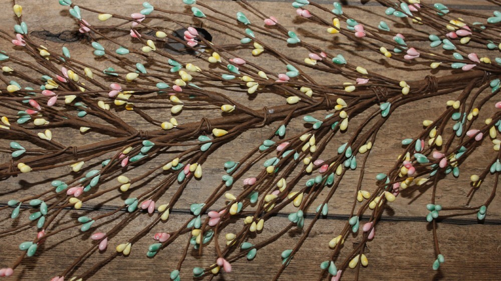 ~ Welcome to 1804 Primitives ~ 48" Pip Berry Garland - Spring Colors Beautiful shades of Light TEAL , Light PINK and Light YELLOW Wired branches are easy to twist and bend to your own desire A perfect accent for your primitive shelves ... pie safe .... or country cupboards ~ Thank you for shopping in our little corner of eBay ~