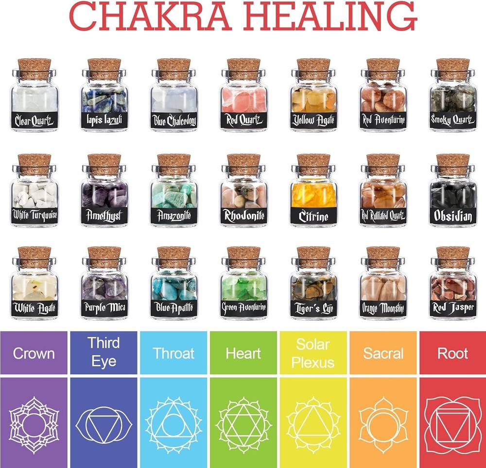 This product consists of 48 mixed mini bottles of gemstone chips and crystal healing chakra tumbled stones. The stones are predominantly turquoise in colour, with a polished finish. These stones are believed to have healing properties and are often used in meditation or as decorative items. The gemstones are of various shapes and sizes, making each set unique and diverse in terms of the crystals included. Ideal for collectors or those interested in exploring the world of crystals and minerals.