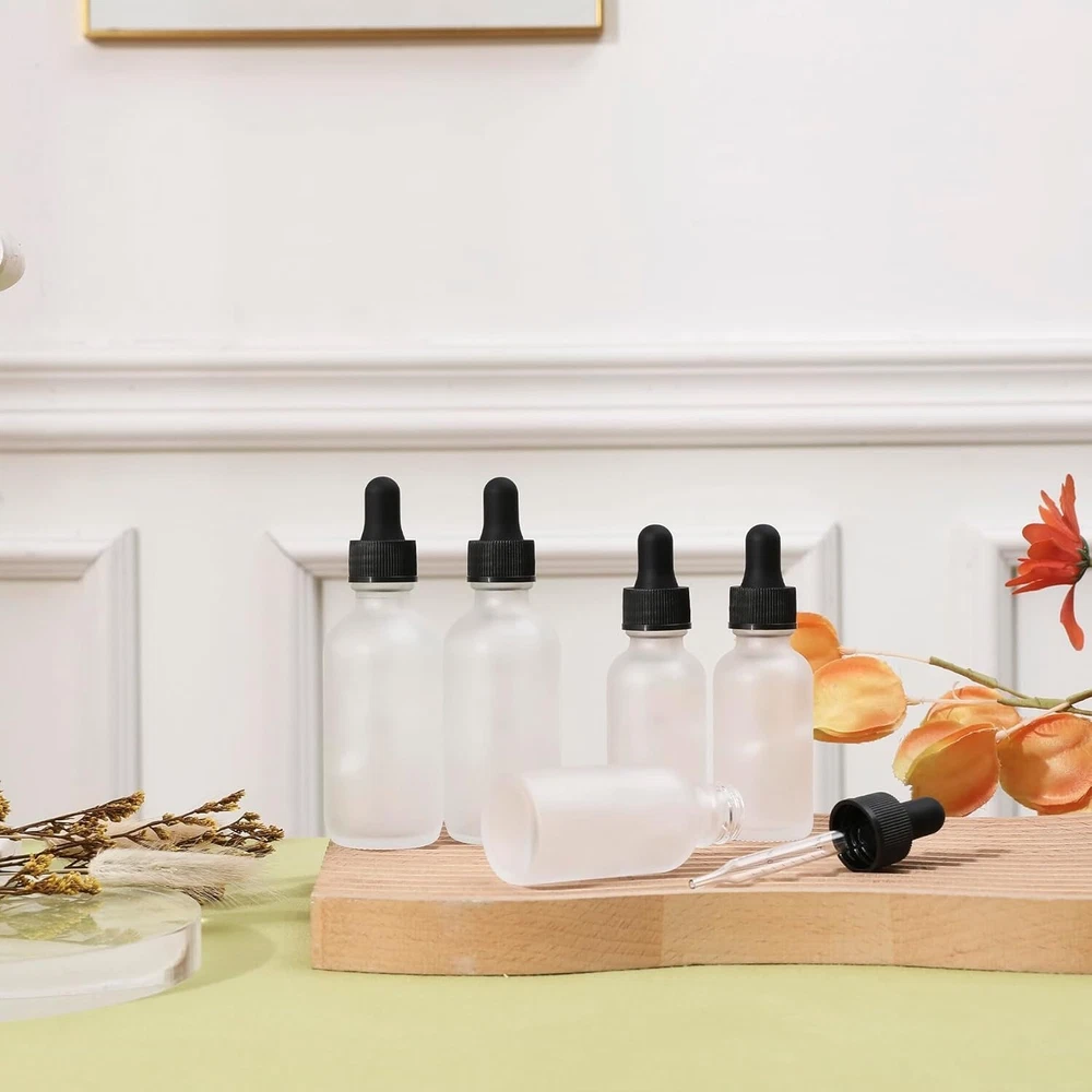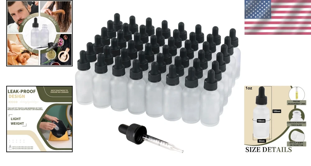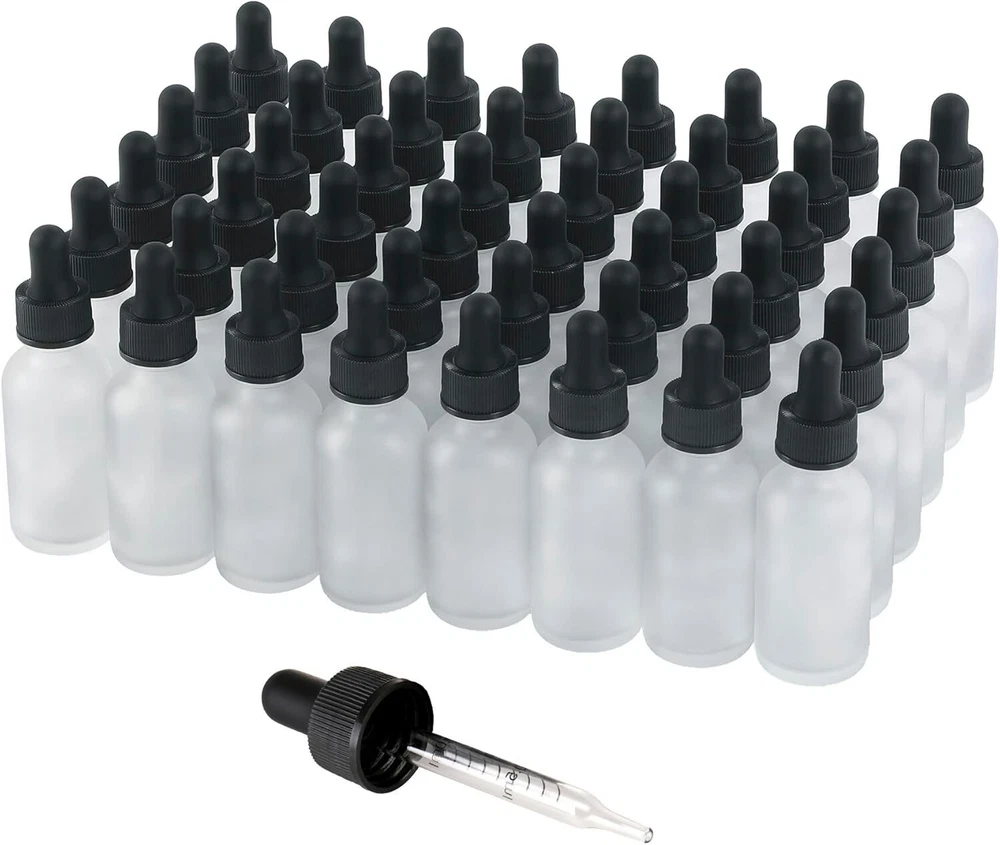 Bottle Type: Standard Bottle Number Of Items: 24 Department: Adults Noise Level: None Item Dimensions W X H: 4.1"w X 1.29"h Scent: Assorted/Mixed Material Type: Glass Brand: Unbranded Volume: 1 fl oz Power Source: None Era: Unknown Size: 1oz-48pack Smart Home Compatibility: None Smart Home Protocol: None For: Skin Color: Clear Frosted Product Care Instructions: Hand Wash Only Type: Dropper Bottle Item Weight: 1 oz Capacity: 1 Ounces Container Type: Dropper Bottle Effect: Multi-purpose Age Range Description: Adult Unit Count: 48.0 Count Item Shape: Round gtin13: Does not apply UPC: Does not apply Item Diameter: 1.29 in Features: Leakproof, Reusability Number in Pack: 48 Material: Glass, Silicone Humidity Control: No Reusability: Reusable Number of Settings: 1 Installation Area: Indoor Style: Modern