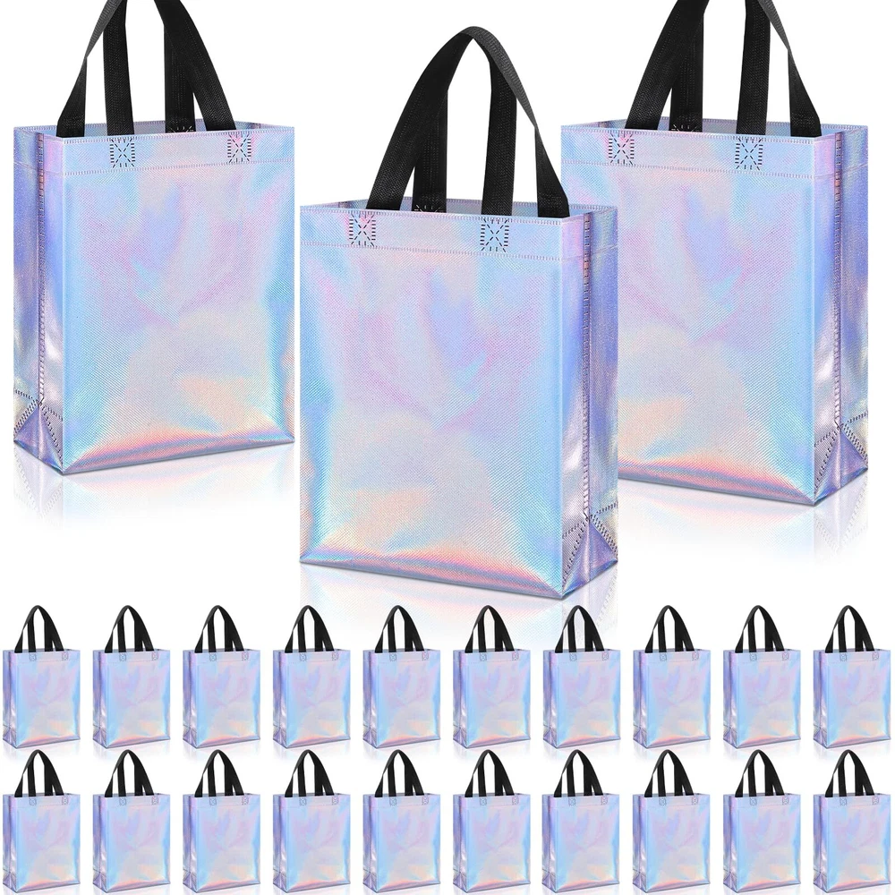 Features: Ideal tool for gift packaging: Shiny colors of the reusable tote bags with handles can quickly attract people's attention. When others receive your gift packaged in these packages, they will make people feel your caring. Wide applications: In addition to being applied for wrapping gifts, the party favor bags with handles can also be applied in daily life. They are good companions for you to , documents, and go out for fun. Specifications: Material: non woven fabric Color: holographic Size: approx. 8 x 4 x 10 inches/ 3.15 x 1.57 x 3.94 cm (width x depth x height) Package includes: 48 x Reusable gift bags Notes: Manual measurement, please allow slight errors on size. The color may exist a slight difference due to different screen displays. Ample Quantity: you will receive 48 pieces of bulk tote bags, designed in black handles, which are sufficient to meet your daily packaging and needs, bringing convenience to your life Reliable Material: made of quality non woven fabric, the flash shopping bag is lightweight and structurally durable, reusable and foldable; It is easy to carry around helping you reduce the burden of shopping and storage Proper Size: each of shiny gift bags is approx. 8 x 4 x 10 inches/ 3.15 x 1.57 x 3.94 cm in width, depth and height, which is convenient to hold a lot of items, such as fruits, vegetables, daily necessities, umbrellas, clothes and so on Waterproof Film: the surface is covered with a waterproof film, which can be slightly waterproof in rainy weather to secure your items while the film can enhance the texture of the bag, be careful not to get too wet Not Easy to Deform: the reusable gift bags with handles are equipped with cardboard pads at the bottom of the bag to prevent the bottom from being broken, and it can effectively fix the basic shape even if it is not loaded