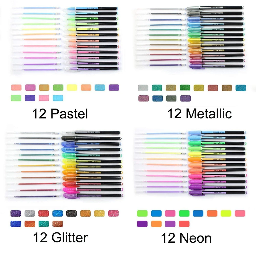 48 Packs Glitter Metallic Gel Pen Set Coloring Neon Pens Set for Adult Coloring Books Art Drawing Writing 1.0mm Tip -12 Metallic,12 Glitter,12 Neon,12 WaterChalk THE MOST PRACTICAL COLORS PENS - 4 styles ink: Metallic, Glitter, Neon, Pastel. We believe this gel pen set let your mind and express more freely. So your creativity will not be subject to any restrictions. 4 KINDS of WRITING EFFECT: please note not 48 colors, some colors are similar. Glitter pen:suitable for writing on white paper, drawing, coloring, doodling(not suitable for black paper).Pastel Pen:bright colors, great for black paper, photo album,poster.Fluorescent pen: ideal for marker, taking notes, underlining, not suitable for black paper.Metallic pen: writing or drawing with metallic effect, more attractive. SAFE AND EASY TO USE - Consider SAFETY the MOST primary concern. We design and produce the pens with scientific ink formulations and standard production process, None of toxic, acid free, lead free. PERFECT FOR ADULTS - Great gel pens especially for Adult coloring books, sketch, draw, color, doodle, write and get creative in a fun and skilled way. Ideal for greeting cards, party invites, decorating, gel highlighter,arts and crafts, decoration, day care activity, scrap booking. 48 pcs gel pen set with durable quality,there may be some smell when you receive the package, you can leave the package in a ventilated place for a few days, and the smell will be reduced, if you meet other problems please contact me feel free, we will help you to slove it. Shipping We offer FREE shipping on all orders! We ship within Three business days of payment, usually sooner. We use a selection of shipping services such as UPS, FedEx, USPS etc. We only ship to the lower 48 states, no APO/FPO addresses or PO Boxes allowed. Local pickups and combined shipping options are not provided at this time. Return You can return a product for up to 30 days from the date you purchased it. Any product you return must be in the same condition you received it and in the original packaging. Please keep the receipt. Payment We accept payment by any of the following methods: PayPal Please pay as soon as possible after winning an auction, as that will allow us to post your item to you sooner! Feedback Customer satisfaction is very important to us. If you have any problem with your order, please contact us and we will do our best to make you satisfied. Contact Us If you have any queries, please contact us via ebay. We usually respond within 24 hours on weekdays. Please visit our eBay store to check out other items for sale! Thank you for shopping at our store.