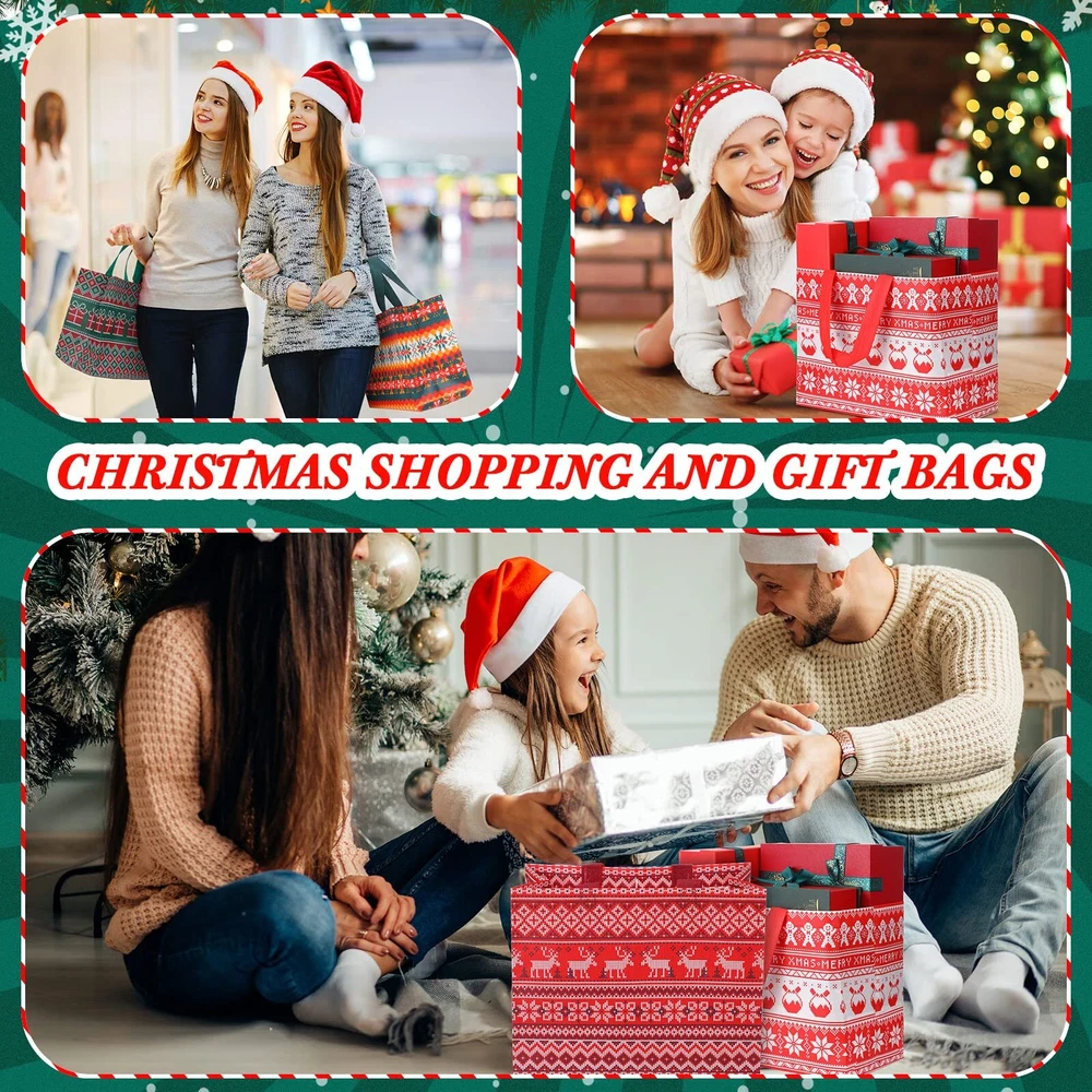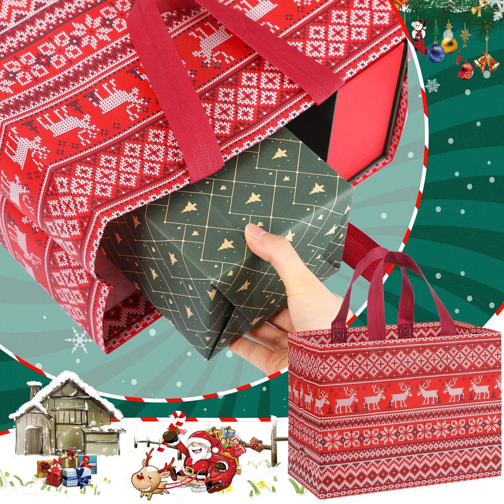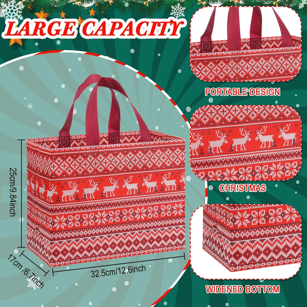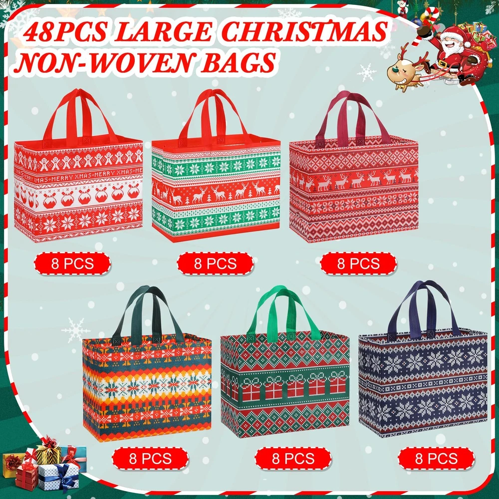 Features: Wise gift choice: You can fill the party favor bags with some gifts for your family, friends, colleagues, neighbors as Christmas gifts or birthday gifts to express your love and blessings to them and make your relationship more intimate. Decorative but practical: The christmas shopping bags can be utilized not only as a decoration or gift wrapping at Christmas, but also as the daily shopping bags. They are easy to carry, foldable, will not take up too much of your storage space, bringing you a good use experience. Specifications: Material: non woven Color: as pictures shown Size: approx. 32.5 x 25 x 17 cm/ 12.8 x 9.84 x 6.69 inches Package includes: 48 x Christmas tote bags with handles Notes: Manual measurement, please allow slight errors on size. The color may exist a slight difference due to different screen displays. Packaging Quantity: this packaging comes with 48 Christmas tote bags, featuring different Christmas classic elements and beautiful designs; The sufficient quantity can meet your daily use and Christmas party decoration needs, making it a good choice for your Christmas party gifts Proper Size for You to Carry: the gift bags for Christmas measure approximately 32.5 x 25 x 17 cm/ 12.8 x 9.84 x 6.69 inches and are large enough to hold books, pens, toys, snacks, candy, lunches, gifts, Christmas party supplies or other items for Christmas shopping and holiday gift wrapping Long Service Life: these Christmas party favor bags are made of reliable non woven material, which is serviceable, sturdy, light weight, not easy to break or fade, and can accompany you for a long time; The bag is equipped with 2 handles, easy to carry things, not easy to fall off, bring convenience to your life Christmas Themed Design: these Christmas tote bags are designed with different color schemes and classic theme patterns, with Christmas as the theme,The craftsmanship is exquisite, the design is suitable, and the selection of diverse performance meets your needs, creating a strong Christmas atmosphere Where to Apply: these Christmas tote bags with handles can be utilized as Christmas party bags, ideal for Christmas decorations, Christmas gifts, Christmas gift bags, party decorations, candy bags, crafts, daily shopping bags, storage bags, suitable for decorating Christmas souvenirs can also be placed under the Christmas tree as a lovely decoration to enhance the Christmas atmosphere