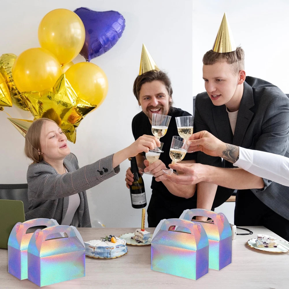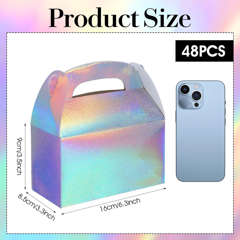 Features: Stunning 48-piece set of iridescent party favor boxes, designed to elevate any celebration with their mesmerizing holographic finish. These gable boxes are perfect for party favors, birthdays, weddings, and more, offering a unique and eye-catching way to present your gifts. The rainbow gift bags are not only visually appealing but also durable, Surface waterproof, and oil-repellent boxes are perfect for securing snacks, desserts, or crafts, ensuring your treats are securely stored. Specifications: Color: Iridescent Material: Cardboard Dimensions: 16x9x8.5 cm/6.3x3.5x3.3 inches Packaging List: 48 x Iridescent Party Favor Boxes Notes: Manual measurement, please allow 1-2cm error exists. The color may have color difference due to different monitors. Sparkling Goodie Boxes: includes 30 piece of iridescent party favor boxes, features a captivating holographic design, perfect for birthdays, weddings, and festive celebrations. Iridescent treat boxes are ideal for snacks, candy, toys or crafting gifts Durable: Each gable measures 6.3" x 3.5" x 3.3", providing ample room for party favors, toys, and treats. These candy boxes are made from sturdy and recyclable cardboard , sturdy and reliable, shiny favor boxes will make your presents stand out Pop-Up Design: Designed with a convenient pop-up bottom, these gable boxes for party favors are easy to assemble, saving time on party setup. Includes handles for convenient carrying, of the best rainbow gift bags for any special event Versatile Treat : These party favor boxes can be personalized with stickers, ribbons, graffiti, draw or tags, allowing you to create unique goodie boxes for your guests. Decor your party with shiny cardboard boxes that everyone will love Celebration Essential: Whether it's a , wedding, Christmas, or any festive occasion, these holographic bags are a must-have for creating memorable party experiences. Elevate your event with these stunning candy boxes, bring a classy and festive touch to your party