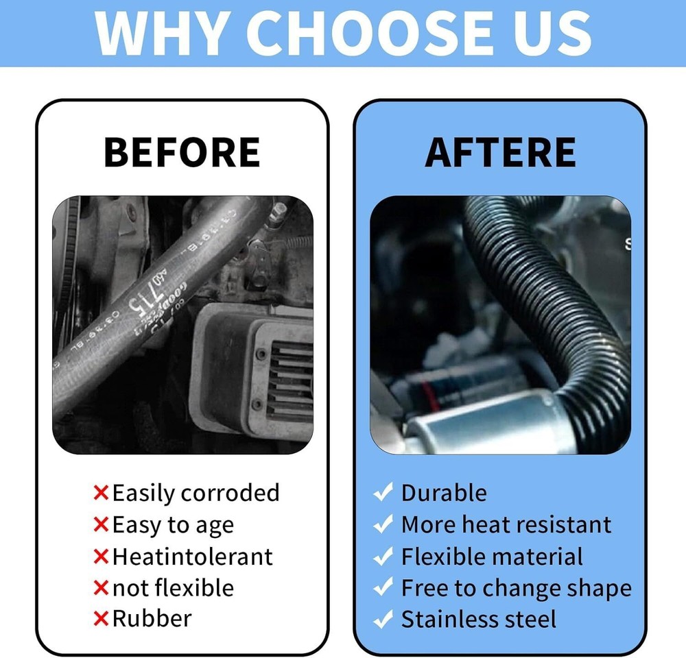 48" Stainless Steel Radiator Flexible Coolant Water Hose w/ Caps Kit Universal Item Description Quality Assurance: Coolant Water Hose Kit is made of aluminum alloy and stainless steel. Compared with rubber hoses, it has better heat resistance, better heat resistance, and is not perishable. Appreciation: Replace the hose of the original car, chrome-plated to a beautiful luster, dedicated to the appearance of modified accessories, open the cabin will have a different surprise MATERIL QUALITY: Made from extremely high quality stainless steel, Coolant Water Hose Kit has better heat resistance, better heat resistance, and is not perishable, will not blow or rot out like a rubber one. INSTALl EASYILY: These hoses can be formed by simply bending them to the desired shape, flexible design eliminates the hassle of finding a rubber hose with just the right bends, The hose can also be cut to the required length as you need. APPLICATION FEATURES: This radiator hose kit can be used with 1 1/4", 1 1/2", 1 5/8" radiator necks(Universal) COMPREHENSIVE SERVICE: 100% brand new Stainless Steel flex radiator hose, 90 Day Warranty, Buy with confidence! If problem in the year quality 90 Day time, please do not hesitate to contact us for a free and easy replacement or refund. Features Material Quality: Made of high quality stainless steel, the cooling water hose kit has better heat resistance, better heat resistance, not easy to rot, will not blow out or rot like rubber. Easy to install: These hoses can be formed by simply bending them into the desired shape, the flexible design eliminates the hassle of finding rubber hoses with the correct bend, the hoses can also be cut to the desired length as needed . Application Features: This radiator hose kit can be used with 1 1/4", 1 1/2", 1 3/4" radiator necks (universal) Comprehensive service: 100% brand new stainless steel flexible radiator hose, 3 months warranty, buy with confidence! If there is a problem within the three-month quality warranty period, please feel free to contact us. 48-inch Radiator Hose Compared with rubber hoses, stainless steel radiator hose has better heat resistance, better heat resistance, and is not perishable. 4pcs Chrome Caps & Clamps The rubber hose sleeve adapters and reducers allow the hose to be used with 1-3/4", 1-1/2", and 1-1/4" hose connections. Flexible Shape Its shape can be changed according to the conditions of your car. Cut as much as you use The 48-inch length can also be cut to your ideal length. Specifications Condition:100% Brand New Warranty: 90 Day Free Return:30 Day Material: Stainless Steel Color: Black / Silver This product is available in two styles: black and silver. Please leave a message to let me know your preferred color. Fitment UNIVERSAL:Applicable to BMW,Mercedes-Benz,GMc... a variety of models First select and connect the appropriate size reducers separately, and finally connect the clamps. Package Included 1 Pc Stainless Steel Flex Hose, 48 in. length, 1 5/8" O.D. 4 Pcs End Cap Covers, Chromed Aluminum 4 Pcs Rubber Hose Sleeve Adapters, 1 3/4" I.D. 4 Pcs Rubber Reducers, 1 1/4" I.D. 4 Pcs Rubber Reducers, 1 1/2" I.D. 8 Pcs Hose Clamps As pictures show FAQ: I purchased by mistake, how do I cancel the order? Please contact us ASAP. If the item has not been shipped out we can cancel the order for you. If the item was shipped out you can refuse the package and wait for the item to return to us. I received your item but it does not fit or is defective Please contact us so we can assist you on the matter. Buy with confidence Our quality is based on meeting the requirements of the manufacturer and improvement them in design problems manufacture. NOTE: (1)It would be highly appreciated if you might contact us first once you have any problems concerning the items. And you can expect all the issues would be resolved ASAP! (2)Please let us know before you send us the neutral/negative feedback that wont help to finish the issues. And I will definitely try my best to provide the best solutions which would meet our satisfactory! (3)According to the distance of the receipt address items would be sent from CA or NJ