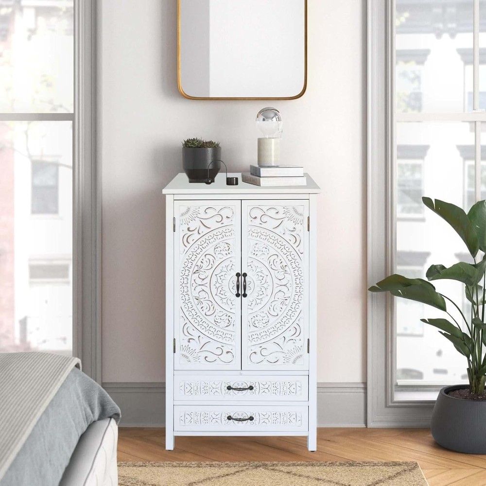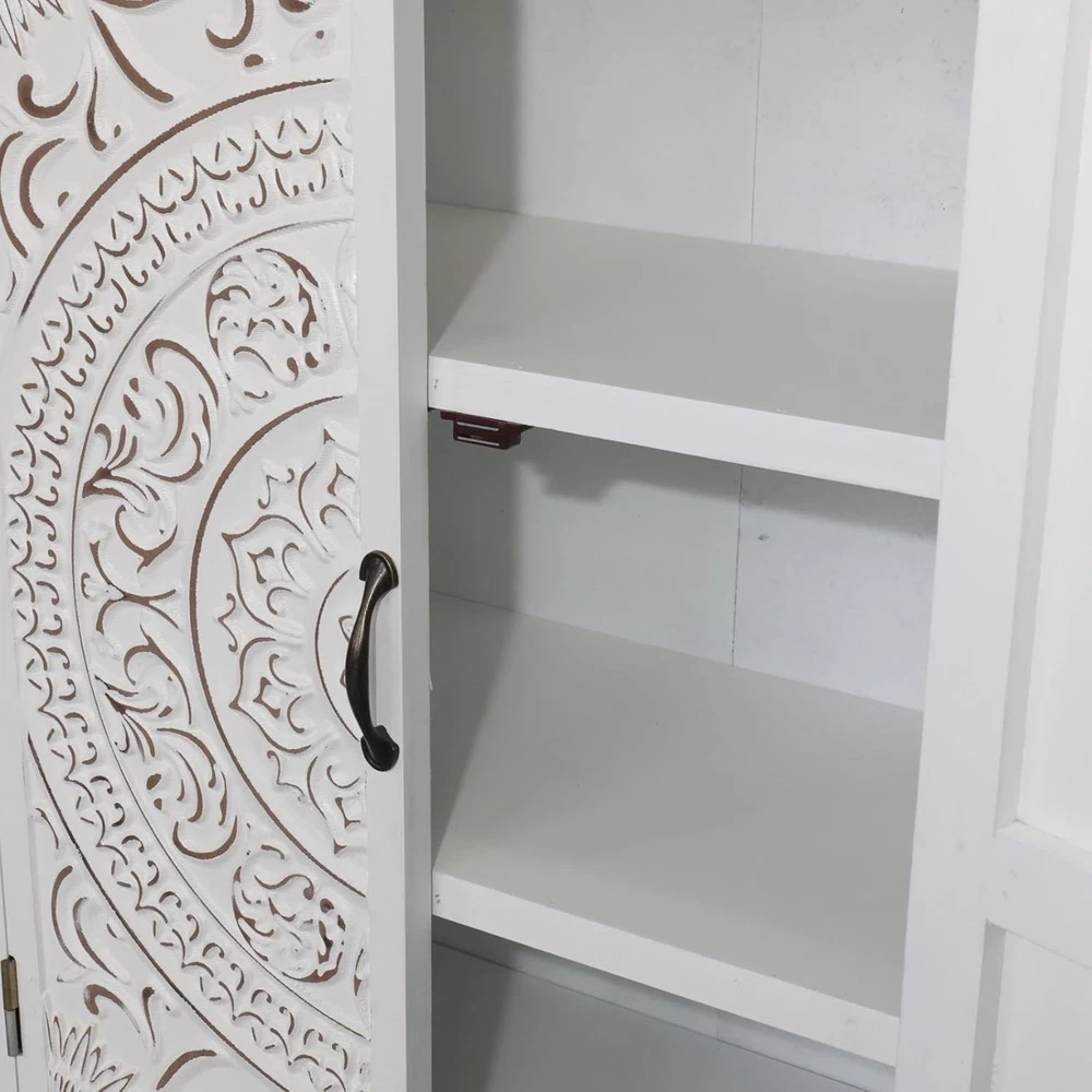 This stunning cabinet adds elegance and function to any room! The intricate carved doors and spacious shelving make it perfect for displaying decor while keeping things organized. Solid wood and MDF construction ensure durability, and its compact size fits beautifully in tight spaces. Love how it elevates my home’s style while offering practical storage!