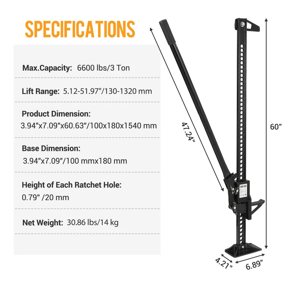 48 60 Inch Heavy-Duty Lift Farm Jack 3 Ton Ratcheting Off Road Utility Lift Jack