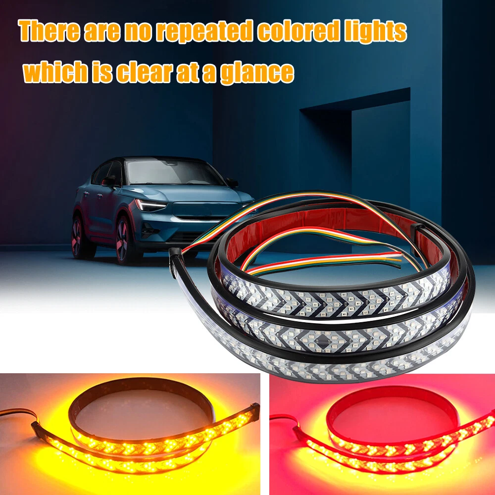 60"-Version 1-White Red Yellow 5 Function & 3 Color. The 60'' Quad Row LED Tailgate Light Bar tucks into the recess between your tailgate and bumper for avoid traffic collisions, illuminates in conjunction with your truck’s brake lights, reverse lights, turn signals, running lights and hazard lights in White/red. Turn signals with 3 stage scanning lights Don't be left in the dark. For faster, safer and more enjoyable driving, the tailgate light strip running 624pcs high intensity SMD LEDs with quad row design (400% brighter than single row light), adds a unique custom touch to your rig and the attention of other drivers behind you at day and night 48"/60" Row LED Truck Tailgate Light Bar Strips Tail Turn Signal Brake Reverse M 60"-Version 1-White Red Yellow 5 Function & 3 Color. The 60'' Quad Row LED Tailgate Light Bar tucks into the recess between your tailgate and bumper for avoid traffic collisions, illuminates in conjunction with your truck’s brake lights, reverse lights, turn signals, running lights and hazard lights in White/red. Turn signals with 3 stage scanning lights Don't be left in the dark. For faster, safer and more enjoyable driving, the tailgate light strip running 624pcs high intensity SMD LEDs with quad row design (400% brighter than single row light), adds a unique custom touch to your rig and the attention of other drivers behind you at day and night Ready to take on any kind of weather. Seamless design with IP67 waterproof rate and shockproof silicone tube, passed through 50,000 hours working lifespan testing providing the most durable light, to ensure more resistant to dirt, snow and ice accumulations Plug and play without drills. The tailgate light bar comes with 3M double-sided foam tape, just affix the tape and tailor the installation to your vehicle. The 4-pin tow plug comes ready to connect to your factory 4-pin trailer adapter for a true plug and play installation, but if you regularly tow your vehicle’s or without 4-pin adapter you can hard wire the light strip to your vehicle Fit for DC 12 vehicles with 60inch tailgate and TURN, such as Pickup, Truck, Ford, Chevy, Jeep, Dodge Ram, GMC, Toyota, Nissan, SUV, Tractor, Trailers, Cars, RV, VAN, etc. Certified with IP67, CE and RoHS. Make sure the turn light color of your vehicle before purchase. Specification: Type: Quad row LED Tailgate light bar Light Length: 60 inch(150cm) Input Voltage: DC 12-16V LED QTY: 624pcs Luminous Flux: 12000LM Waterproof Rating: IP67 Lifespan: up to 50000 hours Material: Diecast Aluminum + PC Dimension:60*0.62*0.12inch Color:White+Red+Amber Package Included: 1PC x 60INCH Quad row LED Tailgate light bar 48"-Version 1-White Red Yellow Specifications: LED number: 432pcs LED type: 2835SMD Product length: 48inch(1.2m) Waterproof grade: IP68 Service life: more than 5000h+ Wide Fitment: With working voltage of 12V DC, fit for Amber turning on most vehicles. Such as Dodge Ram 1500 2500, 3500, 4500, Ford F150, F250, Chevy, Silverado, GMC, Sierra, Toyota Tundra, and most cars, trucks, Pickup, SUV, RV, Van, trailers, etc. Features: *More advanced with 6 founctions: More advanced than other tailgate lights, our lights have 6 founctions: Braking Light, Turn signal(left+right), Reversing lights,sequential strobe light,running light. *High Brightness: With 432pcs 2835 SMD led chips to give out the super-bright beam. Adds clear visibility to the rear drivers,better-ensuring safety traffic on roads. *Simple Installation: No drilling required, using high-quality automotive adhesive and self-tapping screws for a fast, secure mounting. *High Waterproof: Manufactured from fully sealed flexible silicone housing with IP68 waterproof rate, the durable tailgate lights work perfect whatever in rainy or snowy environments. *Wire connection: Brown-negative pole White-running light(low bright red light) Yellow-turn left(dynamic yellow light)/brake(high bright red light) Green-turn right/brake(dynamic yellow light) Red-reversing light(white light) Packaging inclued: tailgate light*1 48"/60"-Version 2-White Red Specifications: LED number: 72pcs LED type: 3528SMD Product length: 48inch(1.2m)/60inch(1.5m) Waterproof grade: IP68 Service life: more than 5000h+ Features: *More advanced with 5 models: More advanced than other tailgate lights, our lights have 5 models for you to improve driving safety. *High Brightness: Adds clear visibility to the rear drivers,better-ensuring safety traffic on roads. *Simple Installation: Product with high-quality automotive adhesive makes it not fall off easily. *High Waterproof: IP68 waterproof rate makes it durable and works perfectly in rainy or snowy environments. *Wire connection: Brown-negative pole White-running light(low bright red light) Yellow-turn left(high bright red light) Green-turn right(high bright red light) Red-reversing light(white light) Packaging inclued: tailgate light*1 60"-Version 3-White Red Yellow Product Feature: FULL FUNCTIONS: The new style tailgate light features full functions of the brake, flowing turn signal, double flash, and brake light. BRIGHT LIGHTS: With 528pcs(276Pcs Red+252Pcs Yellow)2835 SMD led chips to give out the super-bright beam. Adds clear visibility to the rear drivers, better-ensuring safe traffic on roads. PREMIUM QUALITY: Adopts fully sealed silicone housing with IP67 waterproof rate, works well whatever in rainy or snowy days. With inline fuse for short circuit protection, heavy-duty, and super durable. EASY TO INSTALL LED Tailgate Light Bar: No drilling required, using high-quality automotive adhesive and self-tapping screws for a fast, secure mounting, quickly hardwire to the tow trailer connector harness. UNIVERSAL FITMENT: This flexible light strip features 60 inches long, widely suited for almost all 12V operated at DC 12V wide voltage, Pickup Trucks, Trailers, Cars, SUV, RV, VAN, boat anchor, etc. Product Specification Type: Truck Tailgate Strip Bar Shell Material: PVC LED Color: Red/Yellow Red For Brake Light Yellow For T