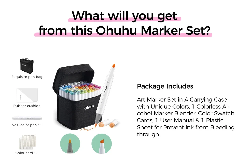 Main Featrues 【Honolulu Series】BRUSH & CHISEL , DOUBLE-TIP, DOUBLE THE FUN Widen your artistic horizons with the dual-tip marker design! Choose the brush tip for sweeping, calligraphic strokes or quickly color in large areas with the wide chisel tip. What's more, now Ohuhu replacement brush tips is available, so you can easily replace the worn-out tips to ensure consistent and precise lines whenever you create. The only limit is your imagination 【Honolulu B Series】BRUSH & FINE , DOUBLE-TIP, DOUBLE THE FUN Widen your artistic horizons with the dual-tip marker design! Choose the brush tip for sweeping, calligraphic strokes or the fine tip for details. What's more, now Ohuhu replacement brush tips is available, so you can easily replace the worn-out tips to ensure consistent and precise lines whenever you create. The only limit is your imagination REFILLABLE INK FOR A LIFETIME OF CREATIVITY With 51 Ohuhu popular colors available for refills now and more on the way, your creativity knows no bounds. Enjoy a wide range of hues and keep your markers going for years to come. Whether you're exploring the rich colors of Honolulu, Oahu, the Kaala, or the bold hues of Molokai Series, they are refillable now. Switch between sets seamlessly and unlock endless artistic possibilities SEAMLESSLY BLENDING Say goodbye to unsightly splotches and uneven coloring. Our high-quality ink seamlessly blends to create beautiful, professional-grade artwork, perfect for both beginners and experienced artists; Also, no more frustrating smudges or wet ink ruining your work. Our alcohol-based ink dries quickly, ensuring that your art is always clean, crisp, smudge-free, and ready to display 48 VIBRANT COLORS + 1 COLORLESS BLENDER The rainbow is at your fingertips - choose from 48 brilliant colors and bring your ideas to life. The color spectrum is yours to explore with 48 brilliant shades to choose from, plus a colorless blender for better blending effects. From coloring books to professional masterpieces, our brush markers will breathe life into your artwork EASY IDENTIFICATION, ORGANIZATION & PORTABILITY Don't waste time searching for the perfect color. Our markers come with color-coded caps to keep you organized and efficient. Plus, the free carrying case makes these markers perfect for any coloring adventure or as a thoughtful gift for any artist Product Description
