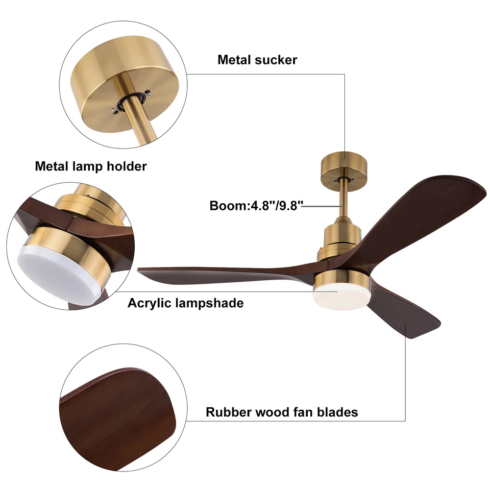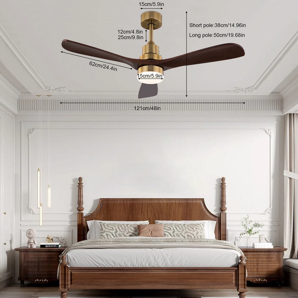 Description Create a cozy interior with this ceiling fan light now! Light color, fan speed, reverse function, and time-setting can be easily adjusted by remote control, providing you with a smarter and more convenient life. Combining a simple round lampshade, brown fan blades, and copper color base, it will add more charm to your home. Package Included 1*Ceiling Fan Light 1*Romote Control 1*English Instruction All Needed Accessories 48 Inch 3 Colors LED Ceiling Fan Light w/ Remote Control Fan Light Timer 40W Key Features Sturdy & Durable: The high-quality glass and iron with polishing and electroplating processes give this product high hardness, corrosion resistance , and wear resistance , keeping it practical and beautiful for long-term use Generous Appearance: The simple colors, glossy body, and elegant lines make this succinct-style light an excellent decoration in your house. Thoughtful Design: It comes with six wind speed adjustments, the reverse function, and the timer function (1h, 2h, 4h) to meet your different needs at different times. Excellent Lighting: The high-transmittance lampshade, energy-saving LED light source, and three light colors(3000K, 4500K, and 6000K) can provide different lighting atmospheres while taking great care of your eyes and mood. Remote Control: It comes with an easy-to-understand remote control that allows you to switch on and off and control the ceiling fan light within a certain range (9.84-16.4 ft), making your life simpler and more comfortable. High Adaptability: You can choose to install any of the 2 equipped lamp poles of 4.8" and 9.8" in height according to your needs. Its wide voltage design(85-265V) makes it adapt to different voltage environments. Easy to Clean: The smooth surface and open structure allow you to simply wipe dust away with a soft cloth. Exquisite Gift: With good performance and unique appearance, it can be used as a housewarming gift for parents, friends, and lovers so that they can also enjoy a more exquisite life. Protective Package: To prevent the product from being damaged during transportation, we packed it with foam to protect your products to the maximum extent possible. Details Pure Copper Motor: The pure copper motor has stable operation, high efficiency, and low noise (35db) to provide plenty of power for the fan. Glass Lampshade: It has high transparency that ensures bright and even lighting, bringing you visual pleasure while protecting your eyes. Round Base: The 5.9-inch base increases the contact area with the ceiling, which makes the support more stable and improves safety during use. Application It is suitable for farmhouses, bedrooms, dining rooms, living rooms, kitchens, hallways, gyms and other indoor places. Specifications Color: Copper Color Material: Iron, Glass Process: Polish, Electroplating Light Source: LED Mount Type: Ceiling Mounted Assembly Required: Yes Motor Type: Pure Copper Motor Number of Wind Gears: 6 Reverse Function: Yes Voltage: 85-265V Motor Power: 40W Noise Level: 35dB Color Temperature: 3000K, 4500K, 6000K Illumination Area: 10-15㎡/107.64-161.46ft² Suitable Height: 2.8m/9.19ft Remote Control Battery Type: 2*AAA Batteries(Included) Remote Control Distance: 3-5m/9.84-16.4ft Time Setting: 1, 2, 4 Hours Efficiency: E EU Energy Label Efficiency Labeling Class: A++to E Product Overall Size(With Short Rod)(D*H): 121*38cm/48*14.96inch Product Overall Size(With Long Rod)(D*H): 121*50cm/48*19.68inch Rods Length: 12cm/4.8inch, 25cm/9.8inch Each Fan Blade Length: 62cm/24.4inch Lampshade Diameter: 15cm/5.9inch Base Diameter: 15cm/5.9inch Package Included 1*Ceiling Fan Light 1*Romote Control 1*English Instruction All Needed Accessories Notes Please check the size carefully before ordering. Please make sure the power is cut off before installation. Please do not install it next to the air conditioner or heater, which will affect the service life of the product. Please wear electric insulation gloves (not included) and avoid scratching the surface of the product and the electric wire when installing. Please conduct a power test before installation. Please install it by someone with an electrical license if necessary. For a safe and secure installation, please ensure that the electrical box is firmly mounted and properly attached to a structural part of the building. Please make sure that all wires are connected and all screws are tightened into the ceiling. When unpacking, be careful not to pull with the wires as a bad connection may result. Please use this item within the applicable voltage range and clean it regularly. Please wipe with a soft cloth, it is not suitable to clean with cleaning agents. Please allow the slight color difference caused by the shooting light and 1-3cm error due to manual measurement, and make sure you do not mind before you order. Payment Delivery details Terms of sales About us Contact us Payment We accept ebay payment 。 Fees such as import duties, taxes are not included in the item price or shipping costs. These charges are the buyer's responsibility. Delivery details Shipping: 2-9 working days to: USA Terms of sales We maintain high standards of excellence and strive for hundred percent customer satisfaction. Feedback is very important to us. We hope that you contact us immediately before you give neutral or negative feedback, so that we can address your concerns. It is impossible to address issues if we do not know about them! About us Your satis faction is our ultimate goal. We work hard to earn your trust and future business. Our certified technicians have tested each item before shipping. The unit comes with 1 year limited warranty on all manufacturing defects. a) If you receive a defective item, you may return it or ask for a discount. Please contact us within 14 days after you receive the package. b) What you returned must be intact and in its original packaging as re? u. Customer is responsible for shipping costs of the returned item. c) We will cover the cost