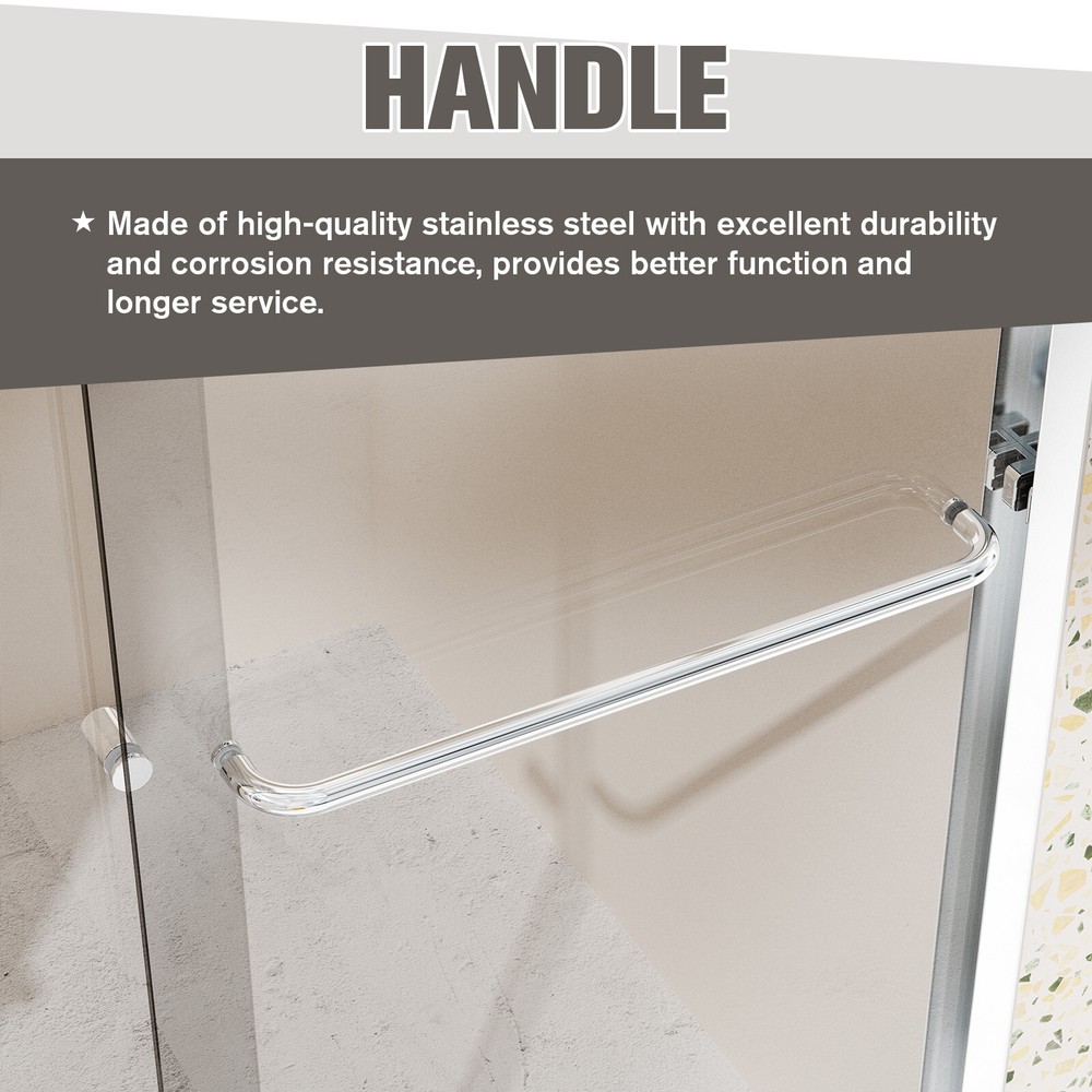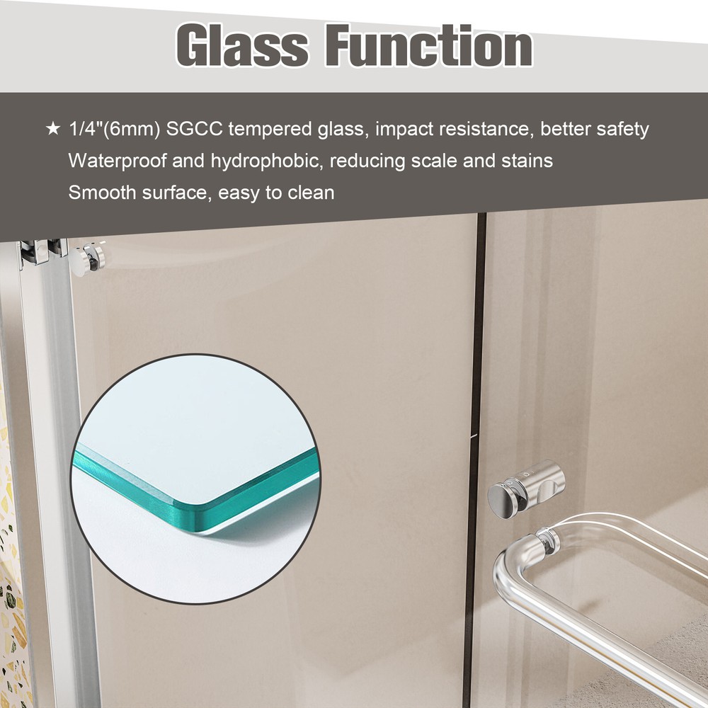 >>【Product Specification】 Item Code: P175007 Product Name: 44"-48"W*72" H Semi-Frameless Double Sliding Shower Door, Bypass Shower Door, 1/4" (6mm) Thick SGCC Tempered Glass Door, Chrome Main Color: Chrome Main Material: Glass+Metal Glass Details: 1/4" (6mm) Thick SGCC Tempered Glass Frame Details: Thickened upgraded aluminum Hardware Details: Dual sliding discs, specially customized buffers upgraded, matching colors and better performance Product Dimensions Assembled : Length 48'', Width 72 ' ' , T h i c k n e s s 2.75 ' ' Item Weight: 89 l b s Package Size : L 73.03'', W 27.95'', H 4.92 ' ' Package Weight: 98.1 l b s >>【Installation measurements】 From the threshold to the top of the shower door: 72 in Min/Max width: 44-48 in Walk-Through width: 17¾-21¾ in From the threshold to the bottom of top track: 69 in Depth measurement acrossflat still surface: 3 in >>【Product Features】 1. DOUBLE BYPASS SLIIDNG : This 48 in W * 72 in H semi-frameless shower door can be adjusted to 44 and 48 in width by cutting, walk-through width adjustment range: 17.75 in. to 21.75 in, maximize your bathroom layout of our double sliding door system, designed for easy access while using minimal space for smooth. The door body is light and flexible, reversible installation of left and right panel, and provides smooth opening and closing. 2. SAFE & STYLISH BATHROOM PARTITION : This product is made of high quality 1/4"(6mm) SGCC certified tempered glass for impact resistance and high tensile strength, increase the strength of the glass. Tempered glass surfaces are smooth and easy to clean and maintain, keeping your bathroom clean and tidy at all times. 3. EXCELLENT WATERPROOF PERFORMANCE : This shower door is designed with a focus on water resistance. Its premium materials and advanced construction ensure a watertight seal, preventing any water from escaping your shower and onto your bathroom floor. 4. CLASSIC AND HIGH-QUALITY MATERIALS : The shower door's main structure is made of lightweight and durable aluminum alloy with stunning and sophisticated chrome finish, which offers excellent corrosion and oxidation resistance, ensuring the stability and durability of the shower door without deformation over time. 5. EASY INSTALLATION : The complete packaging of the shower door includes all necessary components, ensuring a smooth and unobstructed installation process. And the packaging comes with an easy to understand installation guide that covers component preparation and step-by-step installation. Do Read before You Buy : Refund& Return -Returns are accepted within a certain period. Any problems, please feel free to contact us by ebay message first, let's figure problems out together,your email will be replied within 1 business day. -We provide a free return service, but return shipping costs will be on you in the following circumstances. 1. C hanged your mind or do not need /want the item or other personal reasons. 2.Items may slightly differ from photo s in terms of color and lighting differences & on different monitor’s display. 3. Manual measurement has been used, there may be some reasonable error range. 4. Choos ing the wrong size , type or color cause s unfit ting problem . Or didn't read specifications and descriptions, causes real item is different with own imagination or expectation. 5. The buyer did not know how to install or use the item 6.Find a better price elsewhere . -Returns for free/free replacement/free parts only happen in the case of product issues/arriving broken /wrong item or missing parts. -For quality issues , defective photo s must be attach ed to messages/when returning. Shipment Warning : if we ship out the item and the buyer wants to cancel the order or change the address,buyer need to pay possible shipping cost . Please cancel the order or change the address before we ship out. After sales Service -we are responsible for accessories missing. Please contact us first ,and attach a photo of what you've received . -we are responsible for all losses caused by product quality issues.Resend or Refund, please also attach defective photo s. Feedback We do appreciate hav ing such an opportunity to solve the problem before leaving feedback. Cause negative feedback solve s NO problem, but we DO ! Hope you have a good time shopping in our store! We are honored !