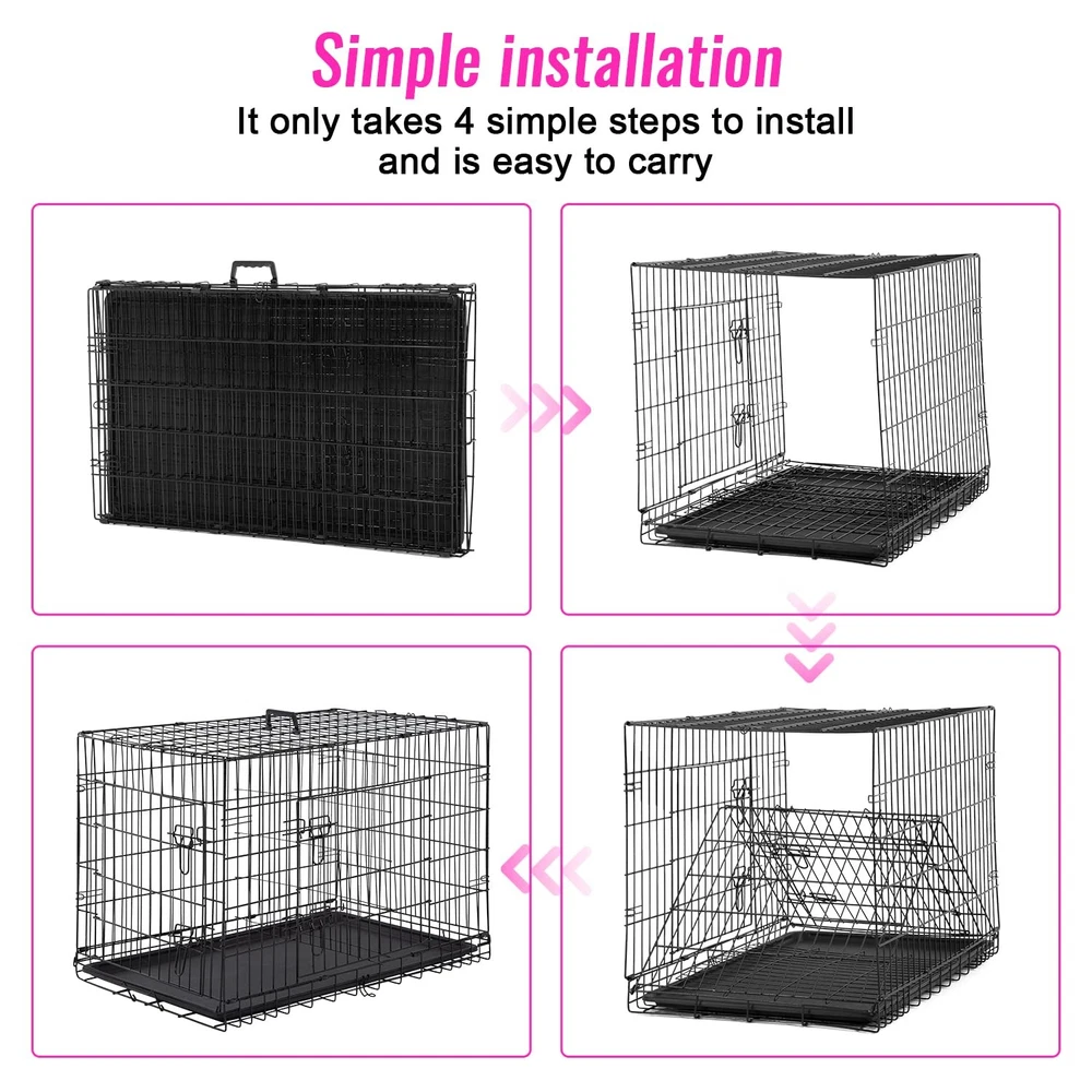 🐕【Dog Crate Made of Durable Materials】: the dog crate Made of high Tensile-Strength wire gauge.The dog cage ideal for training and transporting well-behaved pets. Pet crate epoxy coating finish extends the life of the crate and provides resistance against rust, corrosion, and fading, even in the most extreme climates. Dog crate dog cage pet crate. 🐕【Designed to Safe and Comfortable】: The pet cage have two large doors, one on the front and one on the side, are easy to open, close.Heavy duty securely lock with dual latches, providing a safe and secure environment for your pet.The dog cage designed to keep animals safe and comfortable. Pet kennel wire dog crate animal cage. 🐕【Easy Assembly】: This dog cage does not require any tool assembly, dog cage can be deployed directly. It only takes a few minutes. The pet cage divider can separate two pets in two spaces.Dog crate pet cage dog cage with divider. 🐕【Easy to Clean】: the dog cage includes a durable leak-proof ABS Composite tray that will not stain, warp, corrode or retain pet odors. The pet cage bottom pan features an integrated Lip around the perimeter, to contain any mess from spilling outside the dog kennel. Dog cage with tray pet crate metal dog cage. 🐕【Folds Easy to Storage and Portable】: this pet cage with handle is ideal for travel.Fold-and-carry construction dog crate with collapsible design that folds into a package less than 3" Thick. Features a removable carrying handle that can be mounted on any side of the crate as needed. You can easily carry or storage This dog cage.Dog crate with handle metal dog cage dog kennel.